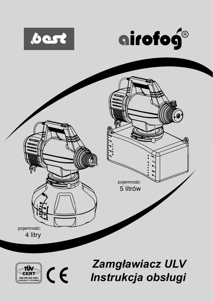 pojemność: 5 litrów pojemność: 4 litry Zamgławiacz ULV Instrukcja obsługi 1 1. Informacje ogólne Dziękujemy za zakup wysokiej jakości wyrobu AIROFOG. Życzymy Państwu sukcesów w jego stosowaniu i wierzymy, że będą Państwo z niego w pełni zadowoleni. Niniejsza instrukcja zawiera wszelkie informacje potrzebne do posługiwania się urządzeniem. Na informacje te składają się rysunki rozstrzelone, opis sprawdzania urządzenia, jego uruchamiania, obsługi, konserwacji, czyszczenia, rozwiązywania problemów itd., a także środków ostrożności jakie należy zachować przez cały okres użytkowania urządzenia. Zamgławiacz ULV (ang. ultra-low volume: ultra mała objętość) spełnia wymagania zgodności CE z unijną Dyrektywą kompatybilności elektromagnetycznej i normami ISO EN55014-1, EN55014-2, EN61000-3-2, EN61000-3-3. Wszystkie dane i informacje zamieszczone w niniejszej instrukcji podane są zgodnie z naszą najlepszą wiedzą i doświadczeniem. Ciągły postęp techniczny i dążenie do udoskonalania naszych wyrobów może być przyczyną zmian w instrukcji wprowadzanych bez uprzedzenia. W sprawie wprowadzanych zmian technicznych prosimy o kontaktowanie się z nami. Znaczenie stosowanych symboli: Przeczytaj uważnie instrukcję obsługi Oznaczenie CE wskazuje, że urządzenie spełnia wymagania dyrektyw UE Ogólne ostrzeżenie, niebezpieczeństwo lub możliwość uszkodzenia urządzenia. Należy zwrócić szczególną uwagę na tekst zamieszczony przy tym znaku. Wszelkie inne istotne uwagi Niebezpieczeństwo porażenia prądem. Należy ściśle stosować się do instrukcji Serwis Zamgławiacz ULV – Instrukcja obsługi 2 2. Parametry techniczne Model: U260 U120 Silnik elektryczny: 220 - 240 V, 50 / 60 Hz, 800 W 110 - 120 V, 50 / 60 Hz, 700 W Zbiornik cieczy: wykonany z polietylenu, odporny na promienie UV – poj. 4 litry, kształt okrągły / albo – poj. 5 litrów, kształt graniasty Wydajność: ok. 35 - 200 ml/min, sześciopozycyjna regulacja dozowania cieczy Pasek naramienny: pasek pojedynczy do noszenia Akcesoria: wąż 50 cm pierścień dyfuzyjny Masa netto: 3 kg Masa brutto: 4,1 kg Wymiary: (4-litrowy) Ø 25 x wys. 39 cm (5-litrowy) dług. 30 x szer. 17,2 x wys. 40 cm Wymiary opakowania: dług. 36 x szer. 32 x wys. 44 cm ZPUH „BEST - PEST” sp. j. 3 3. Podstawowe cechy Efektywne działanie zamgławiacza ULV oparte jest na metodzie ULV (ultra małej objętości). Wydajny silnik elektryczny równomiernie rozprasza w przestrzeni drobne kropelki. Kropelki unoszą się w powietrzu przez dostatecznie długi czas. Sześciopozycyjne pokrętło regulatora dozowania cieczy umożliwia w zależności od lepkości cieczy odpowiednie ustawienie wydajności rozpylania cieczy w zakresie od wartości minimalnej około 35 ml/min do wartości maksymalnej 200 ml/min. 1. Wyłącznik 2. Pokrętło regulacji przepływu 3. Kabel zasilający 4. Zbiornik cieczy 5. Pierścień mocujący Zamgławiacz ULV – Instrukcja obsługi 4 4. Instrukcja bezpieczeństwa Przed rozpoczęciem użytkowania urządzenia prosimy przeczytać uważnie i ze zrozumieniem niniejszą instrukcję obsługi. • Zachowaj tę instrukcję. W przypadku zmiany właściciela urządzenia, przekaż instrukcję nowemu właścicielowi. • Przed użyciem urządzenia użytkownik musi zapoznać się z wszystkimi środkami ostrożności. • Dla ochrony przed hałasem zaleca się używanie środków ochrony słuchu. • Należy przestrzegać wskazówek dostawców środków chemicznych w zakresie stosowanych stężeń roztworów i środków ostrożności. • Podczas rozpylania niebezpiecznych środków chemicznych lub cząstek zawieszonych w powietrzu należy stosować maskę ochronną. • Podczas rozpylania należy stosować odpowiedni sprzęt ochronny, środki ochrony dróg oddechowych i rękawice ochronne. • Urządzenie należy przechowywać w miejscu suchym, z dala od źródeł ciepła. • Gdy urządzenie nie jest używane, należy odłączyć je od gniazdka zasilania. • Urządzenie należy przechowywać poza zasięgiem dzieci i osób nieświadomych zagrożeń. • Aby uniknąć niebezpieczeństwa pożaru i wybuchu nie należy rozpylać cieczy palnych, zwłaszcza w zamkniętych pomieszczeniach. • Nie rozpylać w pobliżu otwartego ognia. • Nie używać urządzenia mając mokre ręce lub stopy albo będąc bez obuwia. • Chronić kabel zasilający przed ciepłem, kontaktem z olejami, ostrymi krawędziami i szorstkimi powierzchniami. ZPUH „BEST - PEST” sp. j. 5 • Nie używać nadmiernej siły w stosunku do wtyczki ani nie dokonywać zmian we wtyczce. • Nie używać kabla rozciętego albo postrzępionego. • Urządzenie używać wyłącznie do celów do których jest przeznaczone. • Nie pozostawiać włączonego urządzenia bez dozoru. • Unikać wdychania wytworzonej mgły i dbać o to by powietrze zasysane przez urządzenie było możliwie jak najsuchsze. • Nie dokonywać czynności konserwacyjnych na urządzeniu gdy jest ono podłączone do sieci. • Naprawę urządzenia powierzać osobom przeszkolonym i upoważnionym do obsługi urządzenia. • Upewnić się, że napięcie zasilania jest takie jak wskazane i że wtyczka jest odpowiednia. • Zawsze używać atestowanej półmaski odpowiedniej do wielkości cząstek i rodzaju rozpylanej substancji. Zamgławiacz ULV – Instrukcja obsługi 6 5. Uruchamianie i zatrzymywanie urządzenia Urządzenie dostarczane jest w opakowaniu kartonowym. Po wyjęciu urządzenia z opakowania sprawdzić czy nie jest uszkodzone. Urządzenie należy zasilać ze źródła o parametrach zgodnych z podanymi na tabliczce identyfikacyjnej. Jeśli znamionowe napięcie i częstotliwość będą poza wskazanym zakresem, to urządzenie może ulec poważnemu uszkodzeniu albo działać nieprawidłowo. ZPUH „BEST - PEST” sp. j. 7 Użytkowanie urządzenia: • Sporządzić roztwór do rozpylania w odpowiedniej ilości. Przed nalaniem roztworu upewnić się, że zbi