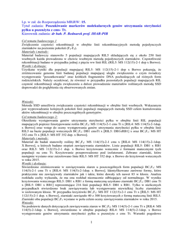 Lp. w zał. do Rozporządzenia MRiRW: 15. Tytuł zadania: Poszukiwanie markerów molekularnych genów utrzymania sterylności pyłku u pszenżyta z cms- Tt. Kierownik zadania: dr hab. P. Bednarek prof. IHAR-PIB Cel tematu badawczego 1 Zwiększenie częstości rekombinacji w obrębie linii rekombinacyjnych metodą pojedynczych ziarniaków na poziomie pokoleń (F4-F8). Materiały i metody: Materiał badawczy stanowiło 5 populacji mapujących RIL5 składających się z około 250 linii wsobnych każda prowadzona w chowie wsobnym metodą pojedynczych ziarniaków. Częstotliwość rekombinacji badano w przypadku jednej z pięciu ww linii RIL (RIL5: MS 112(15)-2-1 dop x Borwo). Wyniki i dyskusja: Uzyskane wyniki dla populacji mapującej RIL5: MS 112(15)-2-1 dop x Borwo pokazują, że zróżnicowanie genomu linii badanej populacji mapującej uległo zwiększeniu o czym świadczy występowanie "poszatkowania" oraz krótkich fragmentów DNA pochodzących od różnych form rodzicielskich. Należy oczekiwać, że również w przypadku pozostałych populacji mapujących RIL częstość rekombinacji uległa zwiększeniu a dalsze prowadzenie materiałów roślinnych metodą SSD doprowadzi do pogłębienia się obserwowanych zmian. Wnioski: Metoda SSD umożliwia zwiększanie częstości rekombinacji w obrębie linii wsobnych. Wskazanym jest wyprowadzanie kolejnych pokoleń linii populacji mapujących metodą SSD celem kumulowania aktów rekombinacji w obrębie poszczególnych genotypów. Cel tematu badawczego 2: Określenie występowania genów utrzymania sterylności pyłku w obrębie linii RIL populacji mapujących poprzez fenotypowanie roślin BC1F4: MS 114(5)-2-1 cms Tt x [RIL4: MS 114(5)-2-1dop. x Borwo] oraz wstęp do oceny występowania genów utrzymania sterylności pyłku w obrębie linii RIL5 na bazie populacji wstecznych BC1F5: DB1 cmsTt x [RIL5: DB1xRB1] x oraz BC1F5: MS HT 352 cms Tt x [RIL5: MS HT 352 dop. x Borwo]. Materiały i metody: Materiał do badań stanowiły rośliny BC1F4: MS 114(15)-2-1 cms x [RIL4: MS 114(15)-2-1dop. X Borwo], u których badano stopień zawiązywania ziarniaków. Linie populacji RIL5: DB1 x RB1 oraz RIL5: MS 112(15)-2-1 dop. x Borwo krzyżowano wstecznie z formami matecznymi tych populacji na cms Tt. Krzyżowanie przeprowadzono pod izolatorami. Zebrano ziarniaki, które następnie wysiano oraz zaizolowano linie RIL5: MS HT 352 dop. x Borwo do krzyżowań wstecznych w roku 2015. Wyniki i dyskusja: Stwierdzono zróżnicowanie w zawiązywaniu ziaren u poszczególnych form populacji BC1F4: MS 114(5)-2-1 cms Tt x [RIL4: MS 114(5)-2-1dop. x Borwo]. Identyfikowano zarówno formy, które praktycznie nie zawiązywały ziarniaków jak i takie, które dawały ich nawet 83 w kłosie. Analiza rozkładu cechy wykazała, że ma ona rozkład nieznacznie odbiegający od normalnego. W wyniku krzyżowania wstecznego RIL5: DB1 x RB1 z formą mateczną uzyskano ziarniaki BC1F5: DB1 cms Tt x [RIL5: DB1 x RB1] reprezentujące 216 linii populacji RIL5: DB1 x RB1. Tylko w nielicznych przypadkach stwierdzono brak zawiązywania lub występowanie niewielkiej liczby ziarniaków w izolowanym kłosie. W przypadku krzyżówki BC1F5: MS HT 112(15)-2-1 cms Tt x [RIL5: MS HT 112(15)-2-1 dop. x Borwo], ziarniaki zawiązało 40 z 300 krzyżowanych z formą mateczną linii RIL5. Ziarniaki obu populacji BC1F5 wysiano w polu celem oceny zawiązywania ziarniaków w roku 2015. Wnioski: Na podstawie danych dotyczących zawiązywania ziaren w BC1F4: MS 114(5)-2-1 cms Tt x [RIL4: MS 114(5)-2-1dop. x Borwo], stwierdzono w obrębie populacji RIL4: MS 114(5)-2-1dop. x Borwo występowanie genów utrzymania sterylności pyłku u pszenżyta z cms Tt. Warunki pogodowe 1 uniemożliwiły uzyskanie odpowiedniej reprezentacji ziarniaków BC1F5: MS 112(15)-2-1 cms Tt x [MS 112(15)-2-1dop. x Borwo] i koniecznym jest wykonanie większej ilości krzyżowań. W przypadku pozostałych krzyżowań wstecznych realizowanych dla BC1F5: DB1 cms Tt x [DB1xRB1], zawiązywanie ziarniaków przebiegło pomyślnie. Cel tematu badawczego 3: Genotypowanie linii rekombinacyjnych (konkretnie RIL4: MS 114(5)-2-1 x Borwo oraz RIL5: MS 112(15)-2-1 dop x Borwo) populacji mapujących za pomocą markerów DArTseq. Materiały i metody: Materiałem badawczym były preparaty DNA około 200 linii RIL dwóch populacji mapujących RIL4: MS 114(5)-2-1 x Borwo oraz RIL5: MS 112(15)-2-1 dop x Borwo prowadzonych na normalnej cytoplazmie. Analiza molekularna została wykonana w firmie Diversity Arrays Technology P/L w Australii. Wyniki i dyskusja: W wyniku genotypowania populacji RIL4: MS 114(5)-2-1 x Borwo oraz RIL5: MS 112(15)-2-1 dop x Borwo uzyskano odpowiednio 52000 i 56000 markerów (DArTseq i silico DArT) w postaci macierzy z segregacjami. Przy czym markerów DArTseq otrzymano około 10 000 i 12 000 dla populacji RIL4 i RIL5. Metoda DArTseq umożliwiła uzyskanie dużej liczby markerów, która wielokrotnie przekraczała możliwości stosowanych wcześniej markerów DArT czy SSR. W porównaniu do markerów GBS markery DArTseq charakteryzowały się zdecydowanie niższym stopniem brakujących danych. Wnioski: Profilowanie populacji RIL4: MS 114(5)-2-1 x Borwo umożliwiło uzyskanie ok 10000 markerów DArTseq o pożądanej segregacji i dopuszczalnej liczbie brakujących danych użytecznych do mapowania genetycznego. Profilowanie populacji RIL5: MS 112(15)-2-1 dop x Borwo umożliwiło uzyskanie 12000 markerów DArTseq użytecznych do mapowania genetycznego. Cel zadania: Identyfikowanie QTLi warunkujących utrzymanie sterylności pyłku z wykorzystaniem mapowania kompozytowego w oparciu o mapowanie genetyczne i badaną cechę oraz mapowanie asocjacyjne. Materiały i metody: Mapy genetyczne opracowano z wykorzystaniem markerów DArTseq dla populacji RIL5: MS 112(15)-2-1dop. x Borwo oraz DArTseq i GBS dla populacji RIL4: MS 114(5)-2-1dop. x Borwo z wykorzystaniem programu MultiPointUltraDense (demo). Dla każdej z grup niezrównoważenie sprzężeń 