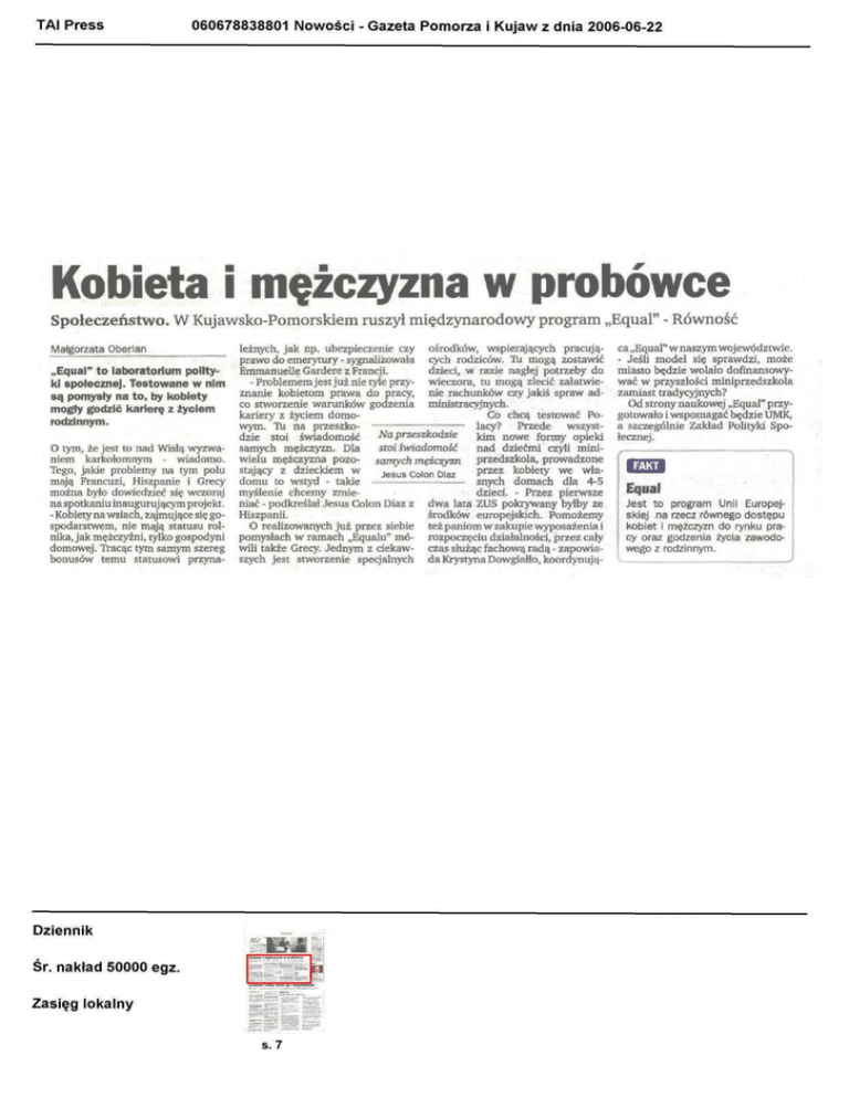 TAI Press 060678838801 Nowości - Gazeta Pomorza i Kujaw z dnia 2006-06-22 Kobieta i mężczyzna w probówce Społeczeństwo. W Kujawsko-Pomorskiem ruszył międzynarodowy program „Eąual" - Równość Małgorzata Oberlan „Eąual" to laboratorium polityki społecznej. Testowane w nim są pomysły na to, by kobiety mogły godzić karierę z życiem rodzinnym. O tym, że jest to nad Wisłą wyzwaniem karkołomnym - wiadomo. Tego, jakie problemy na tym polu mają Francuzi, Hiszpanie i Grecy można było dowiedzieć się wczoraj na spotkaniu inaugurującym projekt. - Kobiety na wsiach, zajmujące się gospodarstwem, nie mają statusu rolnika, jak mężczyźni, tylko gospodyni domowej. Tracąc tym samym szereg bonusów temu statusowi przyna- leżnych, jak np. ubezpieczenie czy ośrodków, wspierających pracująprawo do emerytury - sygnalizowała cych rodziców. Tu mogą zostawić dzieci, w razie nagłej potrzeby do Emmanuelle Gardere z Francji. - Problemem jest już nie tyle przy- wieczora, tu mogą zlecić załatwieznanie kobietom prawa do pracy, nie rachunków czy jakiś spraw adco stworzenie warunków godzenia ministracyjnych. Co chcą testować Pokariery z życiem domolacy? Przede wszystwym. Tu na przeszkoNa przeszkodzie kim nowe formy opieki dzie stoi świadomość stoi świadomość nad dziećmi czyli minisamych mężczyzn. Dla wielu mężczyzna pozo- samych mężczyzn przedszkola, prowadzone stający z dzieckiem w przez kobiety we wła, Jesus Colon Diaz domu to wstyd - takie snych domach dla 4-5 myślenie chcemy zmiedzieci. - Przez pierwsze niać - podkreślał Jesus Colon Diaz z dwa lata ZUS pokrywany byłby ze Hiszpanii. środków europejskich. Pomożemy O realizowanych już przez siebie też paniom w zakupie wyposażenia i pomysłach w ramach „Eąualu" mó- rozpoczęciu działalności, przez cały wili także Grecy. Jednym z ciekaw- czas służąc fachową radą - zapowiaszych jest stworzenie specjalnych da Krystyna Dowgialło, koordynują- Dziennik Śr. nakład 50000 egz. Zasięg lokalny s. 7 ca „Eąual" w naszym województwie. - Jeśli model się sprawdzi, może miasto będzie wolało dofinansowywać w przyszłości miniprzedszkola zamiast tradycyjnych? Od strony naukowej „Eąual" przygotowało i wspomagać będzie UMK, a szczególnie Zakład Polityki Społecznej. Equal Jest to program Unii Europejskiej na rzecz równego dostępu kobiet i mężczyzn do rynku pracy oraz godzenia życia zawodowego z rodzinnym.