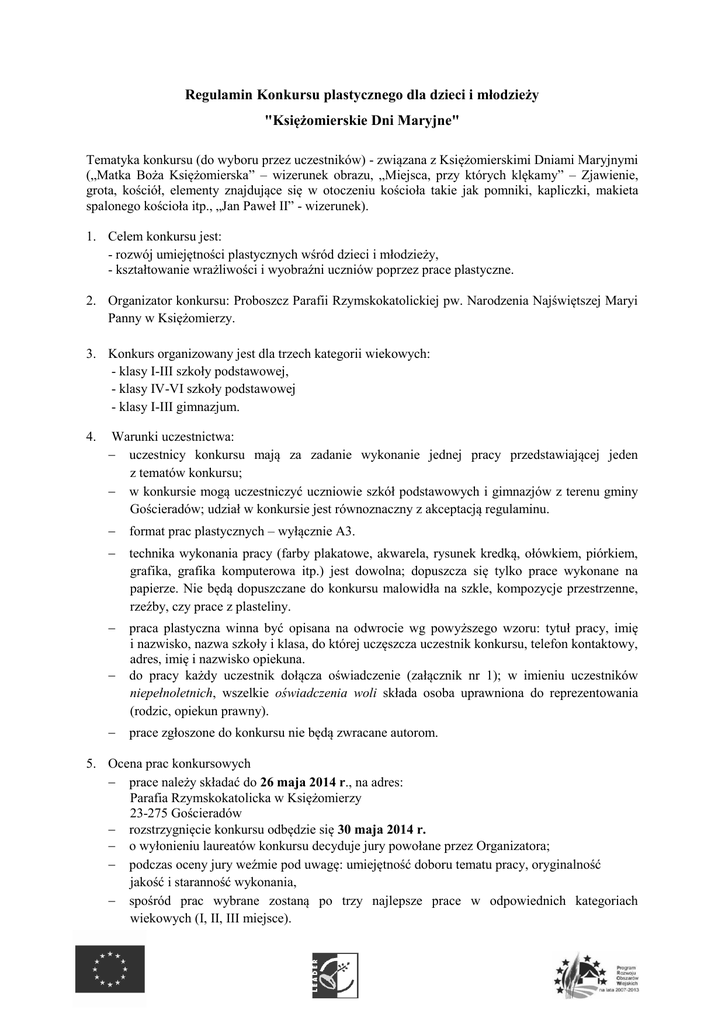 Regulamin Konkursu plastycznego dla dzieci i młodzieży "Księżomierskie Dni Maryjne" Tematyka konkursu (do wyboru przez uczestników) - związana z Księżomierskimi Dniami Maryjnymi („Matka Boża Księżomierska” – wizerunek obrazu, „Miejsca, przy których klękamy” – Zjawienie, grota, kościół, elementy znajdujące się w otoczeniu kościoła takie jak pomniki, kapliczki, makieta spalonego kościoła itp., „Jan Paweł II” - wizerunek). 1. Celem konkursu jest: - rozwój umiejętności plastycznych wśród dzieci i młodzieży, - kształtowanie wrażliwości i wyobraźni uczniów poprzez prace plastyczne. 2. Organizator konkursu: Proboszcz Parafii Rzymskokatolickiej pw. Narodzenia Najświętszej Maryi Panny w Księżomierzy. 3. Konkurs organizowany jest dla trzech kategorii wiekowych: - klasy I-III szkoły podstawowej, - klasy IV-VI szkoły podstawowej - klasy I-III gimnazjum. 4. Warunki uczestnictwa: uczestnicy konkursu mają za zadanie wykonanie jednej pracy przedstawiającej jeden z tematów konkursu; w konkursie mogą uczestniczyć uczniowie szkół podstawowych i gimnazjów z terenu gminy Gościeradów; udział w konkursie jest równoznaczny z akceptacją regulaminu. format prac plastycznych – wyłącznie A3. technika wykonania pracy (farby plakatowe, akwarela, rysunek kredką, ołówkiem, piórkiem, grafika, grafika komputerowa itp.) jest dowolna; dopuszcza się tylko prace wykonane na papierze. Nie będą dopuszczane do konkursu malowidła na szkle, kompozycje przestrzenne, rzeźby, czy prace z plasteliny. praca plastyczna winna być opisana na odwrocie wg powyższego wzoru: tytuł pracy, imię i nazwisko, nazwa szkoły i klasa, do której uczęszcza uczestnik konkursu, telefon kontaktowy, adres, imię i nazwisko opiekuna. do pracy każdy uczestnik dołącza oświadczenie (załącznik nr 1); w imieniu uczestników niepełnoletnich, wszelkie oświadczenia woli składa osoba uprawniona do reprezentowania (rodzic, opiekun prawny). prace zgłoszone do konkursu nie będą zwracane autorom. 5. Ocena prac konkursowych prace należy składać do 26 maja 2014 r., na adres: Parafia Rzymskokatolicka w Księżomierzy 23-275 Gościeradów rozstrzygnięcie konkursu odbędzie się 30 maja 2014 r. o wyłonieniu laureatów konkursu decyduje jury powołane przez Organizatora; podczas oceny jury weźmie pod uwagę: umiejętność doboru tematu pracy, oryginalność jakość i staranność wykonania, spośród prac wybrane zostaną po trzy najlepsze prace w odpowiednich kategoriach wiekowych (I, II, III miejsce). 6. Ogłoszenie wyników konkursu wyniki konkursu będą ogłoszone w dniu 3 czerwca 2014 r. na stronie internetowej parafii; osoby wyróżnione zostaną powiadomione telefonicznie lub mailowo w terminie do dnia 10 czerwca 2014 r. wernisaż wystawy pokonkursowej i uroczyste wręczenie nagród przewidziane jest podczas Przeglądu Pieśni Maryjnej w dniu 14 czerwca 2014 r.; wybrane przez jury prace umieszczone zostaną na tablicach informacyjnych przy wejściu do Sanktuarium, a także w innych ustalonych przez Organizatora formach (np. strony internetowe). 7. Uwagi dodatkowe: prace niezgodne z regulaminem nie będą brane pod uwagę; rozstrzygnięcie jury jest ostateczne (od werdyktu nie przysługuje odwołanie); osoby nagrodzone i wyróżnione zostaną powiadomione osobiście o miejscu i godzinie uroczystego rozdania nagród; wszelkie sprawy nie uwzględnione w regulaminie rozstrzyga Organizator; Organizator zastrzega sobie prawo do zmiany regulaminu w dowolnym czasie. Załącznik nr 1 ........................................................................ Miejscowość, data Oświadczenie Oświadczam, że: jestem autorem/autorką załączonej pracy i posiadam do nich pełne majątkowe prawa autorskie, przyjmuję warunki regulaminu konkursu, wyrażam zgodę na przetwarzanie swoich danych osobowych zgodnie z ustawą o Ochronie Danych Osobowych ( Dz.U.Nr.133 pozycja 883), wyrażam zgodę na nieodpłatne wykorzystywanie przez Organizatora Konkursu nadesłanych prac w dowolnym czasie i formie dla celów promocyjnych Organizatora. .................................................................. Podpis autora prac/ opiekuna prawnego
