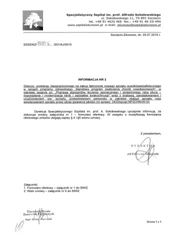 Specjalistyczny Szpital im. prof. Alfreda Soko łowskiego ul. Sokołowskiego 11, 70-891 Szczecin tel. +48 91 4620 466 fax.: +48 91 46-20-494 www.szpitalzdunowo.pl e-mail: [email protected] Szczecin-Zdunowo, dn. 03.07.2015 r. /201/AJ/2015 SSSZ/KZ/ INFORMACJA NR 2 Dotyczy: przetarqu nieograniczoneqo na zakup fabrycznie noweqo sprzetu wysokospecjalistyczneqo w ramach proqramu zdrowotneqo „Narodowy program zwalczania chorób nowotworowych", w zakresie zadania pn. „Poprawa standardów leczenia operacyjneqo i skolarzonego raka p łuca — doposażenie i modernizacja klinik i oddzia łów torakochirurgii" wraz z dostaw ą zainstalowaniem i uruchomieniem ww. sprzetu, przeszkoleniem personelu w zakresie obs ługi sprzętu oraz serwisowaniem sprzetu przez okres gwarancji jako ści (nr sprawy: 24/D/sprz ęt NPZCHN/2015) Dyrekcja Specjalistycznego Szpitala im. prof. A. Soko łowskiego uprzejmie informuje, że dokonuje zmiany załącznika nr 1 — formularz ofertowy. W zwi ązku z modyfikacj ą formularza ofertowego zmianie ulegaj ą zapisy § 4 i §5 wzoru umowy. Z poważaniem, Załączniki: 1. Formularz ofertowy — za łącznik nr 1 do SIWZ 2. Wzór umowy — za łącznik nr 5 do SIWZ Kier ow Z arn ć v mgr Anwi. Lza łu We ,nych ak Strona 1 z 1 Załącznik nr 1 do Informacji nr 2 z dn. 03.07.2015 r. Nr sprawy: 24/D/sprzęt NPZCHN/2015 Załącznik nr 1 do SIWZ Pieczęć wykonawcy i nr tel./faxu oraz adres poczty elektronicznej FORMULARZ OFERTOWY My, niżej podpisani: działając w imieniu i na rzecz Wykonawcy (Zarejestrowana nazwa Wykonawcy) (Numer telefonu/ numer faxu/ oraz adres poczty elektronicznej) przystępuj ąc do postępowania o udzielenie zamówienia publicznego na: zakup fabrycznie nowego sprz ętu wysokospecjalistycznego w ramach programu zdrowotnego „Narodowy program zwalczania chorób nowotworowych", w zakresie zadania pn. „Poprawa standardów leczenia operacyjnego i skojarzonego raka p łuca — doposatenie i modernizacja klinik i oddzia łów torakochirurgii" wraz z dostawą, zainstalowaniem i uruchomieniem ww. sprz ętu, przeszkoleniem personelu w zakresie obs ługi sprzętu oraz serwisowaniem sprz ętu przez okres gwarancji jako ści w zakresie wymienionym w za łącznikach cenowych do formularza ofertowego: składamy niniejsz ą ofertę na wykonanie zamówienia i: 1. Oświadczamy, że zapoznali śmy si ę z wymaganiami Zamawiaj ącego, dotyczącymi przedmiotu zamówienia, zamieszczonymi w Specyfikacji Istotnych Warunków Zamówienia wraz z załącznikami i nie wnosimy do nich żadnych zastrzeże ń . 2. Oferujemy wykonanie zamówienia dla Części I przedmiotu zamówienia - za ł. nr 1/1 obejmuj ący zakup sprz ętu pn. „EBUS — Echoendoskop z cyfrow ą głowicą sektorową, Procesor USG, Procesor wideo do echoendoskopu, wózek do zestawu, monitor do zestawu (medyczny) 19 cali" — 1 kpl.- wraz z dostawą, zainstalowaniem sprz ętu, serwisowaniem sprzętu przez okres gwarancji jako ści i przeszkoleniem personelu w zakresie obsługi sprzętu*) Strona 1 z 9 Załącznik nr 1 do Informacji nr 2 z dn. 03.07.2015 r. Nazwa własna wyrobu medycznego . Rok produkcji: Wytwórca (nazwa, siedziba): za cen ę brutto . (słownie brutto PLN: PLN ) w tym: ), , (słownie: 1) za sprzęt specjalistyczny - brutto PLN: 2) za czynności zwi ązane z dostawą, zainstalowaniem sprz ętu i przeszkoleniem ) PLN (słownie . personelu w zakresie obsługi sprzętu - brutto ści przez okres gwarancji jako ętu z serwisowaniem sprz związane za czynności 3) ) PLN (słownie: brutto zgodnie z załącznikiem cenowym do formularza ofertowego odpowiednio dla danej części przedmiotu zamówienia. 3. Oferujemy wykonanie zamówienia dla CZęś Ci ll przedmiotu zamówienia - zał. nr 1/2 obejmuj ący zakup sprzę tu pn. „Videomediastinoskop kompletny" — 1 kpl. - wraz z dostawą, zainstalowaniem sprz ętu, serwisowaniem sprzę tu przez okres gwarancji jako ści i przeszkoleniem personelu w zakresie obs ługi sprzętu*) Nazwa własna wyrobu medycznego: Rok produkcji: Wytwórca (nazwa, siedziba): za cene brutto . (słownie brutto PLN . PLN ) w tym: ), , (słownie: 1) za sprzęt specjalistyczny - brutto PLN . 2) za czynno ści zwi ązane z dostawą, zainstalowaniem sprz ętu i przeszkoleniem ) PLN (słownie: personelu w zakresie obs ługi sprzętu - brutto 3) za czynno ści zwi ązane z serwisowaniem sprz ętu przez okres gwarancji jako ści ) PLN (słownie: brutto zgodnie z załącznikiem cenowym do formularza ofertowego odpowiednio dla danej częś ci przedmiotu zamówienia. 4. Oferujemy wykonanie zamówienia dla CZęŚCI Ill przedmiotu zamówienia - zał. nr 1/3 obejmuj ący zakup sprzętu pn. „Videotorakoskop - kompletny z oprogramowaniem" — 1 kpl. - wraz z dostawą zainstalowaniem sprzę tu, serwisowaniem sprz ętu przez okres gwarancji jakoś ci i przeszkoleniem personelu w zakresie obsł ugi sprzętu*) Nazwa własna wyrobu medycznego: Rok produkcji: Wytwórca (nazwa, siedziba): Strona 2 z 9 Załącznik nr 1 do Informacji nr 2 z dn. 03.07.2015 r. za cene brutto . (słownie brutto PLN . PLN w tym: ), , (słownie: 1) za sprzęt specjalistyczny - brutto PLN . 2) za czynności zwi ązane z dostawą, zainstalowaniem sprz ętu i przeszkoleniem ) PLN (słownie: personelu w zakresie obsługi sprzętu - brutto przez okres gwarancji jako ści ętu z serwisowaniem sprz zwi ązane 3) za czynno ści ) PLN (słownie: brutto zgodnie z załącznikiem cenowym do formularza ofertowego odpowiednio dla danej części przedmiotu zamówienia. 5. Oferujemy wykonanie zamówienia dla CZęś Ci IV przedmiotu zamówienia - zał. nr 1/4 obejmuj ący zakup sprz ętu pn. „Bronchofiberoskop z autofluorescencj ą" — 1 kpl. - wraz z dostawą, zainstalowaniem sprzętu, serwisowaniem sprzętu przez okres gwarancji jako ści i przeszkoleniem personelu w zakresie obs ługi sprzętu*) Nazwa własna wyrobu medycznego . Rok produkcji: Wytwórca (nazwa, siedziba): za cen ę brutto . (słownie brutto PLN: PLN w tym: , (słownie . )