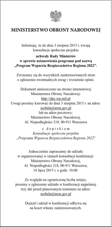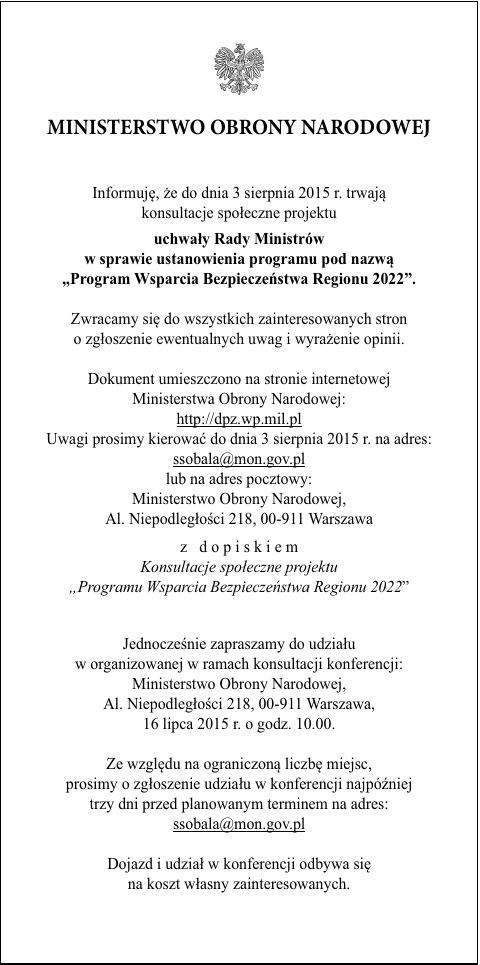 MINISTERSTWO OBRONY NARODOWEJ Informuję, że do dnia 3 sierpnia 2015 r. trwają konsultacje społeczne projektu uchwały Rady Ministrów w sprawie ustanowienia programu pod nazwą „Program Wsparcia Bezpieczeństwa Regionu 2022”. Zwracamy się do wszystkich zainteresowanych stron o zgłoszenie ewentualnych uwag i wyrażenie opinii. Dokument umieszczono na stronie internetowej Ministerstwa Obrony Narodowej: http://dpz.wp.mil.pl Uwagi prosimy kierować do dnia 3 sierpnia 2015 r. na adres: [email protected] lub na adres pocztowy: Ministerstwo Obrony Narodowej, Al. Niepodległości 218, 00-911 Warszawa z dopiskiem Konsultacje społeczne projektu „Programu Wsparcia Bezpieczeństwa Regionu 2022” Jednocześnie zapraszamy do udziału w organizowanej w ramach konsultacji konferencji: Ministerstwo Obrony Narodowej, Al. Niepodległości 218, 00-911 Warszawa, 16 lipca 2015 r. o godz. 10.00. Ze względu na ograniczoną liczbę miejsc, prosimy o zgłoszenie udziału w konferencji najpóźniej trzy dni przed planowanym terminem na adres: [email protected] Dojazd i udział w konferencji odbywa się na koszt własny zainteresowanych.