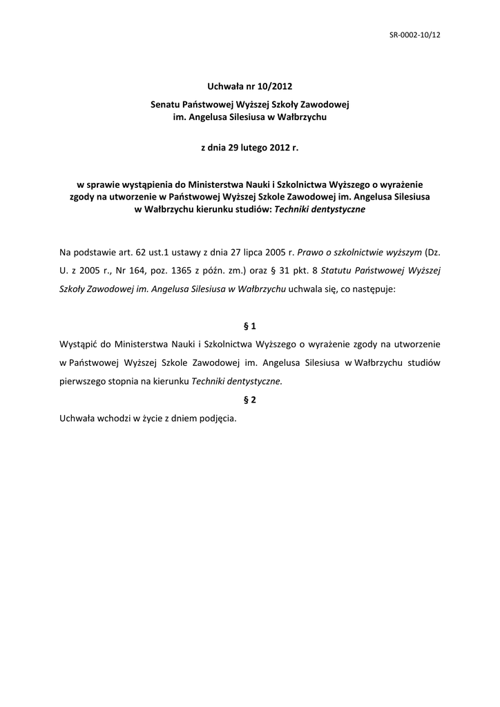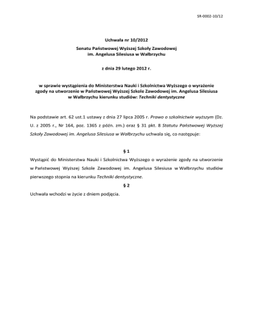 SR-0002-10/12 Uchwała nr 10/2012 Senatu Państwowej Wyższej Szkoły Zawodowej im. Angelusa Silesiusa w Wałbrzychu z dnia 29 lutego 2012 r. w sprawie wystąpienia do Ministerstwa Nauki i Szkolnictwa Wyższego o wyrażenie zgody na utworzenie w Państwowej Wyższej Szkole Zawodowej im. Angelusa Silesiusa w Wałbrzychu kierunku studiów: Techniki dentystyczne Na podstawie art. 62 ust.1 ustawy z dnia 27 lipca 2005 r. Prawo o szkolnictwie wyższym (Dz. U. z 2005 r., Nr 164, poz. 1365 z późn. zm.) oraz § 31 pkt. 8 Statutu Państwowej Wyższej Szkoły Zawodowej im. Angelusa Silesiusa w Wałbrzychu uchwala się, co następuje: §1 Wystąpić do Ministerstwa Nauki i Szkolnictwa Wyższego o wyrażenie zgody na utworzenie w Państwowej Wyższej Szkole Zawodowej im. Angelusa Silesiusa w Wałbrzychu studiów pierwszego stopnia na kierunku Techniki dentystyczne. §2 Uchwała wchodzi w życie z dniem podjęcia.