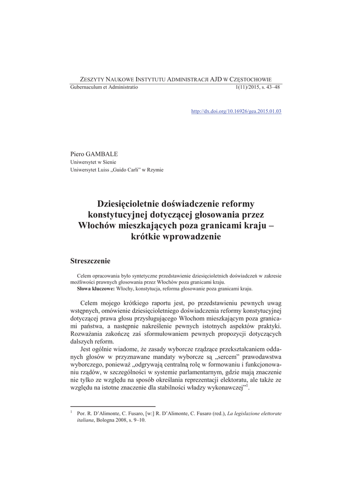 ZESZYTY NAUKOWE INSTYTUTU ADMINISTRACJI AJD W CZĘSTOCHOWIE Gubernaculum et Administratio 1(11)/2015, s. 43–48 http://dx.doi.org/10.16926/gea.2015.01.03 Piero GAMBALE Uniwersytet w Sienie Uniwersytet Luiss „Guido Carli” w Rzymie Dziesięcioletnie doświadczenie reformy konstytucyjnej dotyczącej głosowania przez Włochów mieszkających poza granicami kraju – krótkie wprowadzenie Streszczenie Celem opracowania było syntetyczne przedstawienie dziesięcioletnich doświadczeń w zakresie możliwości prawnych głosowania przez Włochów poza granicami kraju. Słowa kluczowe: Włochy, konstytucja, reforma głosowanie poza granicami kraju. Celem mojego krótkiego raportu jest, po przedstawieniu pewnych uwag wstępnych, omówienie dziesięcioletniego doświadczenia reformy konstytucyjnej dotyczącej prawa głosu przysługującego Włochom mieszkającym poza granicami państwa, a następnie nakreślenie pewnych istotnych aspektów praktyki. Rozważania zakończę zaś sformułowaniem pewnych propozycji dotyczących dalszych reform. Jest ogólnie wiadome, że zasady wyborcze rządzące przekształcaniem oddanych głosów w przyznawane mandaty wyborcze są „sercem” prawodawstwa wyborczego, ponieważ „odgrywają centralną rolę w formowaniu i funkcjonowaniu rządów, w szczególności w systemie parlamentarnym, gdzie mają znaczenie nie tylko ze względu na sposób określania reprezentacji elektoratu, ale także ze względu na istotne znaczenie dla stabilności władzy wykonawczej”1. 1 Por. R. D’Alimonte, C. Fusaro, [w:] R. D’Alimonte, C. Fusaro (red.), La legislazione elettorate italiana, Bologna 2008, s. 9–10. 44 Piero GAMBALE Pomimo tego, niektóre raporty międzynarodowe i szereg studiów poświęconych temu tematowi zwracają uwagę na fakt, że nawet w zaawansowanych demokracjach należy brać pod rozwagę pewne elementy „spraw wyborczych”, które nie wiążą się bezpośrednio z systemem wyborczym (tak, jak dzieje się to przykładowo w przypadku postępowań i procesów wyborczych), ale mają istotne znaczenie dla przebiegu procesu wyborczego – przykładowo zaliczyć tu można finansowanie partii politycznych ze źródeł publicznych i prywatnych oraz zasady prowadzenia kampanii wyborczej2. W rezultacie zasadne wydaje się przestudiowanie reform konstytucyjnych i następującej po nich implementacji w drodze ustawodawczej, ustanawiających warunki wykonywania prawa głosu przez obywateli mieszkających poza granicami państwa. W istocie pojawiają się pewne problemy o naturze konstytucyjnej, a nadto nieprawidłowości w zarządzaniu przebiegiem procesu wyborczego. Wskazywano, że konstytucje przyjęte po drugiej wojnie światowej poszerzyły zakres prawa głosowania i prawa wybieralności; tym samym „przerwały” połączenia z innymi wymogami ustanowionymi przez konstytucje liberalne, takimi jak np. kryterium ekonomiczne. Po upadku muru berlińskiego i wskutek procesu globalizacji wędrówki społeczeństw znacząco wzrosła liczba państw posiadających wspólnoty żyjące poza granicami tych państw, a tym samym problem stosowania wymogów konstytucyjnych odnośnie do prawa głosu względem obywateli żyjących poza granicami państwa przybrał na znaczeniu. Dodatkowo należy wskazać, że przez ostatnie sto lat najwyższy wskaźnik emigracji wystąpił w Chinach i we Włoszech. Obecnie temat praw wyborczych obywateli żyjących poza granicami państwa ma szczególne znaczenie nie tylko z punktu widzenia krajowego prawa konstytucyjnego; państwa, które „goszczą” społeczności cudzoziemskie również starają się rozwiązać delikatne sprawy związane z prawem głosu członków tych społeczności. Przykładowo, kiedy włoski parlament przyjął ustawę zezwalającą społecznościom Włochów mieszkającym poza granicami państwa włoskiego na kandydowanie i udział w wyborach w tzw. parlamentach diaspory, Australia potraktowała to jako swoiste „wyzwanie”3 dla swojego systemu prawnego. Wreszcie wskazuje się, że w Europie pojawia się rosnące zainteresowanie ponadnarodowym wymiarem prawa wyborczego; pragnę przypomnieć w tym 2 3 Por. raporty przygotowane przez Biuro Instytucji Demokratycznych i Praw Człowieka. Także S.R. López-Pintor, Elecloral managemeiii bodies as instititutions of governance, 2000; L. Pegoraró, G. Payani, S. Pennicino, Chi controlla le elezioni? Verifica parlamentare dei poteri, tribunali, Commissioni indipendeni, Bologna 2011; podobnie L. Trucco, Democrazie elettorali e Stato costituzionale, Torino 2011, s. 248 i nn. oraz G.C. De Martin, Z. Witkowski, P. Gambale, K. Origlio (red.), Le evoluzinni delia legislazione elettorale di „contorno” in Europa, Padova 2011. Por. B. Mascitelli, R. Steele, S. Battiston (red.), Diaspora Parliamenls. How Australia faced the Italian challenge, Paperback, 2011. Dziesięcioletnie doświadczenie reformy konstytucyjnej… 45 miejscu wskazówki sformułowane przez OSCE i „kodeks wyborczy” przyjęty przez Radę Europy, a w szczególności przez tzw. komisję wenecką4. Jeżeli chodzi o Włochy, to zgodnie z art. 48 Konstytucji włoskiej „wszyscy obywatele, mężczyźni i kobiety, którzy uzyskali pełnoletniość, są wyborcami”, a nadto „głos oddawany jest osobiście, jest równy, wolny i tajny. Wykonywanie prawa głosu jest obowiązkiem obywatelskim”. W konsekwencji Włochom mieszkającym poza granicami państwa zawsze przysługiwało prawo głosu (jako obywatelom państwa włoskiego), ale dla wykonywania tego prawa musieli wrócić do Wioch. Wiązało się to z licznymi problemami, w tym przede wszystkim z wysokimi kosztami podróży. Z tego głównie powodu w latach 1996 i 2001 jedynie 4,5% Włochów mieszkających poza granicami państwa wróciło do Włoch celem oddania głosu w wyborach powszechnych. W ocenie nauki prawa oznacza to nie tylko brak implementacji postanowień konstytucyjnych, ale również naruszenie zasady równości materialnej ustanowionej p