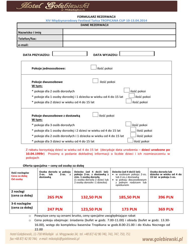 FORMULARZ REZERWACJI XIV Międzynarodowy Festiwal Tańca TROPICANA CUP 10-13.04.2014 DANE REZERWACJI Nazwisko i imię Telefon/fax: e-mail: DATA PRZYJAZDU: DATA WYJAZDU: Pokoje jednoosobowe: ilość pokoi Pokoje dwuosobowe W tym: ilość pokoi * pokoje dla 2 osób dorosłych ilość pokoi * pokoje dla 1 osoby dorosłej i 1 dziecka w wieku od 4 do 15 lat * pokoje dla 2 dzieci w wieku od 4 do 15 lat Pokoje dwuosobowe z dostawką W tym: ilość pokoi ilość pokoi ilość pokoi * pokoje dla 3 osób dorosłych ilość pokoi * pokoje dla 1 osoby dorosłej i 2 dzieci w wieku od 4 do 15 lat ilość pokoi * pokoje dla 2 osób dorosłych i 1 dziecka w wieku od 4 do 15 lat ilość pokoi * pokoje dla 3 dzieci w wieku od 4 do 15 lat ilość pokoi Z rabatu korzystają dzieci w wieku od 4 do 15 lat (decyduje data urodzenia – dzieci urodzone po 10.04.1999r) Prosimy o podanie dokładnej informacji o liczbie dzieci i ich rozmieszczeniu w pokojach Oferta specjalna – ceny od osoby za dobę Ilość noclegów Cena za dobę Od osoby 2 noclegi (cena za dobę) 3-6 noclegów (cena za dobę) Osoba dorosła w pokoju 2-os. lub 2-os. z dostawką Dziecko (od 4 do15 lat): pokoju 2-os. z dostawką z min. 1 osobą dorosłą (1 osoba dorosła 2 dzieci lub 2 osoby dorosłe i 1 dziecko) Dziecko (od 4 do15 lat): w osobnym pokoju 2-os. lub 2-os.z dostawką w pokoju dwuosobowym z jednym rodzicem lub opiekunem Osoba dorosła lub dziecko w wieku od 4 do 15 lat w pokoju 1-os. 265 PLN 132,50 PLN 185,50 PLN 396 PLN 247 PLN 123,50 PLN 173 PLN 369 PLN o Powyższe ceny są cenami brutto, ceny specjalne uwzględniające rabat o Cena pokoju obejmuje: śniadania (bufet w godz. 7.00-11.00) i obiady (bufet w godz. 13.3016.00), wstęp do kompleksu basenów Tropikana w godz.8.00-21.00 i do Klubu Nocnego od 22.00 o Pobyt rozpoczyna się obiadem w dniu przyjazdu i kończy śniadaniem w dniu wyjazdu o Doba hotelowa trwa od 14.00 do 12.00 dnia następnego. o Rezerwacje przyjmowane są według kolejności zgłoszeń i dostępności miejsc, tylko na podstawie przesłanego formularza zgłoszeniowego o Z powodu ograniczonej ilości miejsc decyduje kolejność zgłoszeń Potwierdzeniem przyjazdu jest wpłata zadatku (60% wartości zamówienia) do dnia 10.03.2014r. (brak wpłaty oznacza rezygnację z wcześniej złożonej rezerwacji i jej automatyczną anulację). Bank: PKO S.A. O / MRĄGOWO; Plac Kajki 1, IBAN: PL 89124016171111000013677563 S.W.I.F.T.: PKOPPLPW 11 – 700 Mrągowo, Poland Wpłacone na rezerwacje zadatki nie podlegają zwrotowi w przypadku anulacji całości lub części pokoi po 31.03.2014r. Pozostała opłata na miejscu w recepcji hotelu gotówką lub kartą kredytową. Do potwierdzenia rezerwacji konieczne jest przesłanie listy gości z podziałem na pokoje i wskazaniem dzieci wieku od 4 do 15 lat