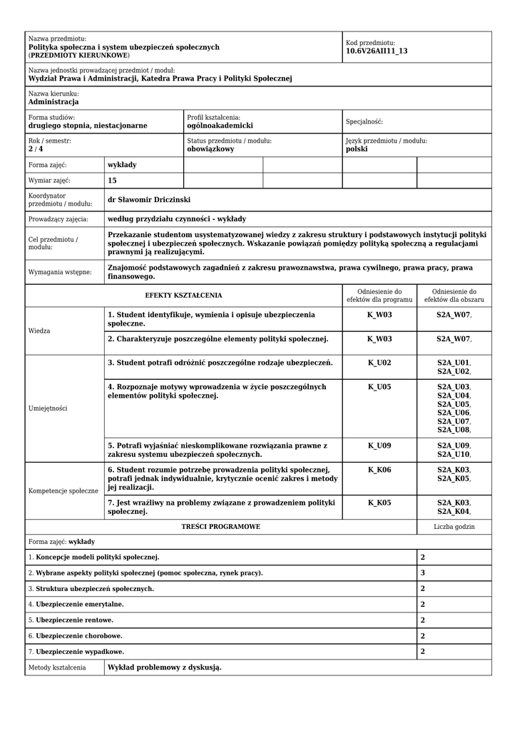 Nazwa przedmiotu: Polityka społeczna i system ubezpieczeń społecznych (PRZEDMIOTY KIERUNKOWE) Kod przedmiotu: 10.6V26AII11_13 Nazwa jednostki prowadzącej przedmiot / moduł: Wydział Prawa i Administracji, Katedra Prawa Pracy i Polityki Społecznej Nazwa kierunku: Administracja Forma studiów: Profil kształcenia: drugiego stopnia, niestacjonarne ogólnoakademicki Rok / semestr: 2/4 Status przedmiotu / modułu: Język przedmiotu / modułu: obowiązkowy polski Specjalność: Forma zajęć: wykłady Wymiar zajęć: 15 Koordynator przedmiotu / modułu: dr Sławomir Driczinski Prowadzący zajęcia: według przydziału czynności - wykłady Cel przedmiotu / modułu: Przekazanie studentom usystematyzowanej wiedzy z zakresu struktury i podstawowych instytucji polityki społecznej i ubezpieczeń społecznych. Wskazanie powiązań pomiędzy polityką społeczną a regulacjami prawnymi ją realizującymi. Wymagania wstępne: Znajomość podstawowych zagadnień z zakresu prawoznawstwa, prawa cywilnego, prawa pracy, prawa finansowego. Odniesienie do efektów dla programu Odniesienie do efektów dla obszaru 1. Student identyfikuje, wymienia i opisuje ubezpieczenia społeczne. K_W03 S2A_W07, 2. Charakteryzuje poszczególne elementy polityki społecznej. K_W03 S2A_W07, 3. Student potrafi odróżnić poszczególne rodzaje ubezpieczeń. K_U02 S2A_U01, S2A_U02, 4. Rozpoznaje motywy wprowadzenia w życie poszczególnych elementów polityki społecznej. K_U05 S2A_U03, S2A_U04, S2A_U05, S2A_U06, S2A_U07, S2A_U08, 5. Potrafi wyjaśniać nieskomplikowane rozwiązania prawne z zakresu systemu ubezpieczeń społecznych. K_U09 S2A_U09, S2A_U10, 6. Student rozumie potrzebę prowadzenia polityki społecznej, potrafi jednak indywidualnie, krytycznie ocenić zakres i metody jej realizacji. K_K06 S2A_K03, S2A_K05, 7. Jest wrażliwy na problemy związane z prowadzeniem polityki społecznej. K_K05 S2A_K03, S2A_K04, EFEKTY KSZTAŁCENIA Wiedza Umiejętności Kompetencje społeczne TREŚCI PROGRAMOWE Liczba godzin Forma zajęć: wykłady 1. Koncepcje modeli polityki społecznej. 2 2. Wybrane aspekty polityki społecznej (pomoc społeczna, rynek pracy). 3 3. Struktura ubezpieczeń społecznych. 2 4. Ubezpieczenie emerytalne. 2 5. Ubezpieczenie rentowe. 2 6. Ubezpieczenie chorobowe. 2 7. Ubezpieczenie wypadkowe. 2 Metody kształcenia Wykład problemowy z dyskusją. Metody weryfikacji efektów kształcenia Forma i warunki zaliczenia Nr efektu kształcenia z sylabusa * egzamin pisemny 1,2,3,4,5,6, Egzamin pisemny (pytania opisowe z zakresu zajęć i literatury podstawowej). Trzy pytania teoretyczne. Jedno z zakresu polityki społecznej, dwa z zakresu systemu ubezpieczeń społecznych. Za odpowiedż na każde pytanie można uzyskać maksymalnie 10 punktów. Zasady oceniania są następujące: 30-28 - bardzo dobry, 27-25- dobry plus, 24-22 - dobry, 21-19 - dostateczny plus, 18-16 - dostateczny. Literatura podstawowa Kowalczyk O., Kamiński S. (2009): Wymiary polityki społecznej. Wydawnictwo Uniwersytetu Ekonomicznego Wrocław Szpor G. (red.) (2011): System ubezpieczeń społecznych. Zagadnienia podstawowe. LexisNexis Literatura uzupełniająca Firlit-Fesnak G., Szylko-Skoczny M. (red.) (2008): Polityka społeczna. PWN Jędrasik-Jankowska I. (2012): Pojęcia i konstrukcje prawne ubezpieczenia społecznego. Lexis Nexis Sierpowska I. (2011): Prawo pomocy społecznej. Lex a Wolters Kluwer business NAKŁAD PRACY STUDENTA: Liczba godzin Zajęcia dydaktyczne 15 Udział w konsultacjach 10 Zdawanie egzaminu lub/i zaliczenia 2 Przygotowanie się do zajęć 10 Studiowanie literatury 23 Przygotowanie się do egzaminu lub/i zaliczenia 15 ŁĄCZNY nakład pracy studenta w godz. 75 Liczba punktów ECTS 3