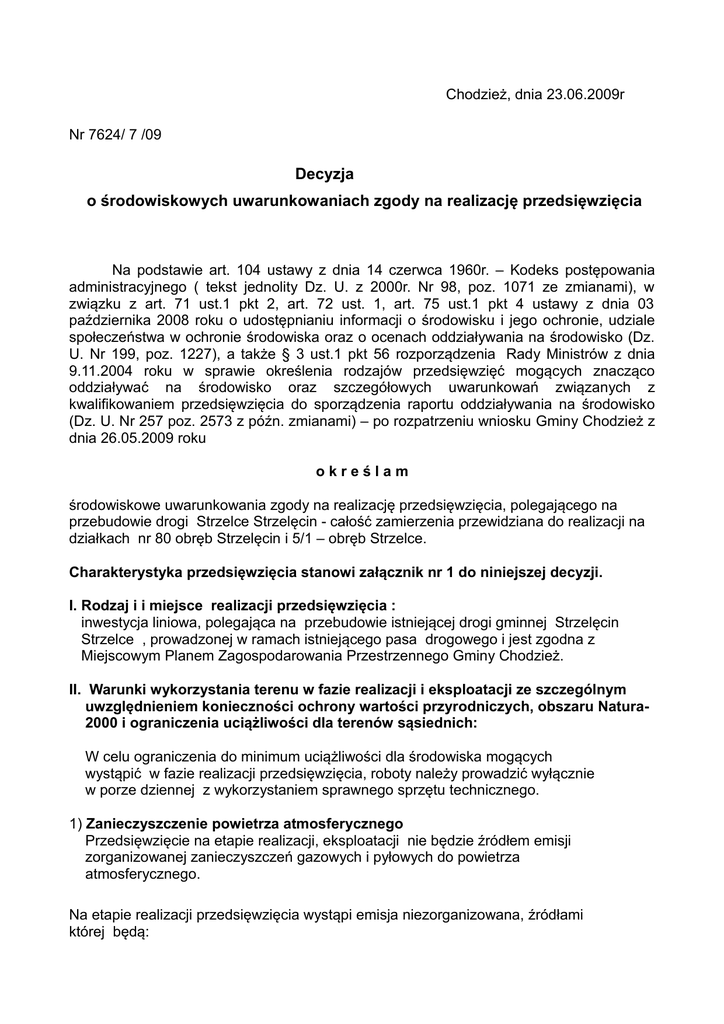 Chodzież, dnia 23.06.2009r Nr 7624/ 7 /09 Decyzja o środowiskowych uwarunkowaniach zgody na realizację przedsięwzięcia Na podstawie art. 104 ustawy z dnia 14 czerwca 1960r. – Kodeks postępowania administracyjnego ( tekst jednolity Dz. U. z 2000r. Nr 98, poz. 1071 ze zmianami), w związku z art. 71 ust.1 pkt 2, art. 72 ust. 1, art. 75 ust.1 pkt 4 ustawy z dnia 03 października 2008 roku o udostępnianiu informacji o środowisku i jego ochronie, udziale społeczeństwa w ochronie środowiska oraz o ocenach oddziaływania na środowisko (Dz. U. Nr 199, poz. 1227), a także § 3 ust.1 pkt 56 rozporządzenia Rady Ministrów z dnia 9.11.2004 roku w sprawie określenia rodzajów przedsięwzięć mogących znacząco oddziaływać na środowisko oraz szczegółowych uwarunkowań związanych z kwalifikowaniem przedsięwzięcia do sporządzenia raportu oddziaływania na środowisko (Dz. U. Nr 257 poz. 2573 z późn. zmianami) – po rozpatrzeniu wniosku Gminy Chodzież z dnia 26.05.2009 roku określam środowiskowe uwarunkowania zgody na realizację przedsięwzięcia, polegającego na przebudowie drogi Strzelce Strzelęcin - całość zamierzenia przewidziana do realizacji na działkach nr 80 obręb Strzelęcin i 5/1 – obręb Strzelce. Charakterystyka przedsięwzięcia stanowi załącznik nr 1 do niniejszej decyzji. I. Rodzaj i i miejsce realizacji przedsięwzięcia : inwestycja liniowa, polegająca na przebudowie istniejącej drogi gminnej Strzelęcin Strzelce , prowadzonej w ramach istniejącego pasa drogowego i jest zgodna z Miejscowym Planem Zagospodarowania Przestrzennego Gminy Chodzież. II. Warunki wykorzystania terenu w fazie realizacji i eksploatacji ze szczególnym uwzględnieniem konieczności ochrony wartości przyrodniczych, obszaru Natura2000 i ograniczenia uciążliwości dla terenów sąsiednich: W celu ograniczenia do minimum uciążliwości dla środowiska mogących wystąpić w fazie realizacji przedsięwzięcia, roboty należy prowadzić wyłącznie w porze dziennej z wykorzystaniem sprawnego sprzętu technicznego. 1) Zanieczyszczenie powietrza atmosferycznego Przedsięwzięcie na etapie realizacji, eksploatacji nie będzie źródłem emisji zorganizowanej zanieczyszczeń gazowych i pyłowych do powietrza atmosferycznego. Na etapie realizacji przedsięwzięcia wystąpi emisja niezorganizowana, źródłami której będą: - praca silników urządzeń budowlanych, sprzętu i samochodów transportowych oraz pojazdów pracujących na terenie realizacji przedsięwzięcia, -pylenie związane z prowadzeniem prac ziemnych i magazynowaniem materiałów, Do robót budowlano-montażowych należy używać wyłącznie sprzętu sprawnego technicznie w celu zmniejszenia emisji. W trakcie eksploatacji projektowanej drogi, emitowane będą zanieczyszczenia związane ze spalaniem paliw w poruszających się pojazdach, które występują również w chwili obecnej. Emisja zanieczyszczeń atmosferycznych nie może powodować zagrożenia jakości sanitarnej powietrza atmosferycznego i musi być zgodna z obowiązującymi w tym zakresie standardami. Zasięg oddziaływania związany z emisją zanieczyszczeń atmosferycznych musi ograniczyć się do granicy terenu, do którego Inwestor posiada tytuł prawny. Przedsięwzięcie realizowane będzie poza wyznaczonymi i proponowanymi obszarami Natura 2000 wyznaczonymi w trybie ustawy z dnia 16 kwietnia 2004 r. O ochronie przyrody (Dz. U. Nr 92, poz. 880 z późniejszymi zmianami). 2) Odpady W trakcie realizacji, i likwidacji przedsięwzięcia mogą być wytwarzane odpady niebezpieczne oraz inne niż niebezpieczne. Gospodarka tymi odpadami będzie prowadzona zgodnie z przepisami obowiązującymi w tym zakresie. W trakcie realizacji, eksploatacji i likwidacji przedsięwzięcia należy przestrzegać zapisów ustawy z dnia 27 kwietnia 2001 r. o odpadach (tekst jednolity Dz. U. Nr 39, poz. 251 z 2007r. z późniejszymi zmianami) oraz rozporządzenia Ministra Środowiska z dnia 27 września 2001 roku w sprawie katalogu odpadów (Dz. U. Nr 112, poz. 1206 z 2001 roku). W postępowaniu z olejami odpadowymi powstającymi z eksploatacji pojazdów i urządzeń należy przestrzegać przepisów rozporządzenia Ministra Gospodarki i Pracy z dnia 4 sierpnia 2004 r. w sprawie szczegółowego postępowania z olejami odpadowymi (Dz. U. Nr 96, poz. 1986). W sytuacjach awaryjnych (np. wyciek) prace z odpadami musi prowadzić firma posiadająca odpowiednie decyzje z zakresu ustawy o odpadach. Budowa obiektu będzie wymagała prowadzenia prac ziemnych i budowlanych. W trakcie tych prac należy zwrócić szczególną uwagę na właściwą eksploatację sprzętu. Zabrania się podejmowania prac remontowych sprzętu budowlano – montażowego, takich jak wymiana oleju i inne wymiany elementów maszyn, powodujące powstawanie odpadów niebezpiecznych oraz ewentualne zanieczyszczenie środowiska. 3) Hałas Na etapie budowy i likwidacji w trakcie wykonywania prac budowlano-montażowych oraz w okresie transportu materiałów budowlanych samochodami będzie emitowany hałas o charakterze okresowym. Uciążliwości z nim związane ustaną wraz z zakończeniem tych prac. Prace adaptacyjne przy dobrze zorganizowanych czynnościach i zastosowaniu nowoczesnych urządzeń o niskiej emisji hałasu oraz wykonywane tylko w porze dziennej nie wpłyną na pogorszenie panującego w tym rejonie klimatu akustycznego. W pobliżu zabudowań mieszkalnych należy tak zaplanować prace budowlane, aby urządzenia emitujące hałas o dużym natężeniu nie pracowały równocześnie. W trakcie eksploatacji zmodernizowanej drogi emitowany hałas komunikacyjny ulegnie zmniejszeniu poprzez lepszą płynność jazdy . III. Usytuowanie przedsięwzięcia z uwzględnieniem możliwego zagrożenia dla środowiska: - planowane przedsięwzięcie dotyczy przebudowy istniejącej drogi gminnej o łącznej długości około 1 250 mb a szerokość 4,0 m , - w pasie przyległym do drogi znajdują się budynki mieszka