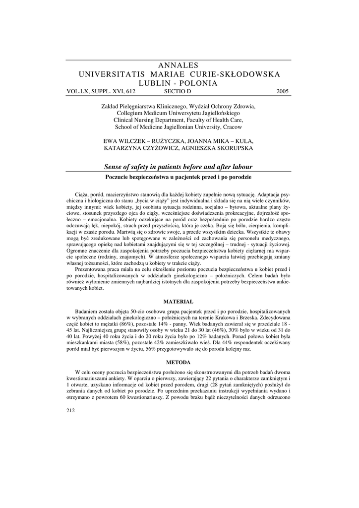 ANNALES UNIVERSITATIS MARIAE CURIE-SKŁODOWSKA LUBLIN - POLONIA VOL.LX, SUPPL. XVI, 612 SECTIO D 2005 Zakład Pielęgniarstwa Klinicznego, Wydział Ochrony Zdrowia, Collegium Medicum Uniwersytetu Jagiellońskiego Clinical Nursing Department, Faculty of Health Care, School of Medicine Jagiellonian University, Cracow EWA WILCZEK – RUŻYCZKA, JOANNA MIKA – KULA, KATARZYNA CZYŻOWICZ, AGNIESZKA SKORUPSKA Sense of safety in patients before and after labour Poczucie bezpieczeństwa u pacjentek przed i po porodzie Ciąża, poród, macierzyństwo stanowią dla każdej kobiety zupełnie nową sytuację. Adaptacja psychiczna i biologiczna do stanu „bycia w ciąży” jest indywidualna i składa się na nią wiele czynników, między innymi: wiek kobiety, jej osobista sytuacja rodzinna, socjalno – bytowa, aktualne plany życiowe, stosunek przyszłego ojca do ciąży, wcześniejsze doświadczenia prokreacyjne, dojrzałość społeczno – emocjonalna. Kobiety oczekujące na poród oraz bezpośrednio po porodzie bardzo często odczuwają lęk, niepokój, strach przed przyszłością, która je czeka. Boją się bólu, cierpienia, komplikacji w czasie porodu. Martwią się o zdrowie swoje, a przede wszystkim dziecka. Wszystkie te obawy mogą być zredukowane lub spotęgowane w zależności od zachowania się personelu medycznego, sprawującego opiekę nad kobietami znajdującymi się w tej szczególnej – trudnej - sytuacji życiowej. Ogromne znaczenie dla zaspokojenia potrzeby poczucia bezpieczeństwa kobiety ciężarnej ma wsparcie społeczne (rodziny, znajomych). W atmosferze społecznego wsparcia łatwiej przebiegają zmiany własnej tożsamości, które zachodzą u kobiety w trakcie ciąży. Prezentowana praca miała na celu określenie poziomu poczucia bezpieczeństwa u kobiet przed i po porodzie, hospitalizowanych w oddziałach ginekologiczno – położniczych. Celem badań było również wyłonienie zmiennych najbardziej istotnych dla zaspokojenia potrzeby bezpieczeństwa ankietowanych kobiet. MATERIAŁ Badaniem została objęta 50-cio osobowa grupa pacjentek przed i po porodzie, hospitalizowanych w wybranych oddziałach ginekologiczno – położniczych na terenie Krakowa i Brzeska. Zdecydowana część kobiet to mężatki (86%), pozostałe 14% - panny. Wiek badanych zawierał się w przedziale 18 45 lat. Najliczniejszą grupę stanowiły osoby w wieku 21 do 30 lat (46%), 30% było w wieku od 31 do 40 lat. Powyżej 40 roku życia i do 20 roku życia było po 12% badanych. Ponad połowa kobiet była mieszkankami miasta (58%), pozostałe 42% zamieszkiwało wieś. Dla 44% respondentek oczekiwany poród miał być pierwszym w życiu, 56% przygotowywało się do porodu kolejny raz. METODA W celu oceny poczucia bezpieczeństwa posłużono się skonstruowanymi dla potrzeb badań dwoma kwestionariuszami ankiety. W oparciu o pierwszy, zawierający 22 pytania o charakterze zamkniętym i 1 otwarte, uzyskano informacje od kobiet przed porodem, drugi (28 pytań zamkniętych) posłużył do zebrania danych od kobiet po porodzie. Po uprzednim przekazaniu instrukcji wypełniania wydano i otrzymano z powrotem 60 kwestionariuszy. Z powodu braku bądź nieczytelności danych odrzucono 212 10 kwestionariuszy. Ostatecznie analizom poddano dane uzyskane od 50 kobiet. Uzyskane dane zostały poddane analizie statystycznej testem studenta x2 przy p = 0,05. WYNIKI Przeprowadzone badania wykazały, że spośród ankietowanych kobiet oczekujących na poród 48% nie czuła się bezpiecznie na oddziale, pozostałe 52% miało poczucie bezpieczeństwa. Większość badanych (64%) deklarowało zaufanie do zatrudnionego w oddziale personelu medycznego, a 74% miało przekonanie, że nad ich bezpieczeństwem w szpitalu czuwają bezpośrednio pielęgniarki/położne. Zdaniem 66% ankietowanych lekarze byli w razie potrzeby łatwo dostępni, jednak tylko 34% kobiet twierdziło, że uzyskało od nich niezbędne informacje o przebiegu porodu. Znacznie więcej osób wskazywało na położne jako rzetelne źródło informacji o sposobie przygotowania się do porodu (64%). Z analizy materiału badawczego wynika, że aż 58% pacjentek nie zostało poinformowanych o możliwości znieczulenia i jego rodzajach. Po porodzie zadowolonych z informacji na temat samoopieki, opieki nad noworodkiem i karmienia piersią było 44% respondentek, jeszcze mniej badanych (36%) usatysfakcjonowanych było z uzyskanych danych dotyczących połogu. Bardzo znamiennym jest fakt, że wszystkie kobiety uznały odwiedziny rodziny za czynnik wpływający pozytywnie na ich poczucie bezpieczeństwa, ale już tylko 48% oceniało obecność bliskiej osoby w czasie porodu za sytuację korzystną z punktu widzenia zaspokojenia potrzeby bezpieczeństwa. Analiza statystyczna wyników badań wykazała, że poczucie bezpieczeństwa pacjentek przed porodem ma związek z odpowiednim przekazaniem informacji o przebiegu porodu przez lekarza. Wyniki tej analizy zamieszczono w tabeli 1. Tabela 1. Czy czuje się Pani bezpiecznie na tym oddziale? X2 = 33,7634 df = 1 p = 0,000 TAK NIE Czy została Pani poinformowana o przebiegu porodu przez lekarza? TAK NIE 15 2 2 31 Istnieje również związek poczucia bezpieczeństwa z przekazaniem położnicom przez położne informacji na temat sposobu przygotowania do porodu (tab. 2). TABELA 2. Czy czuje się Pani bezpiecznie na tym oddziale? X2 = 4,66821 df = 1 p = 0,031 TAK NIE Czy została Pani poinformowana o przez położną o sposobie przygotowania do porodu? TAK NIE 24 8 8 10 Istotną statystycznie zależność wykazano pomiędzy zaspokojeniem potrzeby bezpieczeństwa a przekonaniem o solidnej opiece ze strony pielęgniarek/położnych (tab. 3). Tabela 3. Czy czuje się Pani bezTAK piecznie na tym oddziale? NIE X2 = 4,973002 df = 1 p = 0,026 Czy ma Pani przekonanie, że nad Pani i dziecka bezpieczeństwem w szpitalu bezpośrednio czuwają pielęgniarki/położne? TAK NIE 27 5 10 8 213 Analiza statystyczna wyników badań nie
