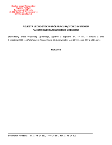 Opolski Urząd Wojewódzki Wydział Polityki Społecznej i Zdrowia 45-082 Opole, ul. Piastowska 14 Skrytka pocztowa 3 REJESTR JEDNOSTEK WSPÓŁPRACUJĄCYCH Z SYSTEMEM PAŃSTWOWE RATOWNICTWO MEDYCZNE prowadzony przez Wojewodę Opolskiego, zgodnie z zapisami art. 17 ust. 1 ustawy z dnia 8 września 2006 r. o Państwowym Ratownictwie Medycznym (Dz. U. z 2013 r., poz. 757 z późn. zm.) ROK 2016 Sekretariat Wydziału: tel. 77 45 24 563, 77 45 24 881, fax. 77 45 24 509 REJESTR JEDNOSTEK WSPÓŁPRACUJĄCYCH Z SYSTEMEM PAŃSTWOWE RATOWNICTWO MEDYCZNE PROWADZONY PRZEZ WOJEWODĘ OPOLSKIEGO L.p. 1. Nazwa jednostki współpracującej z systemem Komenda Wojewódzka Państwowej Straży Pożarnej wraz z podległymi jej Komendami: Miejską oraz Powiatowymi Sekretariat Wydziału: Siedziba jednostki Opole Adres jednostki 45-202 Opole, ul. Budowlanych 1 Obszar działania województwo opolskie tel. 77 45 24 563, 77 45 24 881, fax. 77 45 24 509 Liczba ratowników posiadających ważne zaświadczenia o ukończeniu kursu i uzyskaniu tytułu ratownika 792 Wykaz wyposażenia, jakim dysponuje jednostka współpracująca z systemem 1) 7 manekinów szkoleniowych osób dorosłych 2) 2 manekiny noworodka 3) 1 zestaw ratowniczy PSP R-2 4) 2 zestawy ratownicze PSP R-1 5) 2 defibrylatory półautomatyczne ćwiczebne 6) 1 zestaw „TRIAGE” 7) głowa do nauki intubacji 8) 2 zestawy ran Maksymalny czas dotarcia jednostki na miejsce zdarzenia uzależniony od lokalizacji miejsca zdarzenia i jednostki organizacyjnej PSP Numery telefonów kontaktowych 77 422 33 85 (Wojewódzkie Stanowisko Kierowania Ratowniczego) 2. Opolski Oddział Okręgowy Polski Czerwony Krzyż Sekretariat Wydziału: Opole 45-018 Opole, ul. Krakowska 51 województwo opolskie tel. 77 45 24 563, 77 45 24 881, fax. 77 45 24 509 12 1) Ochrona osobista: - 29 kombinezonów ochronnych jednoczęściowych wg standardu, - 30 kurtek ochronnych wg standardu - 30 spodni ochronnych oznakowanych wg standardu, - 30 bluz ochronnych oznakowanych wg standardu, - 30 kasków ochronnych PETZL Vaertex Best, - 30 sztuk oświetlenia osobistego – czołówka, - 30 okularów ochronnych. 2) Sprzęt ratowniczy: - 4 torby PSP R-1, - 12 apteczek plecakowych, opatrunkowych z wyposażeniem, - 4 deski ortopedyczne ze stabilizatorami i pasami, - 3 nosze podbierakowe, - 4 zestawy szyn Kramera, - 2 nosze pneumatyczne, - 1 defibrylator AED, - 4 ciśnieniomierze, - 2 glukometry, - 2 pulsoksymetry. 4 godziny 77 454 53 40, 792 311 102 3) Transport: - 1 samochód Volkswagen. Transporter 4 4) Łączność/lokalizacja: - 5 radiotelefonów nasobnych, - 1 GPS, 5) Logistyka: - 1 namiot z podłogą o pow. 50 m2, - 2 namioty szybkorozkładalne o pow. 18m2, - 1 agregat prądotwórczy, - 3 przedłużacze bębnowe, - 8 lamp oświetleniowych do Polowego Punktu Medycznego, - 2 nagrzewnice olejowe, - 30 łóżek polowych, 6) Pozostałe: - 2 kamizelki KED, -5 latarek typu szperacz, - 1 zestaw do segregacji TRIAGE. Sekretariat Wydziału: tel. 77 45 24 563, 77 45 24 881, fax. 77 45 24 509 3. Wodne Ochotnicze Pogotowie Ratunkowe Województwa Opolskiego Opole 45-301 Opole, ul. Małopolska 3 województwo opolskie RAZEM: 3 Sekretariat Wydziału: tel. 77 45 24 563, 77 45 24 881, fax. 77 45 24 509 17 1) samochód terenowy Ssangyong Action Sports- Picup. 4x4WD, 2) samochód terenowy Ssangyong KYRONPicup. 4x4WD, 3) samochód osobowy Renault Trafic, 4) 3 przyczepy podłodziowe, 5) 2 łodzie hybrydowe z sil. 30kM, 6) 1 łódź z pokładem ABS z sil. 75kM, 7) 2 skutery wodne 150kM z przyczepą, 8) 5 zestawów nurkowych, 9) 3 zestawy WOPR R-1, 10) 3 defibrylatory AED, 11) 8 kpl. zestawów wspinaczkowych, 12) 10 kół ratunkowych, 13) 20 rzutków ratunkowych, 14) 12 środków łączności radiowej. Zarząd Wojewódzki: 77 455 47 00, 602 588 746; 3 godziny Wojewódzka Grupa Operacyjna Opole: 600 809 847, 602 531 159; Rejonowa grupa interwencyjna KędzierzynKoźle: 668 682 885, 606 394 719.
