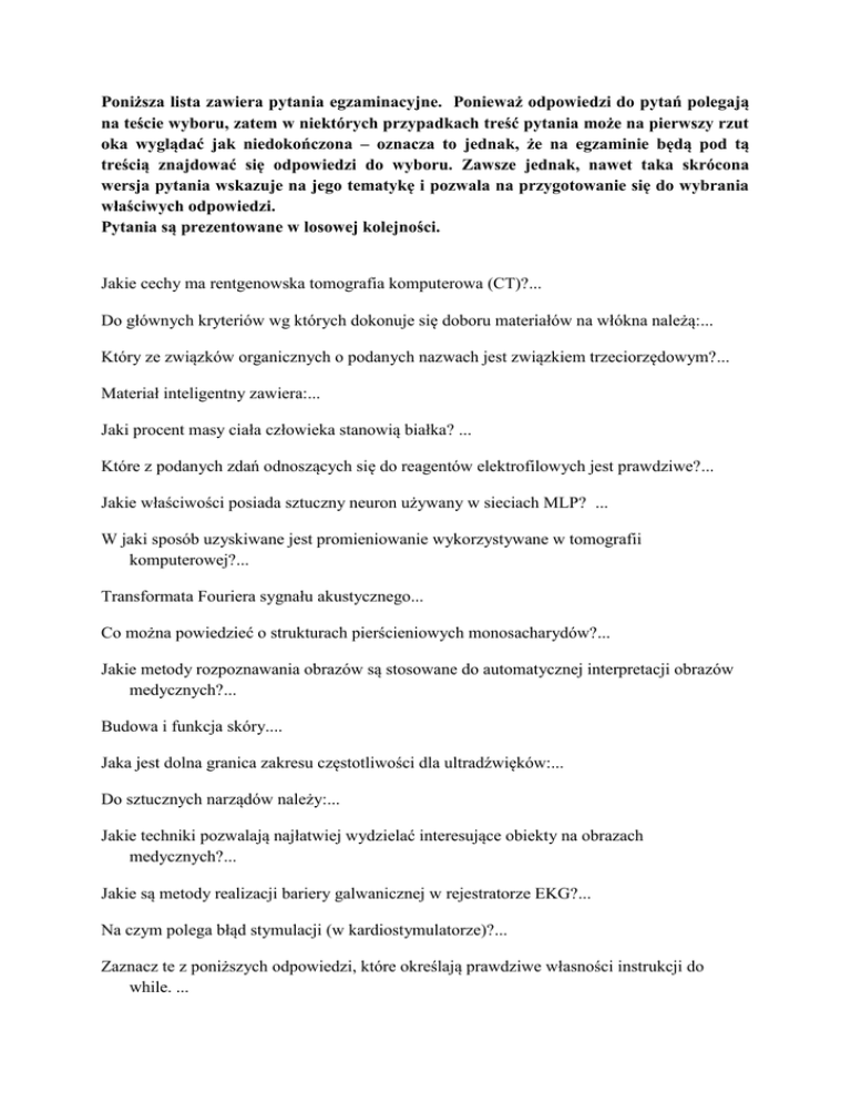 Poniższa lista zawiera pytania egzaminacyjne. Ponieważ odpowiedzi do pytań polegają na teście wyboru, zatem w niektórych przypadkach treść pytania może na pierwszy rzut oka wyglądać jak niedokończona – oznacza to jednak, że na egzaminie będą pod tą treścią znajdować się odpowiedzi do wyboru. Zawsze jednak, nawet taka skrócona wersja pytania wskazuje na jego tematykę i pozwala na przygotowanie się do wybrania właściwych odpowiedzi. Pytania są prezentowane w losowej kolejności. Jakie cechy ma rentgenowska tomografia komputerowa (CT)?... Do głównych kryteriów wg których dokonuje się doboru materiałów na włókna należą:... Który ze związków organicznych o podanych nazwach jest związkiem trzeciorzędowym?... Materiał inteligentny zawiera:... Jaki procent masy ciała człowieka stanowią białka? ... Które z podanych zdań odnoszących się do reagentów elektrofilowych jest prawdziwe?... Jakie właściwości posiada sztuczny neuron używany w sieciach MLP? ... W jaki sposób uzyskiwane jest promieniowanie wykorzystywane w tomografii komputerowej?... Transformata Fouriera sygnału akustycznego... Co można powiedzieć o strukturach pierścieniowych monosacharydów?... Jakie metody rozpoznawania obrazów są stosowane do automatycznej interpretacji obrazów medycznych?... Budowa i funkcja skóry.... Jaka jest dolna granica zakresu częstotliwości dla ultradźwięków:... Do sztucznych narządów należy:... Jakie techniki pozwalają najłatwiej wydzielać interesujące obiekty na obrazach medycznych?... Jakie są metody realizacji bariery galwanicznej w rejestratorze EKG?... Na czym polega błąd stymulacji (w kardiostymulatorze)?... Zaznacz te z poniższych odpowiedzi, które określają prawdziwe własności instrukcji do while. ... Sztuczna mechaniczna zastawka serca charakteryzuje się:... Jakie są warunki uzyskania obrazu jakiejś struktury podczas badania ultrasonograficznego?... Do czego służy binaryzacja obrazu medycznego?... Który ze związków organicznych o podanych nazwach w wyniku reakcji z NaOH tworzy sole ?... Jakie cechy posiadają błony biologiczne?... Splot sygnału i odpowiedzi impulsowej... W jaki sposób można wywołać obrotowy ruch endolimfy w jednym kanale półkolistym błędnika?... Jakie są powody stosowania radioizotopowych metod obrazowania medycznego?... Ułożenie atomów w krysztale idealnym jest uwarunkowane:... Jakie cechy ma technika MRI (obrazowania wykorzystującego zasadę magnetycznego rezonansu jądrowego NMR)?... Główna metoda projektowania filtrów FIR opiera się na... Transport masy w membranach najlepiej opisuje: ... Okno Parzena jest wykorzystywane do... Próbkowanie sygnału... Jakie typy detektorów są najczęściej używane w dozymetrii indywidualnej:... Rodzaje i cechy kanałów występujących w błonach biologicznych.... Czy możliwe jest zwiększenie rozdzielczości geometrycznej obrazu tomograficznego poprzez poprawienie czułości detektorów promieniowania?... Szkło:... Do odbioru sygnału z detektorów półprzewodnikowych promieniowania X stosuje się często wzmacniacze ładunkowe, które:... W jakich warunkach powstaje aerodynamiczna siła nośna?... Na jakiej zasadzie fizycznej działa głowica ultrasonograficzna?... Jakie są zalety tomoterapii:... Filtr antyaliasingowy jest filtrem... Istota zjawiska piezoelektryczngo polega na:... Analiza częstotliwościowa sygnałów cyfrowych... Które spośród podanych stwierdzeń dotyczących tłuszczów jest prawdziwe?... Ilość próbek dyskretnego widma... Które ze sposobów łączenia modeli elementów składowych tworzących łącznie model systemu biologicznego powodują takie formy zachowań systemu, jakich nie mają elementy składowe?... Funkcjonowanie układu nerwowego.... Na czym polega histereza czasowa kardiostymulatora?... Procesy, w których uczestniczą wolne rodniki.... Filtr o skończonej odpowiedzi impulsowej... Membrana to:... Jakim regułom podlega wyświetlanie obrazu w ultrasonograficznej prezentacji B?... Akronim 2-D FIR oznacza... Który z podanych związków organicznych zawiera w cząsteczce podstawniki elektronoakceptorowe?... Widmo amplitudowe sygnału akustycznego... Jak cechy aminokwasów wpływają na strukturę i właściwości białek?... Zaznacz te z poniższych odpowiedzi, które określają prawdziwe własności instrukcji continue... Który ze związków organicznych o podanych nazwach jest związkiem nienasyconym?... Podstawowymi problemami przy budowie wielokanałowych systemów odczytowych do rejestracji zewnątrzkomórkowych sygnałów neuronowych są:... Do czego może służyć biocybernetyczne modelowanie metabolizmu węglowodanów?... Czujniki pojemnościowe wykorzystywane są przy:... W mikroczujnikach do pomiaru ciśnienia nie stosuje się:... Jaka jest zaleta wykorzystywania oprogramowania w systemie alternatywnej komunikacji człowiek-komputer?... Jakie okoliczności trzeba brać pod uwagę przy modelowaniu biocybernetycznym wymiany informacji przez dwie komórki nerwowe?... Charakter przepływu krwi w żyłach można określić mianem:... Budowa białek i mechanizmy stabilizujące ich strukturę.... Wskaż nazwę, który nie jest nazwą typu złożonego w języku C++.... Wskaż ten identyfikator, który nie jest nazwą typu prostego w języku C++.... Membrany polimerowe otrzymuje się na drodze:... Na czym polega rozszerzenie możliwości diagnostycznych oferowanych przez wektokardiografię w porównaniu do elektrokardiografii?... Zaznacz tę z poniższych odpowiedzi, która określa nieprawdziwą własność składowych klasy umieszczonych po etykiecie public. ... Co to jest para kinematyczna?... Jakie są warunki równowagi przestrzennego dowolnego układu sił?... Jakie cechy różnicują nieliniową filtrację obrazu (mediana) od filtracji liniowej (konwolucja)?... Budowa ucha ludzkiego i mechanizm słyszenia. ... Spektrofotometr to urządzenie, które służy do:... Różnica napi