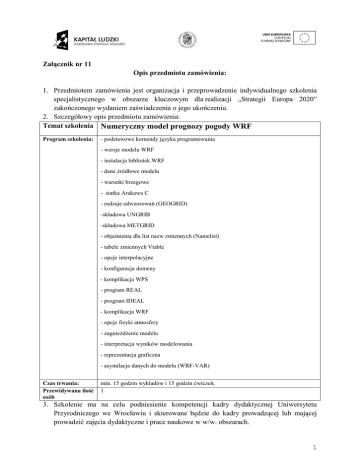 Załącznik nr 11 Opis przedmiotu zamówienia: 1. Przedmiotem zamówienia jest organizacja i przeprowadzenie indywidualnego szkolenia specjalistycznego w obszarze kluczowym dla realizacji „Strategii Europa 2020” zakończonego wydaniem zaświadczenia o jego ukończeniu. 2. Szczegółowy opis przedmiotu zamówienia: Temat szkolenia Numeryczny model prognozy pogody WRF Program szkolenia: - podstawowe komendy języka programowania - wersje modelu WRF - instalacja bibliotek WRF - dane źródłowe modelu - warunki brzegowe - siatka Arakawa C - rodzaje odwzorowań (GEOGRID) -składowa UNGRIB -składowa METGRID - objaśnienia dla list nazw zmiennych (Namelist) - tabele zmiennych Vtable - opcje interpolacyjne - konfiguracja domeny - komplikacja WPS - program REAL - program IDEAL - komplikacja WRF - opcje fizyki atmosfery - zagnieżdżenie modelu - interpretacja wyników modelowania - reprezentacja graficzna - asymilacja danych do modelu (WRF-VAR) Czas trwania: Przewidywana ilość osób min. 15 godzin wykładów i 15 godzin ćwiczeń. 1 3. Szkolenie ma na celu podniesienie kompetencji kadry dydaktycznej Uniwersytetu Przyrodniczego we Wrocławiu i skierowane będzie do kadry prowadzącej lub mającej prowadzić zajęcia dydaktyczne i prace naukowe w w/w. obszarach. 1 4. Zamawiający przewiduje zawarcie umowy z Wykonawcami na przedmiot zamówienia po zaistnieniu poniższych okoliczności: - przedstawieniu przez Wykonawcę programu / zakresu szkolenia zbieżnego ze szczegółowym opisem przedmiotu zamówienia, - przedstawieniu przez Wykonawcę propozycji dat / daty szkolenia oraz miejsca, - uzgodnienia powyższych szczegółów pomiędzy Zamawiającym a kandydatem na szkolenie. 5. Wykonawca będzie zobowiązany w ramach realizacji zamówienia do opracowania, powielenia i dostarczenia uczestnikowi szkolenia materiałów dydaktycznych wykorzystywanych w trakcie szkoleń. Wszelkie materiały dydaktyczne powinny być przekazane uczestnikowi zajęć bezzwrotnie. 6. Szkolenie ma być prowadzone z uwzględnieniem wiedzy na temat skutecznego procesu dydaktycznego oraz potrzeb uczestnika. 7. Wykonawca zapewni, że metody i pomoce dydaktyczne, zastosowane podczas szkolenia będą różnorodne oraz będą wykorzystywać nowoczesne i efektywne sposoby nauki. 8. Wykonawca wystawi dla uczestnika zaświadczenie zawierające informacje o odbyciu szkolenia z podaniem zrealizowanych zagadnień i zrealizowanej liczby godzin. 9. Miejsce szkolenia zapewnia Wykonawca (na terenie Polski). 10. Zamawiający przewiduje organizację szkolenia w okresie od 02.2015 r. do 15.06.2015 r. 11. Zamawiający dopuszcza, że organizowane przez Wykonawcę szkolenie będzie szkoleniem otwartym (tj. Zmawiający nie wymaga aby szkolenie było dedykowane wyłącznie dla pracowników i doktorantów UPWr). 12. W razie organizacji szkolenia przez Wykonawcę poza granicami Wrocławia, Zamawiający zapewni, w ramach posiadanego budżetu, zwrot kosztów delegacji uczestników szkoleń specjalistycznych (dieta, dojazd, zakwaterowanie). 13. Zamawiający dopuszcza możliwość usług pośrednictwa Wykonawcy, tj. możliwość wyszukania przez Wykonawcę szkolenia, które będzie realizowane przez podmiot zewnętrzny (wówczas zaświadczenie o którym mowa w pkt. 8 opisu przedmiotu zamówienia wystawi podmiot zewnętrzny). 14. Wykonawca odpowiada względem Zamawiającego za wszelkie szkody powstałe wskutek działania i/lub zaniechania pracowników lub osób trzecich lub podwykonawców jak za własne działania i zaniechania. 15. Zamawiający przewiduje płatność 30 dni od dnia dostarczenia prawidłowo wystawionej faktury do Zamawiającego - przy czym każda faktura będzie wystawiana przez Wykonawcę w ostatnim dniu miesiąca kalendarzowego. Tak wystawiona faktura będzie uwzględniała całkowity koszt szkoleń przeprowadzonych w danym miesiącu kalendarzowym, o ile takie będą miały miejsce. 16. Kody CPV: 80430000-7 - usługi edukacji osób dorosłych na poziomie akademickim. 80510000-2 – usługi szkolenia specjalistycznego. 2 FORMULARZ OFERTY Temat szkolenia Program szkolenia: Miejsce szkolenia Propozycja dat/daty szkolenia Kwota netto za wykonanie usługi (PLN)/os Numeryczny model prognozy pogody WRF Stawka podatku VAT (PLN) Kwota podatku VAT (PLN) Kwota brutto za wykonanie usługi (PLN)/os Przyjmuję do wiadomości, że Zamawiający planuje skierować na niniejsze szkolenie 1 osobę. ……………………………… Podpis wykonawcy 3