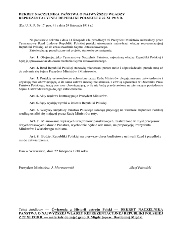 DEKRET NACZELNIKA PAŃSTWA O NAJWYśSZEJ WŁADZY REPREZENTACYJNEJ REPUBLIKI POLSKIEJ Z 22 XI 1918 R. (Dz. U. R. P. Nr 17, poz. 41 z dnia 29 listopada 1918 r.) Na podstawie dekretu z dnia 14 listopada r.b. przedłoŜył mi Prezydent Ministrów uchwalony przez Tymczasowy Rząd Ludowy Republiki Polskiej projekt utworzenia najwyŜszej władzy reprezentacyjnej Republiki Polskiej, aŜ do czasu zwołania Sejmu Ustawodawczego. Zatwierdzając przedłoŜony mi projekt, stanowię co następuje: Art. 1. Obejmuję, jako Tymczasowy Naczelnik Państwa, najwyŜszą władzę Republiki Polskiej i będę ją sprawował aŜ do czasu zwołania Sejmu Ustawodawczego. Art. 2. Rząd Republiki Polskiej stanowią mianowani przeze mnie i odpowiedzialni przede mną aŜ do zebrania się Sejmu Prezydent Ministrów i Ministrowie. Art. 3. Projekty ustawodawcze uchwalone przez Radę Ministrów ulegają mojemu zatwierdzeniu i uzyskują moc obowiązującą, o ile sama ustawa inaczej nie stanowi, z chwilą ogłoszenia w Dzienniku Praw Państwa Polskiego; tracą one moc obowiązującą, o ile nie będą przedstawione na pierwszym posiedzeniu Sejmu Ustawodawczego do jego zatwierdzenia. Art. 4. Akty rządowe kontrasygnuje Prezydent Ministrów. Art. 5. Sądy wydają wyroki w imieniu Republiki Polskiej. Art. 6. Wszyscy urzędnicy Państwa Polskiego składają przysięgę na wierność Republice Polskiej według ustalić się mającej przez Radę Ministrów roty. Art. 7. Mianowanie wyŜszych urzędników państwowych, zastrzeŜone w myśl przepisów dotychczasowych Głowie Państwa, wychodzić będzie ode mnie, na propozycję Prezydenta Ministrów i właściwego ministra. Art. 8. BudŜet Republiki Polskiej na pierwszy okres budŜetowy uchwali Rząd i przedłoŜy mi do zatwierdzenia. Dan w Warszawie, dnia 22 listopada 1918 roku Prezydent Ministrów: J. Moraczewski Józef Piłsudski Tekst źródłowy — Ćwiczenia z Historii ustroju Polski — DEKRET NACZELNIKA PAŃSTWA O NAJWYśSZEJ WŁADZY REPREZENTACYJNEJ REPUBLIKI POLSKIEJ Z 22 XI 1918 R. — materiały do zajęć grup B. Migdy [oprac. Bartłomiej Migda]