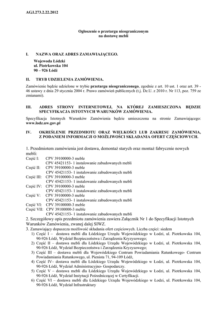 AG.I.273.2.22.2012 Ogłoszenie o przetargu nieograniczonym na dostawę mebli I. NAZWA ORAZ ADRES ZAMAWIAJĄCEGO. Wojewoda Łódzki ul. Piotrkowska 104 90 – 926 Łódź II. TRYB UDZIELENIA ZAMÓWIENIA. Zamówienie będzie udzielone w trybie przetargu nieograniczonego, zgodnie z art. 10 ust. 1 oraz art. 39 46 ustawy z dnia 29 stycznia 2004 r. Prawo zamówień publicznych (t.j. Dz.U. z 2010 r. Nr 113, poz. 759 ze zmianami). III. ADRES STRONY INTERNETOWEJ, NA KTÓREJ ZAMIESZCZONA SPECYFIKACJA ISTOTNYCH WARUNKÓW ZAMÓWIENIA. BĘDZIE Specyfikacja Istotnych Warunków Zamówienia będzie umieszczona na stronie Zamawiającego: www.lodz.uw.gov.pl IV. OKREŚLENIE PRZEDMIOTU ORAZ WIELKOŚCI LUB ZAKRESU ZAMÓWIENIA, Z PODANIEM INFORMACJI O MOŻLIWOŚCI SKŁADANIA OFERT CZĘŚCIOWYCH. 1. Przedmiotem zamówienia jest dostawa, demontaż starych oraz montaż fabrycznie nowych mebli: Część I: Część II: Część III: Część IV: Część V: Część VI: Część VII: CPV 39100000-3 meble CPV 45421153- 1 instalowanie zabudowanych mebli CPV 39100000-3 meble CPV 45421153- 1 instalowanie zabudowanych mebli CPV 39100000-3 meble CPV 45421153- 1 instalowanie zabudowanych mebli CPV 39100000-3 meble CPV 45421153- 1 instalowanie zabudowanych mebli CPV 39100000-3 meble CPV 45421153- 1 instalowanie zabudowanych mebli CPV 39100000-3 meble CPV 39100000-3 meble CPV 45421153- 1 instalowanie zabudowanych mebli 2. Szczegółowy opis przedmiotu zamówienia zawiera Załącznik Nr 1 do Specyfikacji Istotnych Warunków Zamówienia, zwanej dalej SIWZ. 3. Zamawiający dopuszcza możliwość składania ofert częściowych. Liczba części: siedem 1) Część I – dostawa mebli dla Łódzkiego Urzędu Wojewódzkiego w Łodzi, ul. Piotrkowska 104, 90-926 Łódź, Wydział Bezpieczeństwa i Zarządzenia Kryzysowego; 2) Część II – dostawa mebli dla Łódzkiego Urzędu Wojewódzkiego w Łodzi, ul. Piotrkowska 104, 90-926 Łódź, Wydział Bezpieczeństwa i Zarządzenia Kryzysowego; 3) Część III – dostawa mebli dla Wojewódzkiego Centrum Powiadamiania Ratunkowego- Centrum Powiadamiania Ratunkowego, ul. Pienista 71, 94-109 Łódź, 4) Część IV– dostawa mebli dla Łódzkiego Urzędu Wojewódzkiego w Łodzi, ul. Piotrkowska 104, 90-926 Łódź, Wydział Administracyjno- Gospodarczy. 5) Część V – dostawa mebli dla Łódzkiego Urzędu Wojewódzkiego w Łodzi, ul. Piotrkowska 104, 90-926 Łódź, Wydział Instytucji Pośredniczącej w Certyfikacji. 6) Część VI – dostawa mebli dla Łódzkiego Urzędu Wojewódzkiego w Łodzi, ul. Piotrkowska 104, 90-926 Łódź, Wydział Infrastruktury AG.I.273.2.22.2012 7) Część VII – dostawa mebli dla Łódzkiego Urzędu Wojewódzkiego w Łodzi, ul. Piotrkowska 104, 90-926 Łódź, Wydział Bezpieczeństwa i Zarządzenia Kryzysowego; 4. W ramach wykonania przedmiotu zamówienia Wykonawca musi dostarczyć meble do ww. lokalizacji odpowiednich dla części I, II, III, IV, V, VI i VII zdemontować stare meble, znajdujące się w pomieszczeniach i zmontować nowe. 5. Wszystkie koszty związane z realizacją zamówienia, w tym z dostawą przedmiotu zamówienia do wskazanych lokalizacji ponosi Wykonawca. 6. Wykonawca musi udzielić gwarancji na przedmiot zamówienia na min. 24 miesiące od daty podpisania protokołu zdawczo-odbiorczego. 7. Wykonawca zobowiązany jest przed przystąpieniem do realizacji zamówienia dokonać wizji lokalnej pomieszczeń, w których mają znajdować się meble. 8. Zamawiający dopuszcza możliwość zastosowania rozwiązań równoważnych. 9. Zamawiający dopuszcza możliwość wykonania części zamówienia przez podwykonawców. W tym przypadku wykonawca zobowiązany jest do podania w ofercie, którą część zamówienia zamierza powierzyć podwykonawcy. 10. Zamawiający przewiduje możliwość udzielenia zamówień uzupełniających, o których mowa w art. 67 ust. 1 pkt 7 ustawy. V. INFORMACJA O MOŻLIWOŚCI ZŁOŻENIA OFERT WARIANTOWYCH. Zamawiający nie dopuszcza możliwości złożenia oferty wariantowej. VI. TERMIN WYKONANIA ZAMÓWIENIA. Wymagany termin wykonania zamówienia: dla części I, II, III, IV, V, VI, VII- 21 dni kalendarzowych od dnia podpisania umowy VII. WARUNKI UDZIAŁU W POSTĘPOWANIU ORAZ OPIS SPOSOBU DOKONYWANIA OCENY SPEŁNIENIA TYCH WARUNKÓW. 1. O udzielenie zamówienia mogą ubiegać się wykonawcy, którzy wykażą, iż: 1) posiadają wiedzę i doświadczenie; 2) dysponują odpowiednim potencjałem technicznym oraz osobami zdolnymi do wykonania zamówienia; 3) znajdują się w sytuacji ekonomicznej i finansowej zapewniającej wykonanie zamówienia; 4) nie zachodzi żadna z formalnych przesłanek wykluczenia ich na podstawie art. 24 ust. 1 ustawy. 2. O udzielenie zamówienia mogą ubiegać się także wykonawcy, którzy w zakresie ust. 1 pkt 1, 2 oraz 3 (w zakresie sytuacji finansowej) uzyskają pisemne zobowiązanie innego podmiotu do oddania im do dyspozycji niezbędnych zasobów na okres korzystania z nich przy wykonywaniu zamówienia. 3. Ocena spełnienia warunków określonych w ust. 1: 1) Wykonawca spełni warunek określony w ust. 1 pkt 1 jeżeli wykaże, że posiada wiedzę i doświadczenie poprzez złożenie oświadczenia, o którym mowa w rozdz. VI ust. 1 SIWZ. 2) Wykonawca spełni warunek określony w ust. 1 pkt 2 jeżeli wykaże, że dysponuje odpowiednim potencjałem technicznym oraz osobami zdolnymi do wykonania zamówienia poprzez złożenie oświadczenia, o którym mowa w rozdz. VI ust. 1 SIWZ. 3) Wykonawca spełni warunek określony w ust. 1 pkt 3 jeżeli wykaże, że znajduje się w sytuacji ekonomicznej i finansowej zapewniającej wykonanie zamówienia poprzez złożenie oświadczenia, o którym mowa w rozdz. VI ust. 1 SIWZ. 4) Wykonawca spełni warunek określony w ust. 1 pkt 4 jeżeli wykaże, że nie zachodzi wobec niego żadna z formalnych przesłanek wykluczenia wykonawcy na podst. art. 24 ust. 1 ustawy poprzez złożenie dokumentów, o których mowa w rozdz. VI SIWZ. VIII. INFORMACJA NA TEMAT 
