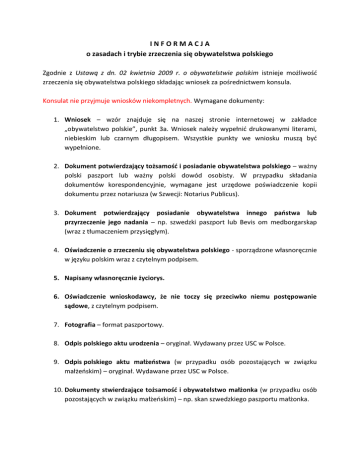 I N F O R M A C J A o zasadach i trybie zrzeczenia się obywatelstwa