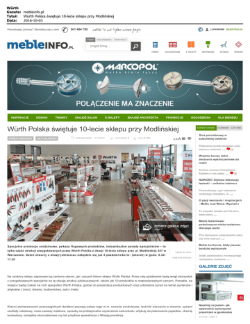 Würth Gazeta: mebleinfo.pl Tytuł: Würth Polska świętuje 10-lecie sklepu przy Modlińskiej Data: 2016-10-03 Potrzebujesz pomocy? Skontaktuj się z nami 501 484 795 FIRMY OGŁOSZENIA LOGOWANIE REJESTRACJA ARTYKUŁY znajdź firmę... INSPIRACJE DESIGN TRENDY ZNAJDŹ SALON E-SKLEPY ZNAJDŹ ARCHITEKTA PROMOCJE OGŁOSZENIA Würth Polska świętuje 10-lecie sklepu przy Modlińskiej STREFA BIZNESU AKTUALNOŚCI miesiąc temu 3.10.2016 komentarzy 0 ocen 0 / 0% A A A DLA BIZNESU KOMENTOWANE OCENIANE CZYTANE Gres porcelanowy w szlachetnej odsłonie Połączenie ponadczasowego uroku drewna z walorami ... (2) Wnętrze tworzy detal akcesoria wykończeniowe do mebli Kuchnia musi być funkcjonalna. Każdemu z nas zależy ... (2) NOWOŚĆ! Stylowa dekoracja łazienki – unikalna kabina z Personalizacja, czyli nadawanie osobistego charakteru, to ... O pasji tworzenia i inspiracjach - Malita Just Wood. Wywiad z To wszystko zaczęło się 8 lat temu, kiedy twórcy ... Meble łazienkowe: podwieszana miska toaletowadlaczego warto zdjęć 4 Przy planowaniu nowej łazienki czeka Cię wiele ważnych Meble kuchenne: blaty jeszcze bardziej wytrzymałe Specjalne promocje urodzinowe, pokazy flagowych produktów, indywidualne porady specjalistów – to tylko część atrakcji przygotowanych przez Würth Polska z okazji 10-lecia sklepu przy ul. Modlińskiej 347 w napisz do mnie ‹ Warszawie. Dzień otwarty z okazji jubileuszu odbędzie się już 4 października br. (wtorek) w godz. 9.3017.30 ... moje inne artykuły ‹ Dzięki zastosowaniu innowacyjnego rozwiązania, kuchenne ... GALERIE ZDJĘĆ Na urodziny sklepu zaproszeni są zarówno obecni, jak i przyszli klienci sklepu Würth Polska. Przez cały październik będą mogli skorzystać z przygotowanych specjalnie na tę okazję atrakcji jubileuszowych, takich jak 10 produktów w niepowtarzalnych cenach. Ponadto, na miejscu będą czekali na nich specjaliści Würth Polska, gotowi do prezentacji produktowych oraz udzielania porad na temat systemów i artykułów z branż: drewno, budownictwo, auto i metal. Klienci zainteresowani poszczególnymi działami poznają wobec tego m.in. nowości produktowe, techniki wiercenia w drewnie, system szuflady cokołowej, nowe zawiasy meblowe, sposoby na profesjonalne czyszczenie samochodu, artykuły do polerowania pojazdów, chemię budowlaną, narzędzia akumulatorowe czy też przyłbice spawalnicze z filtracją powietrza. Na(strój) na jesień– jak optymalnie wykorzystać przestrzeń w garderobie wczoraj › zdjęć 8 Würth Gazeta: mebleinfo.pl Tytuł: Würth Polska świętuje 10-lecie sklepu przy Modlińskiej Data: 2016-10-03 Ściana jak podłoga– nowy trend w wykańczaniu wnętrz Sklep przy ul. Modlińskiej nie jest oczywiście jedyną placówką sieci Würth w naszym kraju. Polski oddział firmy funkcjonuje pod szyldem wczoraj › zdjęć 3 Würth Polska i obecnie posiada 23 sklepy rozmieszczone na terenie całego kraju. Firma stawia na ciągły rozwój, w związku z czym w kolejnych latach sieć powiększy się jeszcze o nowe sklepy. W sklepach stacjonarnych koncern oferuje przeszło 2 tys. produktów, ale Würth Polska uruchomił również nową wersję sklepu internetowego, w której znajduje się oferta ponad 100 tys. produktów, rozwiązań i patentów. Światowy lider w dystrybucji produktów dla profesjonalistów, prowadzi sprzedaż wyłącznie firmom oraz osobom z własną Jakie wybrać nóżki do naszego stolika? wczoraj › zdjęć 5 działalnością gospodarczą. Więcej na: www.wurth.pl + 0 głosów: 0 (0%) Masz swoje autorskie zdjęcia? Dodaj je do naszego tekstu. ilość zdjęć 4 0 - dodaj zdjęcia dodaj komentarz KOMENTARZE (0) bądź pierwszy! KOMENTARZE SĄ MODEROWANE. WPISY NIEZWIĄZANE Z TEMATEM, WULGARNE, OBRAŹLIWE, NARUSZAJĄCE PRAWO BĘDĄ USUWANE ZGODNIE Z POSTANOWIENIAMI REGULAMINU. Nie ma jeszcze komentarzy... ... ... ... ... ... ... ... ... ... inspiracje Newsletter ... informacje o nas ... redakcja portalu ... nasi partnerzy ... regulamin ... polityka cookies ogłoszenia ... reklama dla biznesu ... kontakt, dojazd design trendy znajdź salon e-sklepy Jeśli chcesz być informowany o wydarzeniach w świecie mebli, wydarzeniach, nowościach, imprezach branżowych podaj nam swój adres e-mail. znajdź architekta promocje wpisz adres e-mail Podanie drugi raz tego samego adresu wymaże go z listy 501 484 795 mebleinfo.pl, ul. Gdańska 15/8 , 83-110 Tczew e-mail: [email protected] Ta strona używa cookie. Dowiedz się więcej o celu ich używania i zmianie ustawień cookie w przeglądarce. Korzystając ze strony wyrażasz zgodę na używanie cookie, zgodnie z Copyright mebleinfo.pl. Wszelkie materiały zawarte na stronie chronione są prawem. Powered by Ideal Media aktualnymi ustawieniami przeglądarki.