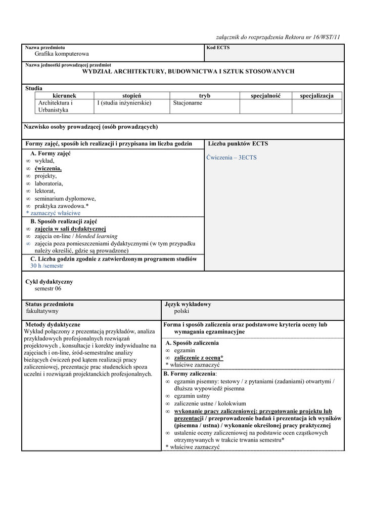 załącznik do rozprządzenia Rektora nr 16/WST/11 Nazwa przedmiotu Kod ECTS Grafika komputerowa Nazwa jednostki prowadzącej przedmiot WYDZIAŁ ARCHITEKTURY, BUDOWNICTWA I SZTUK STOSOWANYCH Studia kierunek Architektura i Urbanistyka stopień I (studia inżynierskie) tryb Stacjonarne specjalność specjalizacja Nazwisko osoby prowadzącej (osób prowadzących) Formy zajęć, sposób ich realizacji i przypisana im liczba godzin A. Formy zajęć • wykład, • ćwiczenia, • projekty, • laboratoria, • lektorat, • seminarium dyplomowe, • praktyka zawodowa.* * zaznaczyć właściwe B. Sposób realizacji zajęć • zajęcia w sali dydaktycznej • zajęcia on-line / blended learning • zajęcia poza pomieszczeniami dydaktycznymi (w tym przypadku należy określić, gdzie są prowadzone) C. Liczba godzin zgodnie z zatwierdzonym programem studiów 30 h /semestr Liczba punktów ECTS Ćwiczenia – 3ECTS Cykl dydaktyczny semestr 06 Status przedmiotu fakultatywny Język wykładowy polski Metody dydaktyczne Wykład połączony z prezentacją przykładów, analiza przykładowych profesjonalnych rozwiązań projektowych , konsultacje i korekty indywidualne na zajęciach i on-line, śród-semestralne analizy bieżących ćwiczeń pod kątem realizacji pracy zaliczeniowej, prezentacje prac studenckich spoza uczelni i rozwiązań projektanckich profesjonalnych. Forma i sposób zaliczenia oraz podstawowe kryteria oceny lub wymagania egzaminacyjne A. Sposób zaliczenia • egzamin • zaliczenie z oceną* * właściwe zaznaczyć B. Formy zaliczenia: • egzamin pisemny: testowy / z pytaniami (zadaniami) otwartymi / dłuższa wypowiedź pisemna • egzamin ustny • zaliczenie ustne / kolokwium • wykonanie pracy zaliczeniowej: przygotowanie projektu lub prezentacji / przeprowadzenie badań i prezentacja ich wyników (pisemna / ustna) / wykonanie określonej pracy praktycznej • ustalenie oceny zaliczeniowej na podstawie ocen cząstkowych otrzymywanych w trakcie trwania semestru* * właściwe zaznaczyć C. Podstawowe kryteria oceny 1. Zakres opanowania podstawowych funkcji programu 3dmax 2. Kreatywność w zakresie wykorzystania posiadanych umiejętności oryginalność, stopień profesjonalizmu realizacyjnego. 3. Ekspresja plastyczna kreacji 4. Zakres realizacji założeń zadania i ćwiczeń 5. Aktywność podczas konsultacji /korekt 6. Osiągnięty postęp. Określenie przedmiotów wprowadzających wraz z wymogami wstępnymi Należy określić: A. Wymagania formalne – zaliczenie poprzedniego semestru B. Wymagania wstępne – podstawowe umiejętności z zakresu komunikacji między aplikacjami komputerowymi a użytkownikiem, znajomość interfejsu graficznego i tekstowego komputera, podstawowa wiedza z zakresu posługiwania się programami z pakietu Microsoft Office, Adobe Photoshop i Corel Draw Cele przedmiotu 1. Przyswojenie podstaw wiedzy praktycznej i umiejętności z zakresu przestrzennego formowania obiektów z wykorzystaniem programu 3dsmax . 2. Wykorzystywania powyższej wiedzy i nabytych umiejętności w kreacji utylitarnych przekazów tworzonych na potrzeby prezentacji własnej twórczości za pomocą produkcji cyfrowych w Internecie bądź w formie drukowanej. 3. Stymulowanie i rozwijanie umiejętności warsztatowych oraz wzbogacania doświadczeń umożliwiających świadome, autorskie rozwiązywanie zadań projektowych z dziedziny architektury i planowania przestrzennego. 4. Wykształcenie umiejętności zdefiniowania problemu, analizy zadania oraz świadomości zastosowania możliwości programów graficznych oraz rozwiązań wraz z wykorzystaniem własnych predyspozycji twórczych do osiągnięcia zamierzonych efektów – uzyskiwanie w rezultacie pełni wyrazowej przekazu. Treści programowe A. Problematyka mini - wykładów 1. Zapoznanie studentów z celami zajęć i wynikającymi z nich zadaniami do wykonania oraz oprzyrządowaniem do ich realizacji, podanie literatury przedmiotu, wyjaśnienie zasad i warunków zaliczenia oraz organizacji zajęć. 2. Zapoznanie się z funkcjami i narzędziami programu 3dmax. B. Problematyka ćwiczeń 1. Ćwiczenia praktyczne z zastosowania poszczególnych grup narzędzi programu 3dmax (Przykładowa tematyka: Tworzenie, modelowanie i przekształcanie prostych i skomplikowanych brył,tworzenie i przypisywanie materiałów i map obiektom, oświetlenie, ujecia z kamer i animacje, edycja- rendering i zapisywanie) 2. Ćwiczenia praktyczne z zastosowania poszczególnych narzędzi programu 3dmax 3. Praca nad elementami zadania zaliczeniowego „Wizualizacja stoiska targowego własnej firmy” – korekty i konsultacje 4. Podsumowanie i prezentacja prac Wykaz literatury A. Literatura wymagana do ostatecznego zaliczenia zajęć (zdania egzaminu): A.1. wykorzystywana podczas zajęć 1. Kelly L. Murdoch „3dmax 2009 Biblia” wydawnictwo Helion 2009 A2. studiowana samodzielnie przez studenta 1. Paul Kakert, David J. Kalwiek – “3D Studio max 2.X” wydawnictwo Helion1998 2. Joanna Pasek „Ćwiczenia praktyczne 3dmax 9 Modelowanie i animacja” wydawnictwo Helion 2007 3. Wojciech Pazdur „3dmax 9 Leksykon kieszonkowy” Helion 2007 B. Literatura uzupełniająca 1. http://www.youtube.com/watch?v=iyimxESyG1c&feature=related2. http://www.youtube.com/watch?v=DtltR6Jr0wk&feature=related 3. http://www.youtube.com/watch?v=qKDQX1t1GRQ&feature=related 4. http://www.youtube.com/watch?v=mi85W6yLCvE&feature=related i pozostałe tautoriale z tego cyklu dostępne na YouTube Efekty uczenia się Wiedza 1. Przyswojenie wiedzy z zakresu nazewnictwa i pojęć stosowanych w programie 3 dmax. i odniesień do jęz. polskiego (oprogramowanie nie dostępne w polskiej wersji językowej) Umiejętności 1.Nabycie umiejętności samodzielnego tworzenia iluzyjnych wizualizacji przestrzennych dowolnych form prostych i złożonych w programie 3dmax . 2. Nabycie umiejętności praktycznych animowania elementów bądź całości kompozycji przestrzennych. 3. Nabycie umiejętno