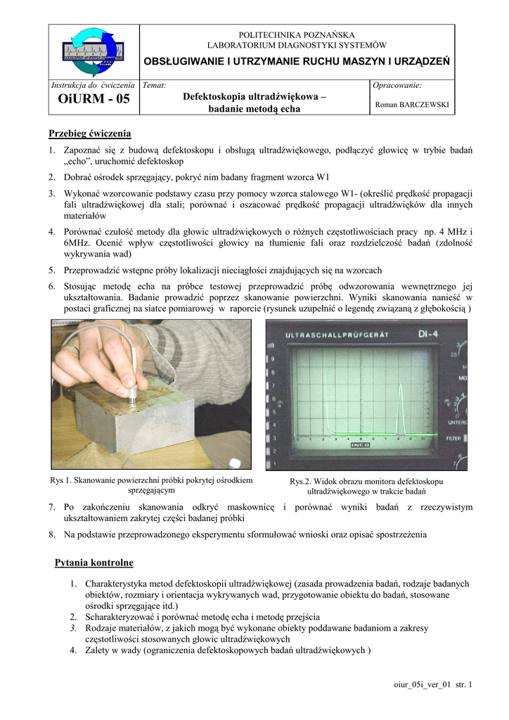 POLITECHNIKA POZNAŃSKA LABORATORIUM DIAGNOSTYKI SYSTEMÓW OBSŁUGIWANIE I UTRZYMANIE RUCHU MASZYN I URZĄDZEŃ Instrukcja do ćwiczenia Temat: OiURM - 05 Opracowanie: Defektoskopia ultradźwiękowa – badanie metodą echa Roman BARCZEWSKI Przebieg ćwiczenia 1. Zapoznać się z budową defektoskopu i obsługą ultradźwiękowego, podłączyć głowicę w trybie badań „echo”, uruchomić defektoskop 2. Dobrać ośrodek sprzęgający, pokryć nim badany fragment wzorca W1 3. Wykonać wzorcowanie podstawy czasu przy pomocy wzorca stalowego W1- (określić prędkość propagacji fali ultradźwiękowej dla stali; porównać i oszacować prędkość propagacji ultradźwięków dla innych materiałów 4. Porównać czułość metody dla głowic ultradźwiękowych o róŜnych częstotliwościach pracy np. 4 MHz i 6MHz. Ocenić wpływ częstotliwości głowicy na tłumienie fali oraz rozdzielczość badań (zdolność wykrywania wad) 5. Przeprowadzić wstępne próby lokalizacji nieciągłości znajdujących się na wzorcach 6. Stosując metodę echa na próbce testowej przeprowadzić próbę odwzorowania wewnętrznego jej ukształtowania. Badanie prowadzić poprzez skanowanie powierzchni. Wyniki skanowania nanieść w postaci graficznej na siatce pomiarowej w raporcie (rysunek uzupełnić o legendę związaną z głębokością ) Rys 1. Skanowanie powierzchni próbki pokrytej ośrodkiem sprzęgającym Rys.2. Widok obrazu monitora defektoskopu ultradźwiękowego w trakcie badań 7. Po zakończeniu skanowania odkryć maskownicę i porównać wyniki badań z rzeczywistym ukształtowaniem zakrytej części badanej próbki 8. Na podstawie przeprowadzonego eksperymentu sformułować wnioski oraz opisać spostrzeŜenia Pytania kontrolne 1. Charakterystyka metod defektoskopii ultradźwiękowej (zasada prowadzenia badań, rodzaje badanych obiektów, rozmiary i orientacja wykrywanych wad, przygotowanie obiektu do badań, stosowane ośrodki sprzęgające itd.) 2. Scharakteryzować i porównać metodę echa i metodę przejścia 3. Rodzaje materiałów, z jakich mogą być wykonane obiekty poddawane badaniom a zakresy częstotliwości stosowanych głowic ultradźwiękowych 4. Zalety w wady (ograniczenia defektoskopowych badań ultradźwiękowych ) oiur_05i_ver_01 str. 1 Materiał uzupełniający Tabela 1. częstotliwości głowic ultradźwiękowych stosowanych do badań ultradźwiękowych róŜnych materiałów Częstotliwości głowic ultradźwiękowych Materiał zastosowanie obiekty metalowe beton (badanie próbnikiem materiałów wytrzymałości na podstawie prędkości propagacji fal spręŜystych) 0,5 – 25 MHz ( najczęściej 1-6 MHz) 20 kHz – 1 MHz (zaleŜnie od rozmiaru ziaren wielkości uŜytego kruszywa) najczęściej 40-50 kHz 100-500 kHz (1MHz) drewno 1 MHz guma 1-2 MHz tworzywa sztuczne 0,5 – 2,25 MHz materiały kompozytowe Tabela 2. Właściwości akustyczne stali, z których wykonany jest wzorzec W1 Właściwość Wartość prędkość propagacji fal podłuŜnych 5920 ± 30 m/s prędkość propagacji fal poprzecznych 3255 ±15 m/s częstotliwość 2 MHz częstotliwość 4 MHz 5 dB/m 40 dB/m tłumienie ultradźwiękowych fal podłuŜnych Rys.3. Wzorzec W1 (wg PN EN 27965) © Roman Baczewski oiur_05i_ver_01 str. 2