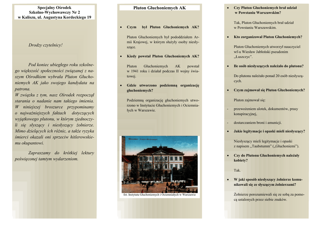 Pluton Głuchoniemych AK Specjalny Ośrodek Szkolno-Wychowawczy Nr 2 w Kaliszu, ul. Augustyna Kordeckiego 19 Gdzie utworzono podziemną organizację głuchoniemych? Podziemną organizację głuchoniemych utworzono w Instytucie Głuchoniemych i Ociemniałych w Warszawie. Kto zorganizował Pluton Głuchoniemych? Pluton Głuchoniemych utworzył nauczyciel wf-u Wiesław Jabłoński pseudonim ,,Łuszczyc”. Kiedy powstał Pluton Głuchoniemych AK? Pluton Głuchoniemych AK powstał w 1941 roku i działał podczas II wojny światowej. Czy Pluton Głuchoniemych brał udział w Powstaniu Warszawskim? Tak, Pluton Głuchoniemych brał udział w Powstaniu Warszawskim. był Pluton Głuchoniemych AK? Pluton Głuchoniemych był pododdziałem Armii Krajowej, w którym służyły osoby niesłyszące. Drodzy czytelnicy! Pod koniec ubiegłego roku szkolnego większość społeczności związanej z naszym Ośrodkiem wybrała Pluton Głuchoniemych AK jako swojego kandydata na patrona. W związku z tym, nasz Ośrodek rozpoczął starania o nadanie nam takiego imienia. W niniejszej broszurce przypominamy o najważniejszych faktach dotyczących wyjątkowego plutonu, w którym zjednoczyli się słyszący i niesłyszący żołnierze. Mimo dzielących ich różnic, a także ryzyka śmierci okazali oni sprzeciw hitlerowskiemu okupantowi. Czym Ile osób niesłyszących należało do plutonu? Do plutonu należało ponad 20 osób niesłyszących. Czym zajmował się Pluton Głuchoniemych? Pluton zajmował się: - przewożeniem ulotek, dokumentów, prasy konspiracyjnej, - dostarczaniem broni i amunicji. Jakie legitymacje i opaski mieli niesłyszący? Niesłyszący mieli legitymacje i opaski z napisem ,,Taubstumm” („Głuchoniemi”). Zapraszamy do krótkiej lektury poświęconej tamtym wydarzeniom. Czy do Plutonu Głuchoniemych należały kobiety? Tak. fot. Instytutu Głuchoniemych i Ociemniałych w Warszawie W jaki sposób niesłyszący żołnierze komunikowali się ze słyszącym żołnierzami? Żołnierze porozumiewali się ze sobą za pomocą ustalonych przez siebie znaków. Co znajduje się na odznace Plutonu Głuchoniemych AK? Odznaka plutonu jest w kształcie krzyża. Znajdują się na niej: - ucho (międzynarodowy symbol głuchych), - znak Polski Walczącej, - nazwa Armii Krajowej w skrócie (AK), - rok rozpoczęcia i zakończenia II wojny światowej (1939 – 1945). Imiona i nazwiska niesłyszących żołnierzy Plutonu Głuchoniemych AK: Bałdecki Wacław „Żubr” Bednarzewski Władysław „ Orzeł” Bedyński Janusz ,,Sekund” Chruściel Bolesław „Kot” Czarnecki Stefan „Omega” Gajda Stanisław „Gaj” Gora Edward ,,Mały”, ,,Cichy” Goruch Jan ,,Mały Jasio” Klimczewski Jan „Tajemniczy” Kozyrew Mikołaj „Bohun” Lubomski Mieczysław „Dzik” Maciejczyk Jan „Jastrząb” Malinowski Edmund „Mundek” Obrycki Jerzy „Bim” Ostachiewicz Henryk „Zorys” Purska- Goszczyńska Zofia „Zośka” Kto z niesłyszących żołnierzy otrzymał order od prezydenta? Od prezydenta Rzeczypospolitej Polskiej ordery otrzymali: Janusz Jerzy Bedyński, Edward Gora, Jan Goruch, Jadwiga Smoczkiewicz, Karol Stefaniak. Słojkowski Tadeusz „Tygrys” Sopyło Jan „Igła” Stec- Smoczkiewicz Jadwiga „Jaskółka” Stefaniak Karol ,,Kajtek” Sułowski Kazimierz „Czuwaj” Szyszkowski Wacław „US” Włostowski Kazimierz „Igo” Pluton Głuchoniemych AK
