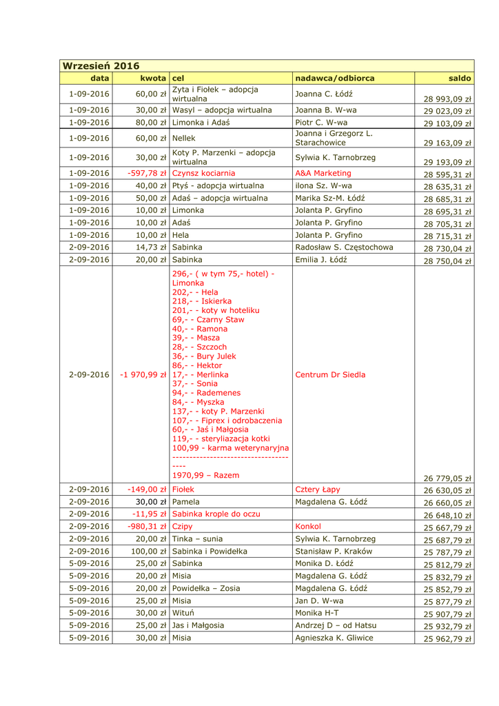 Wrzesień 2016 data 1-09-2016 kwota cel Zyta i Fiołek – adopcja 60,00 zł wirtualna 30,00 zł Wasyl – adopcja wirtualna 1-09-2016 80,00 zł Limonka i Adaś 1-09-2016 60,00 zł Nellek 1-09-2016 1-09-2016 Koty P. Marzenki – adopcja 30,00 zł wirtualna -597,78 zł Czynsz kociarnia 1-09-2016 1-09-2016 1-09-2016 nadawca/odbiorca Joanna C. Łódź saldo 28 993,09 zł Joanna B. W-wa 29 023,09 zł Piotr C. W-wa Joanna i Grzegorz L. Starachowice 29 103,09 zł Sylwia K. Tarnobrzeg 29 163,09 zł 29 193,09 zł A&A Marketing 28 595,31 zł 40,00 zł Ptyś - adopcja wirtualna ilona Sz. W-wa 28 635,31 zł 50,00 zł Adaś – adopcja wirtualna Marika Sz-M. Łódź 28 685,31 zł 1-09-2016 10,00 zł Limonka Jolanta P. Gryfino 28 695,31 zł 1-09-2016 10,00 zł Adaś Jolanta P. Gryfino 28 705,31 zł 1-09-2016 10,00 zł Hela Jolanta P. Gryfino 28 715,31 zł 2-09-2016 14,73 zł Sabinka Radosław S. Częstochowa 28 730,04 zł 2-09-2016 20,00 zł Sabinka Emilia J. Łódź 28 750,04 zł 2-09-2016 2-09-2016 2-09-2016 2-09-2016 2-09-2016 2-09-2016 2-09-2016 296,- ( w tym 75,- hotel) Limonka 202,- - Hela 218,- - Iskierka 201,- - koty w hoteliku 69,- - Czarny Staw 40,- - Ramona 39,- - Masza 28,- - Szczoch 36,- - Bury Julek 86,- - Hektor Centrum Dr Siedla -1 970,99 zł 17,- - Merlinka 37,- - Sonia 94,- - Rademenes 84,- - Myszka 137,- - koty P. Marzenki 107,- - Fiprex i odrobaczenia 60,- - Jaś i Małgosia 119,- - steryliazacja kotki 100,99 - karma weterynaryjna ------------------------------------1970,99 – Razem -149,00 zł Fiołek 30,00 zł Pamela 26 630,05 zł Magdalena G. Łódź 26 660,05 zł -11,95 zł Sabinka krople do oczu -980,31 zł Czipy 20,00 zł Tinka – sunia 100,00 zł Sabinka i Powidełka 26 779,05 zł Cztery Łapy 26 648,10 zł Konkol 25 667,79 zł Sylwia K. Tarnobrzeg 25 687,79 zł Stanisław P. Kraków 25 787,79 zł 5-09-2016 25,00 zł Sabinka Monika D. Łódź 25 812,79 zł 5-09-2016 20,00 zł Misia Magdalena G. Łódź 25 832,79 zł 5-09-2016 20,00 zł Powidełka – Zosia Magdalena G. Łódź 25 852,79 zł 5-09-2016 25,00 zł Misia Jan D. W-wa 25 877,79 zł 5-09-2016 30,00 zł Wituń Monika H-T 25 907,79 zł 5-09-2016 25,00 zł Jas i Małgosia Andrzej D – od Hatsu 25 932,79 zł 5-09-2016 30,00 zł Misia Agnieszka K. Gliwice 25 962,79 zł 5-09-2016 30,00 zł Powidełka – Zosia Agnieszka K. Gliwice 25 992,79 zł 6-09-2016 20,00 zł Powidełka – Zosia Agnieszka D. Jarocin 26 012,79 zł 6-09-2016 40,00 zł Fiołek Joanna Z. Koszalin 26 052,79 zł 6-09-2016 80,00 zł Powidełka – Zosia Katarzyna K. W-wa 26 132,79 zł 6-09-2016 70,00 zł Tosia i Mela Emilia J. Łódź 26 202,79 zł 6-09-2016 20,00 zł Misia Grażyna P. Mysłowice 26 222,79 zł 6-09-2016 10,00 zł Merlinka – b.Sis Joanna N. 26 232,79 zł 6-09-2016 50,00 zł Powidełka – Zosia Małgorzata K. W-wa 26 282,79 zł 6-09-2016 50,00 zł Misia Dąbrówka O. Ostróda 26 332,79 zł 6-09-2016 10,00 zł Powidełka – Zosia Natalia P. Przecław 26 342,79 zł 20,00 zł Kot po wypadku Martyna W. Łódź 26 362,79 zł Animal 26 290,59 zł 6-09-2016 6-09-2016 6-09-2016 6-09-2016 7-09-2016 7-09-2016 -72,20 zł Iskierka Karma dla Merlinki i dt -392,28 zł pandadp 20,00 zł Powidełka – Zosia Na koty: Powidełka, kociak z 200,00 zł wypadku 60,00 zł Powidełka – Zosia Zooplus Helena B. Katowice Kamila L-N Świdwin 25 898,31 zł 25 918,31 zł 26 118,31 zł Sławomir N. Bolesławiec 26 178,31 zł 7-09-2016 47,92 zł Kociak z wypadku Stanisław P. Kraków 26 226,23 zł 7-09-2016 30,00 zł Hela - adopcja wirtualna anonimowy darczyńca 26 256,23 zł 7-09-2016 30,00 zł Ptys – adopcja wirtualna Justyna H. Łódź 26 286,23 zł Edyta W. Gdynia 26 291,23 zł 7-09-2016 5,00 zł Jaś i Małgosia 7-09-2016 25,00 zł kociak po wypadku Joanna N. 26 316,23 zł 8-09-2016 30,00 zł Powidełka – Zosia Elżbieta W. Dobra 26 346,23 zł 8-09-2016 15,00 zł Powidełka – Zosia Iwona W. W-wa 26 361,23 zł 8-09-2016 10,00 zł Powidełka – Zosia Marzena R. Łódź 26 371,23 zł 8-09-2016 Radosław S. Częstochowa 26 390,70 zł 8-09-2016 925,00 zł Sabinka zbiórka Pomagam.pl 27 315,70 zł 8-09-2016 356,12 zł Iskierka zbiórka Pomagam.pl 27 671,82 zł zbiórka Pomagam.pl 27 718,07 zł 8-09-2016 19,47 zł Dymek – kociak po wypadku 46,25 zł Rademenes 8-09-2016 702,99 zł Hektor zbiórka Pomagam.pl 28 421,06 zł 9-09-2016 100,00 zł Dymek – kociak po wypadku Agnieszka G. Gałków Duży 28 521,06 zł 9-09-2016 Kociaki ze schronu, Merlinka, 500,00 zł Powidełka, Dymek, Rademenes Aleksander B. - PayPal 9-09-2016 140,00 zł Koty Starszego Pana anonimowy darczyńca 29 161,06 zł 9-09-2016 Leczenie kotów: kociaki ze 200,00 zł schronu, z Rybnej, z Dąbrowy, anonimowy darczyńca Lily 29 361,06 zł 9-09-2016 150,00 zł Sabinka anonimowy darczyńca 29 511,06 zł 9-09-2016 30,00 zł Sugar Ewa L. Łódź 29 541,06 zł 9-09-2016 30,00 zł Fiołek Ewa L. Łódź 29 571,06 zł Ewa L. Łódź 29 616,06 zł 9-09-2016 10-09-2016 12-09-2016 45,00 zł Merlinka Żwir – 150,- i karma do -360,12 zł kociarni Kotyliona 50,00 zł Koty z Sokolnik 29 021,06 zł Zooplus 29 255,94 zł Aneta K. Zgierz 29 305,94 zł 12-09-2016 20,00 zł Zosia Powidełka Valentina P. Poznań 29 325,94 zł 12-09-2016 15,00 zł Zosia Powidełka Sebastian R. Kolonia Góra P. 29 340,94 zł 12-09-2016 10,00 zł Zosia Powidełka Agnieszka S. Czeladź 29 350,94 zł 12-09-2016 30,00 zł Zyta – adopcja wirtualna Agnieszka M. Piotrków 29 380,94 zł 12-09-2016 250,00 zł Dymek – kociak po wypadku Agnieszka P-S. Łódź – Vege 29 630,94 zł 12-09-2016 15,00 zł Zosia Powidełka 100 – Nellek, 100 – kociaki ze 200,00 zł schronu 20,00 zł Zosia Powidełka Kamila K. Ruda śl. 29 645,94 zł 12-09-2016 13-09-2016 Anetta K. Łódź – Vege 29 845,94 zł Monika Ć. Chwiram 29 865,94 zł 29 925,94 zł 13-09-2016 60,00 zł Czarni Bracia z Sokolnik Kalina, Krzysztof, Janusz Z. 13-09-2016 75,00 zł Zosia Powidełka Elżbieta K. Łódź 30 000,94 zł Dorota P. Łódź – Vege 30 300,94 zł Agnieszka