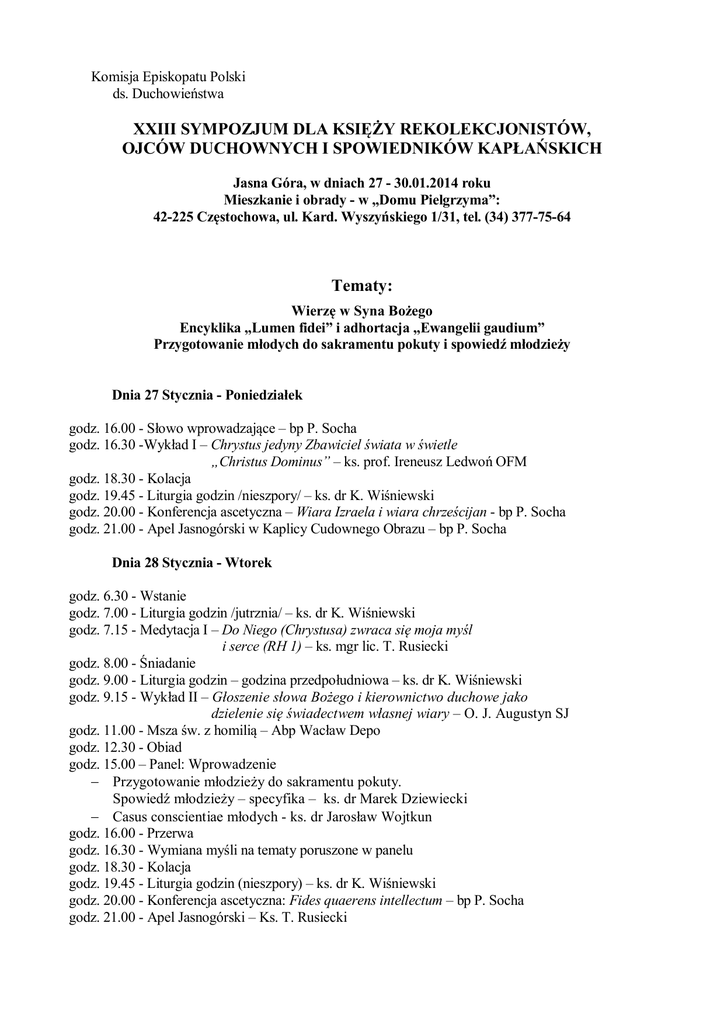 Komisja Episkopatu Polski ds. Duchowieństwa XXIII SYMPOZJUM DLA KSIĘŻY REKOLEKCJONISTÓW, OJCÓW DUCHOWNYCH I SPOWIEDNIKÓW KAPŁAŃSKICH Jasna Góra, w dniach 27 - 30.01.2014 roku Mieszkanie i obrady - w „Domu Pielgrzyma”: 42-225 Częstochowa, ul. Kard. Wyszyńskiego 1/31, tel. (34) 377-75-64 Tematy: Wierzę w Syna Bożego Encyklika „Lumen fidei” i adhortacja „Ewangelii gaudium” Przygotowanie młodych do sakramentu pokuty i spowiedź młodzieży Dnia 27 Stycznia - Poniedziałek godz. 16.00 - Słowo wprowadzające – bp P. Socha godz. 16.30 -Wykład I – Chrystus jedyny Zbawiciel świata w świetle „Christus Dominus” – ks. prof. Ireneusz Ledwoń OFM godz. 18.30 - Kolacja godz. 19.45 - Liturgia godzin /nieszpory/ – ks. dr K. Wiśniewski godz. 20.00 - Konferencja ascetyczna – Wiara Izraela i wiara chrześcijan - bp P. Socha godz. 21.00 - Apel Jasnogórski w Kaplicy Cudownego Obrazu – bp P. Socha Dnia 28 Stycznia - Wtorek godz. 6.30 - Wstanie godz. 7.00 - Liturgia godzin /jutrznia/ – ks. dr K. Wiśniewski godz. 7.15 - Medytacja I – Do Niego (Chrystusa) zwraca się moja myśl i serce (RH 1) – ks. mgr lic. T. Rusiecki godz. 8.00 - Śniadanie godz. 9.00 - Liturgia godzin – godzina przedpołudniowa – ks. dr K. Wiśniewski godz. 9.15 - Wykład II – Głoszenie słowa Bożego i kierownictwo duchowe jako dzielenie się świadectwem własnej wiary – O. J. Augustyn SJ godz. 11.00 - Msza św. z homilią – Abp Wacław Depo godz. 12.30 - Obiad godz. 15.00 – Panel: Wprowadzenie Przygotowanie młodzieży do sakramentu pokuty. Spowiedź młodzieży – specyfika – ks. dr Marek Dziewiecki Casus conscientiae młodych - ks. dr Jarosław Wojtkun godz. 16.00 - Przerwa godz. 16.30 - Wymiana myśli na tematy poruszone w panelu godz. 18.30 - Kolacja godz. 19.45 - Liturgia godzin (nieszpory) – ks. dr K. Wiśniewski godz. 20.00 - Konferencja ascetyczna: Fides quaerens intellectum – bp P. Socha godz. 21.00 - Apel Jasnogórski – Ks. T. Rusiecki 2 Dnia 29 Stycznia - Środa godz. 6.30 - Wstanie godz. 7.00 - Liturgia godzin – ks. dr K. Wiśniewski godz. 7.15 - Medytacja II – Kapłan bez Chrystusa Odkupiciela jest niezrozumiały dla siebie i dla innych (RH 10) – ks. T. Rusiecki godz. 8.00 - Śniadanie godz. 9.00 - Liturgia godzin – ks. dr K. Wiśniewski godz. 9.15 - Wykład III – Tajemnica Wcielenia – ks. dr Antoni Nadbrzeżny godz. 11.00 - Msza św. z homilią – bp P. Socha godz. 12.30 - Obiad godz. 15.00 - Nabożeństwo pokutne – ks. dr K. Wiśniewski godz. 15.45 - Adoracja Najść. Sakramentu i okazja do Spowiedzi św. godz. 17.45 - Modlitwa różańcowa przed Najśw. Sakramentem i błogosławieństwo godz. 18.30 - Kolacja godz. 19.45 - Liturgia godzin /nieszpory/ – ks. dr K. Wiśniewski godz. 20.00 - Konferencja ascetyczna: Radość ewangelizowania według adhortacji papieża Franciszka „Ewangelii Kaudium” – abp Stanisław Nowak godz. 21.00 - Apel Jasnogórski – Abp Stanisław Nowak Dnia 30 Stycznia – Czwartek godz. 6.30 - Wstanie godz. 7.00 - Liturgia godzin /jutrznia/ godz. 7.15 - Medytacja III – Służyć i królować na wór Chrystusa – ks. dr T. Rusiecki godz. 8.00 - Śniadanie godz. 9.00 - Liturgia godzin - godzina ranna – ks. dr K. Wiśniewski godz. 9.15 - Wykład IV: Teologia Wcielenia według św. Leona Wielkiego – ks. dr Adam Wilczyński godz. 11.00 - Msza św. z homilią – abp Stanisław Nowak godz. 12.30 - Obiad i rozjazd Uwaga: 1. Odpowiedzialny za liturgię godzin – ks. dr Krzysztof Wiśniewski 2. Do udziału w Sympozjum zapraszamy: - PT Ojców Duchownych Diecezjalnych i Dekanalnych, - Rekolekcjonistów, głoszących konferencje dla kapłanów - Spowiedników kapłanów i osób konsekrowanych oraz - Kapłanów zainteresowanych problematyką podaną w programie. 3. Obrady i ćwiczenia duchowne odbywają się w kaplicy Domu Pielgrzyma. 4. Noclegi należy zamawiać w Domu Pielgrzyma, w Hospicjum lub innym domu dostępnym w pobliżu Jasnej Góry. 5. Ze względu na charakter ściśle modlitewny i formacyjny Sympozjum, Kapłani uczestniczący w nim mogą uzyskać zaświadczenie o odprawionych rekolekcjach kapłańskich. + Paweł Socha 65-508 Zielona Góra ul. Kilińskiego 9 Tel. kom. +48 606 854 204 Z upoważnienia: Przewodniczącego Komisji Episkopatu. ds. Duchowieństwa, Jego Eminencji Stanisława Kardynała Dziwisza