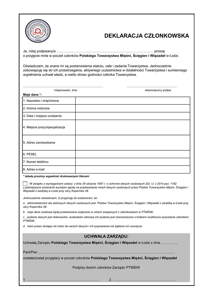 DEKLARACJA CZŁONKOWSKA Ja, niżej podpisany/a ……………………………………………………………………….. proszę o przyjęcie mnie w poczet członków Polskiego Towarzystwa Mięśni, Ścięgien i Więzadeł w Łodzi. Oświadczam, że znane mi są postanowienia statutu, cele i zadania Towarzystwa. Jednocześnie zobowiązuję się do ich przestrzegania, aktywnego uczestnictwa w działalności Towarzystwa i sumiennego wypełniania uchwał władz, a nadto strzec godności członka Towarzystwa. ……………...…………………………………………… ……………………………………. miejscowość, dnia wlasnoręczny podpis Moje dane *: 1. Nazwisko i imię/imiona 2. Imiona rodziców 3. Data i miejsce urodzenia 4. Miejsce pracy/specjalizacja 5. Adres zamieszkania 6. PESEL 7. Numer telefonu 8. Adres e-mail * tabelę prosimy wypełniać drukowanymi literami W związku z wymaganiami ustawy z dnia 29 sierpnia 1997 r. o ochronie danych osobowych (Dz. U. z 2014 poz. 1182 z późniejszymi zmianami) wyrażam zgodę na przetwarzanie moich danych osobowych przez Polskie Towarzystwo Mięśni, Ścięgien i Więzadeł z siedzibą w Łodzi przy ulicy Kopernika 38. Jednocześnie oświadczam, iż przyjmuję do wiadomości, że: a. administratorem tak zebranych danych osobowych jest Polskie Towarzystwo Mięśni, Ścięgien i Więzadeł z siedzibą w Łodzi przy ulicy Kopernika 38; b. moje dane osobowe będą przetwarzane wyłącznie w celach związanych z członkostwem w PTMŚiW; c. podanie danych jest dobrowolne, aczkolwiek odmowa ich podania jest równoznaczna z brakiem możliwości pozostania członkiem PTMŚiW; d. mam prawo dostępu do treści do swoich danych i ich poprawiania lub żądania ich usunięcia. UCHWAŁA ZARZĄDU: Uchwałą Zarządu Polskiego Towarzystwa Mięśni, Ścięgien i Więzadeł w Łodzi z dnia ……...…… Pani/Pan ……...……………………………………………………………………………………………… została/został przyjęta/y w poczet członków Polskiego Towarzystwa Mięśni, Ścięgien i Więzadeł Podpisy dwóch członków Zarządu PTMŚiW 1. …………………………………………………….. 2. ………………………………………………