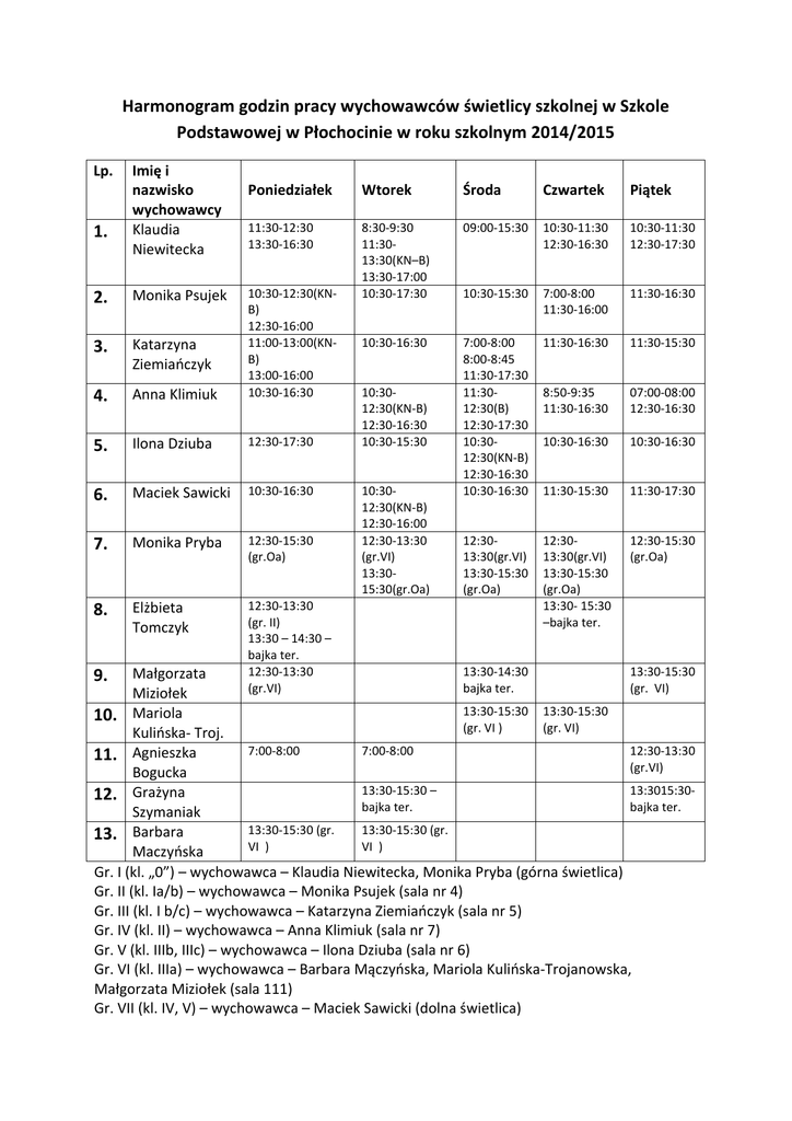 Harmonogram godzin pracy wychowawców świetlicy szkolnej w