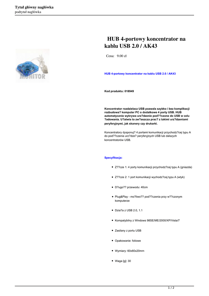 Tytuł główny nagłówka podtytuł nagłówka HUB 4-portowy koncentrator na kablu USB 2.0 / AK43 Cena: 9.00 zł HUB 4-portowy koncentrator na kablu USB 2.0 / AK43 Kod produktu: 018949 Koncentrator rozdzielacz USB pozwala szybko i bez komplikacji rozbudowa? komputer PC o dodatkowe 4 porty USB. HUB automatycznie wykrywa urz?dzenie pod??czone do USB w celu ?adowania. U?atwia to zw?aszcza prac? z takimi urz?dzeniami peryferyjnymi, jak skanery czy drukarki. Koncentratory dysponuj? 4 portami komunikacji przychodz?cej typu A do pod??czenia urz?dze? peryferyjnych USB lub dalszych koncentratorów USB. Specyfikacja: Z??cze 1: 4 porty komunikacji przychodz?cej typu A (gniazda) Z??cze 2: 1 port komunikacji wychodz?cej typu A (wtyk) D?ugo?? przewodu: 40cm Plug&Play - mo?liwo?? pod??czenia przy w??czonym komputerze Dzia?a z USB 2.0, 1.1 Kompatybilny z Windows 98SE/ME/2000/XP/Vista/7 Zasilany z portu USB Opakowanie: foliowe Wymiary: 60x60x20mm Waga [g]: 30 1/2 Tytuł główny nagłówka podtytuł nagłówka Jednostka miary: sztuka Szczegóły Rodzaje przyłączy Akcesoria komputerowe USB - USB huby 2/2 Powered by TCPDF (www.tcpdf.org)