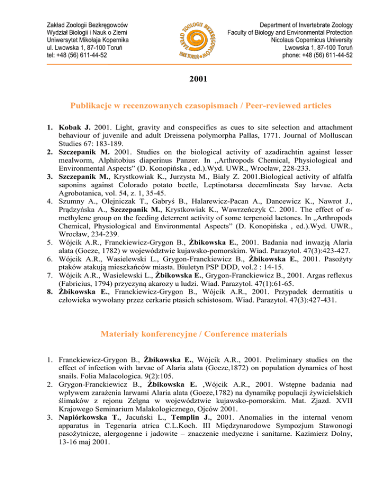 Zakład Zoologii Bezkręgowców Wydział Biologii i Nauk o Ziemi Uniwersytet Mikołaja Kopernika ul. Lwowska 1, 87-100 Toruń tel: +48 (56) 611-44-52 Department of Invertebrate Zoology Faculty of Biology and Environmental Protection Nicolaus Copernicus University Lwowska 1, 87-100 Toruń phone: +48 (56) 611-44-52 2001 Publikacje w recenzowanych czasopismach / Peer-reviewed articles 1. Kobak J. 2001. Light, gravity and conspecifics as cues to site selection and attachment behaviour of juvenile and adult Dreissena polymorpha Pallas, 1771. Journal of Molluscan Studies 67: 183-189. 2. Szczepanik M. 2001. Studies on the biological activity of azadirachtin against lesser mealworm, Alphitobius diaperinus Panzer. In „Arthropods Chemical, Physiological and Environmental Aspects” (D. Konopińska , ed.).Wyd. UWR., Wrocław, 228-233. 3. Szczepanik M., Krystkowiak K., Jurzysta M., Biały Z. 2001.Biological activity of alfalfa saponins against Colorado potato beetle, Leptinotarsa decemlineata Say larvae. Acta Agrobotanica, vol. 54, z. 1, 35-45. 4. Szumny A., Olejniczak T., Gabryś B., Halarewicz-Pacan A., Dancewicz K., Nawrot J., Prądzyńska A., Szczepanik M., Krystkowiak K., Wawrzeńczyk C. 2001. The effect of αmethylene group on the feeding deterrent activity of some terpenoid lactones. In „Arthropods Chemical, Physiological and Environmental Aspects” (D. Konopińska , ed.).Wyd. UWR., Wrocław, 234-239. 5. Wójcik A.R., Franckiewicz-Grygon B., Żbikowska E., 2001. Badania nad inwazją Alaria alata (Goeze, 1782) w województwie kujawsko-pomorskim. Wiad. Parazytol. 47(3):423-427. 6. Wójcik A.R., Wasielewski L., Grygon-Franckiewicz B., Żbikowska E., 2001. Pasożyty ptaków atakują mieszkańców miasta. Biuletyn PSP DDD, vol.2 : 14-15. 7. Wójcik A.R., Wasielewski L., Żbikowska E., Grygon-Franckiewicz B., 2001. Argas reflexus (Fabricius, 1794) przyczyną akarozy u ludzi. Wiad. Parazytol. 47(1):61-65. 8. Żbikowska E., Franckiewicz-Grygon B., Wójcik A.R., 2001. Przypadek dermatitis u człowieka wywołany przez cerkarie ptasich schistosom. Wiad. Parazytol. 47(3):427-431. Materiały konferencyjne / Conference materials 1. Franckiewicz-Grygon B., Żbikowska E., Wójcik A.R., 2001. Preliminary studies on the effect of infection with larvae of Alaria alata (Goeze,1872) on population dynamics of host snails. Folia Malacologica. 9(2):105. 2. Grygon-Franckiewicz B., Żbikowska E. ,Wójcik A.R., 2001. Wstępne badania nad wpływem zarażenia larwami Alaria alata (Goeze,1782) na dynamikę populacji żywicielskich ślimaków z rejonu Zelgna w województwie kujawsko-pomorskim. Mat. Zjazd. XVII Krajowego Seminarium Malakologicznego, Ojców 2001. 3. Napiórkowska T., Jacuński L., Templin J., 2001. Anomalies in the internal venom apparatus in Tegenaria atrica C.L.Koch. III Międzynarodowe Sympozjum Stawonogi pasożytnicze, alergogenne i jadowite – znaczenie medyczne i sanitarne. Kazimierz Dolny, 13-16 maj 2001. Zakład Zoologii Bezkręgowców Wydział Biologii i Nauk o Ziemi Uniwersytet Mikołaja Kopernika ul. Lwowska 1, 87-100 Toruń tel: +48 (56) 611-44-52 Department of Invertebrate Zoology Faculty of Biology and Environmental Protection Nicolaus Copernicus University Lwowska 1, 87-100 Toruń phone: +48 (56) 611-44-52 4. Poznańska M., 2001: Makrozoobentos pelofilny płytkich siedlisk południowej części Jeziora Jeziorak. Materiały Zjazdowe: VIII Ogólnopolskie Warsztaty Bentologiczne, Warszawa – Mikołajki: 31. Poster. 5. Szczepanik M. 2001. Studies on the biological activity of azadirachtin against lesser mealworm, Alphitobius diaperinus Panzer. Materiały zjazdowe III-rd International Conference on Arthropods: Chemical, Physiological and Environmental Aspects. Lądek Zdrój, 23-28.09 2001, p. 18. 6. Szczepanik M., Krystkowiak K., Jurzysta M., Biały Z. 2001. Aktywność biologiczna saponin lucerny siewnej (Medicago sativa L.) wobec larw stonki ziemniaczanej, Leptinotarsa decemlineata Say. Mat. Zjazd. XLI Sesji Naukowej Instytutu Ochrony Roślin, 8-9 luty 2001. Streszczenia, 183. 7. Szumny A., Olejniczak T., Gabrys B., Halarewicz-Pacan A., Dancewicz K., Nawrot J., Prądzyńska A., Szczepanik M., Krystkowiak K., Wawrzeńczyk C. 2001. The effect of αmethylene group on the feeding deterrent activity of some terpenoid lactones. Materiały zjazdowe III-rd International Conference on Arthropods: Chemical, Physiological and Environmental Aspects. Lądek Zdrój, 23-28.09 2001, p. 15. 8. Templin J., Jacuński L., Napiórkowska T., 2001. Teratological changes in the external venom apparatus of Tegenaria atrica C.L.Koch. III Międzynarodowe Sympozjum Stawonogi pasożytnicze, alergogenne i jadowite – znaczenie medyczne i sanitarne. Kazimierz Dolny, 13-16 maj 2001. 9. Żbikowska E. 2001. Selection of thermal microhabitats by Lymnaea stagnalis under experimental conditions. Folia Malacologica. 9(2):1. 10. Żbikowska E., 2001. Bird schistosomes in Lymnaea stagnalis (L.) and Planorbarius corneus (L.) from selected lakes in Poland. Helminthologia vol.38 (4):24. 11. Żbikowska E., 2001. Initial studies on the thermal behaviour of the Lymnaea stagnalis (L.) individuals infected with Digenea larvae. Helminthologia 38 (4):210. 12. Żbikowska E., 2001. Wybór mikrośrodowisk termicznych przez osobniki Lymnaea stagnalis w warunkach eksperymentalnych. Mat. Zjazd. XVII Krajowego Seminarium Malakologicznego, Ojców 2001.