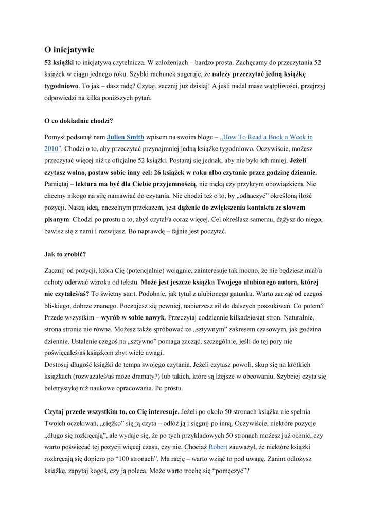 O inicjatywie 52 książki to inicjatywa czytelnicza. W założeniach – bardzo prosta. Zachęcamy do przeczytania 52 książek w ciągu jednego roku. Szybki rachunek sugeruje, że należy przeczytać jedną książkę tygodniowo. To jak – dasz radę? Czytaj, zacznij już dzisiaj! A jeśli nadal masz wątpliwości, przejrzyj odpowiedzi na kilka poniższych pytań. O co dokładnie chodzi? Pomysł podsunął nam Julien Smith wpisem na swoim blogu – „How To Read a Book a Week in 2010″. Chodzi o to, aby przeczytać przynajmniej jedną książkę tygodniowo. Oczywiście, możesz przeczytać więcej niż te oficjalne 52 książki. Postaraj się jednak, aby nie było ich mniej. Jeżeli czytasz wolno, postaw sobie inny cel: 26 książek w roku albo czytanie przez godzinę dziennie. Pamiętaj – lektura ma być dla Ciebie przyjemnością, nie męką czy przykrym obowiązkiem. Nie chcemy nikogo na siłę namawiać do czytania. Nie chodzi też o to, by „odhaczyć” określoną ilość pozycji. Naszą ideą, naczelnym przekazem, jest dążenie do zwiększenia kontaktu ze słowem pisanym. Chodzi po prostu o to, abyś czytał/a coraz więcej. Cel określasz samemu, dążysz do niego, bawisz się z nami i rozwijasz. Bo naprawdę – fajnie jest poczytać. Jak to zrobić? Zacznij od pozycji, która Cię (potencjalnie) wciągnie, zainteresuje tak mocno, że nie będziesz miał/a ochoty oderwać wzroku od tekstu. Może jest jeszcze książka Twojego ulubionego autora, której nie czytałeś/aś? To świetny start. Podobnie, jak tytuł z ulubionego gatunku. Warto zacząć od czegoś bliskiego, dobrze znanego. Poczujesz się pewniej, nabierzesz sił do dalszych poszukiwań. Co potem? Przede wszystkim – wyrób w sobie nawyk. Przeczytaj codziennie kilkadziesiąt stron. Naturalnie, strona stronie nie równa. Możesz także spróbować ze „sztywnym” zakresem czasowym, jak godzina dziennie. Ustalenie czegoś na „sztywno” pomaga zacząć, szczególnie, jeśli do tej pory nie poświęcałeś/aś książkom zbyt wiele uwagi. Dostosuj długość książki do tempa swojego czytania. Jeżeli czytasz powoli, skup się na krótkich książkach (rozważałeś/aś może dramaty?) lub takich, które są lżejsze w obcowaniu. Szybciej czyta się beletrystykę niż naukowe opracowania. Po prostu. Czytaj przede wszystkim to, co Cię interesuje. Jeżeli po około 50 stronach książka nie spełnia Twoich oczekiwań, „ciężko” się ją czyta – odłóż ją i sięgnij po inną. Oczywiście, niektóre pozycje „długo się rozkręcają”, ale wydaje się, że po tych przykładowych 50 stronach możesz już ocenić, czy warto poświęcać tej pozycji więcej czasu, czy nie. Chociaż Robert zauważył, że niektóre książki rozkręcają się dopiero po “100 stronach”. Ma rację – warto wziąć to pod uwagę. Zanim odłożysz książkę, zapytaj kogoś, czy ją poleca. Może warto trochę się “pomęczyć”? Popytaj przyjaciół o książki, co warte są lektury. Skoro trzymacie się razem, to bardzo możliwe, że macie podobny gust literacki. Polecenia znajomych, to chyba najłatwiejszy sposób na zbudowanie listy dobrych książek, które z przyjemnością przeczytasz. 52 książki? Co mi to da? Często słyszymy, że warto czytać. Ale – czy są jakieś konkretne korzyści, które z tego płyną? No i czemu akurat czytać 52 książki, realizować jakieś cele? Regularna lektura to przede wszystkim sposób na rozwój intelektualny, praca nad wyobraźnią. Oto lista kilku innych „rzeczy”, które możesz zyskać: większa kreatywność szersze horyzonty myślowe dobry sposób na spędzenie wolnego czasu większy zasób słownictwa lepszy warsztat pisarski przyjemność nowi znajomi – inni czytelnicy zadowolenie z siebie notka do pola „zainteresowania” w CV :] Nie wiesz co przeczytać? Nie masz pomysłu? A może chcesz się podzielić ciekawą książką, którą przeczytałeś/aś? Zajrzyj na naszą Facebookową Grupę Wsparcia. A teraz do czytania!