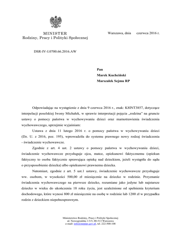 Warszawa, dnia MINIST ER Rodziny, Pracy i Polityki Społecznej czerwca 2016 r. DSR-IV-I.0700.66.2016.AW Pan Marek Kuchciński Marszałek Sejmu RP Odpowiadając na wystąpienie z dnia 9 czerwca 2016 r., znak: K8INT3857, dotyczące interpelacji poselskiej Iwony Michałek, w sprawie interpretacji pojęcia „rodzina” na gruncie ustawy o pomocy państwa w wychowywaniu dzieci oraz marnotrawienia świadczenia wychowawczego, uprzejmie wyjaśniam: Ustawa z dnia 11 lutego 2016 r. o pomocy państwa w wychowywaniu dzieci (Dz. U. z 2016, poz. 195), wprowadziła do systemu prawnego nowy rodzaj świadczenia - świadczenie wychowawcze. Zgodnie z art. 4 ust. 2 ustawy o pomocy państwa w wychowywaniu dzieci, świadczenie wychowawcze przysługuje ojcu, matce, opiekunowi faktycznemu (opiekun faktyczny to osoba faktycznie sprawująca opiekę nad dzieckiem, jeżeli wystąpiła do sądu o przysposobienie dziecka) albo opiekunowi prawnemu dziecka. Natomiast, zgodnie z art. 5 ust.1 ustawy, świadczenie wychowawcze przysługuje ww. osobom, w wysokości 500,00 zł miesięcznie na dziecko w rodzinie. Przyznanie świadczenia wychowawczego na pierwsze dziecko, rozumiane jako jedyne lub najstarsze dziecko w wieku do ukończenia 18 roku życia, jest uzależnione od spełnienia kryterium dochodowego, które wynosi 800 zł miesięcznie na osobę w rodzinie lub 1200 zł w przypadku rodzin z dzieckiem niepełnosprawnym. Ministerstwo Rodziny, Pracy i Polityki Społecznej ul. Nowogrodzka 1/3/5, 00-513 Warszawa e-mail: [email protected], tel. 222-500-108 W związku z powyższym, istotnym z punktu widzenia ustalenia prawa do świadczenia wychowawczego, jest zdefiniowanie rodziny oraz osób wchodzących w jej skład. Zgodnie z art. 2 pkt 16 ww. ustawy, rodzina oznacza odpowiednio: małżonków, rodziców dzieci, opiekuna faktycznego dziecka oraz zamieszkujące wspólnie z tymi osobami, pozostające na ich utrzymaniu dzieci w wieku do ukończenia 25. roku życia, a także dzieci, które ukończyły 25. rok życia, legitymujące się orzeczeniem o znacznym stopniu niepełnosprawności, jeżeli w związku z tą niepełnosprawnością przysługuje świadczenie pielęgnacyjne lub specjalny zasiłek opiekuńczy albo zasiłek dla opiekuna, o którym mowa w ustawie z dnia 4 kwietnia 2014 r. o ustaleniu i wypłacie zasiłków dla opiekunów (Dz. U. z 2016 r. poz. 162). Do członków rodziny nie zalicza się dziecka pozostającego pod opieką opiekuna prawnego, dziecka pozostającego w związku małżeńskim, a także pełnoletniego dziecka posiadającego własne dziecko. Zgodnie z ww. definicją, w skład rodziny wchodzą odpowiednio małżonkowie. Oznacza to, że jeśli osoba wnioskująca o świadczenie wychowawcze pozostaje w związku małżeńskim, to współmałżonek jest członkiem jej rodziny. Fakt ustanowienia rozdzielności majątkowej przez małżonków lub oddzielne zamieszkiwanie, nie skutkuje brakiem konieczności wskazania współmałżonka w składzie rodziny. Należy podkreślić, że orzeczony przez sąd rozwód małżonków, nie jest jedynym rozwiązaniem, którego efektem będzie brak obowiązku zaliczenia do rodziny drugiego (byłego) małżonka. Także uzyskanie, w drodze prawomocnego orzeczenia sądu, separacji, oznacza, że wnioskodawca nie podaje w składzie rodziny współmałżonka. W związku z powyższym, aby współmałżonek nie był wliczany do składu rodziny wnioskodawcy i tym samym aby dochód współmałżonka nie musiał być dokumentowany przez wnioskodawcę, niezbędne jest uregulowanie przez wnioskodawcę swojej sytuacji prawnej, choćby w postaci uzyskania sądowej separacji. Należy podkreślić, że powyższe regulacje nie są nowe ani niespotykane - analogiczne rozwiązania, stosowane przez gminne organy właściwe, funkcjonują od kilkunastu lat w ustawie o świadczeniach rodzinnych. Jak zostało wyżej wskazane, przyznanie świadczenia wychowawczego na pierwsze dziecko, rozumiane jako jedyne lub najstarsze dziecko w wieku do ukończenia 18 roku życia, jest uzależnione od spełnienia kryterium dochodowego. Ministerstwo Rodziny, Pracy i Polityki Społecznej ul. Nowogrodzka 1/3/5, 00-513 Warszawa e-mail: [email protected], tel. 222-500-108 2 Ustalając dochód rodziny, będący podstawą przyznania świadczenia wychowawczego na pierwsze dziecko, należy wziąć pod uwagę dochód wszystkich jej członków, w tym małżonków. W świetle ww. definicji rodziny, rodzic może uwzględnić dziecko w składzie rodziny, a w konsekwencji także wystąpić z wnioskiem o ustalenie prawa do świadczenia wychowawczego na to dziecko, jedynie, gdy łącznie spełnione zostaną dwie przesłanki: pozostawanie dziecka na utrzymaniu rodzica oraz wspólne zamieszkiwanie dziecka z rodzicem. Wyjątek od tej zasady wprowadza art. 2 pkt 16 zdanie trzecie ustawy, zgodnie z którym, w sytuacji, gdy dziecko, zgodnie z orzeczeniem sądu, jest pod opieką naprzemienną obojga rodziców rozwiedzionych lub żyjących w separacji lub żyjących w rozłączeniu, dziecko zalicza się jednocześnie do członków rodzin obydwojga rodziców. Opieka naprzemienna jest instytucją prawa rodzinnego pozwalającą na pozostawienie władzy rodzicielskiej i sprawowanie opieki nad dzieckiem, jego obojgu rodzicom. W takiej sytuacji, sąd orzekając o opiece wskazuje okresy, w jakich rodzice naprzemiennie będą zamieszkiwać z dzieckiem i sprawować nad nim opiekę, np. w oparciu o plan wychowawczy. I w tych okresach, na podstawie ustawy o pomocy państwa w wychowywaniu dzieci, każdemu z rodziców przysługuje odpowiednio świadczenie wychowawcze na dziecko objęte opieką naprzemienna. Natomiast nie stanowi opieki naprzemiennej sytuacja, gdy dziecko, zgodnie z orzeczeniem sądu, stale zamieszkuje z jednym z rodziców, a drugi rodzic ma jedynie ustalone w określonym wymiarze i okresie kontakty z dzieckiem. W świetle powyższego, w sytuacji, gdy rodzice są rozwiedzeni, pozostają w separacji lub rozłączeniu i nie sprawują orzeczo