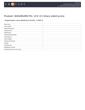 KM-Tune ul.Dmowskiego 1C 18-400 Łomża NIP 718-005-09-01 REGON 450020149 Tel +48 502 511 618, mail [email protected] Produkt: WASHBURN PXL 10 E (C) Gitary elektryczne Sugerowana cena detaliczna brutto: 3 640 zł o Powered by TCPDF (www.tcpdf.org) Ilość strun - Typ mostka - Materiał korpusu - Podstrunnica - Elektronika - Układ przetworników - Typ korpusu - Ilość progów - Układ instrumentu - Kształt - Typ łączenia - Nietypowy rozmiar - Gwarancja inna niż 24 (m-ce) -