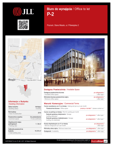 Biuro do wynajęcia / Office to let P-2 Poznań, Stare Miasto, ul. Półwiejska 2 Dostępna Powierzchnia / Available Space Informacje o Budynku / Building Information Status budynku / Building status Współczynnik miejsc parkingowych / Parking ratio Całkowita powierzchnia budynku / Total building area po zalogowaniu * / after login * Minimalna biurowa powierzchnia najmu / Minimum office space po zalogowaniu * / after login * Warunki Komercyjne / Commercial Terms Istniejący / Existing Rok budowy / Year of construction Powierzchnia wspólna / Common space Dostępna powierzchnia biurowa / Available office space 2015 Do potwierdzenia / To be confirmed 1 / 39 m² 15 270 m² COPYRIGHT © JLL IP, INC. 2017. All Rights Reserved Czynsz wywoławczy za m² za miesiąc / Asking rent per sq m per month Powierzchnia biurowa / Office space prosimy o kontakt * / please contact us * Czynsz za parking za miesiąc / Rent for parking per month Budynek garażowy dedykowane / Garage building dedicated Budynek garażowy niededykowane / Garage building non-dedicated po zalogowaniu * / after login * po zalogowaniu * / after login * Koszty eksploatacyjne za m² za miesiąc / Service charge per sq m per month po zalogowaniu * / after login * Minimalny okres najmu / Minimum lease term po zalogowaniu * / after login * Dostępność / Availability po zalogowaniu * / after login * W celu uzyskania dodatkowych informacji prosimy wejdź na For more information please click Dostępna Powierzchnia / Available Space Piętro / Floor Powierzchnia wolna / Vacant space Dostępność / Availability 0* prosimy o kontakt * / please contact us * prosimy o kontakt * / please contact us * 4 prosimy o kontakt * / please contact us * prosimy o kontakt * / please contact us * 5 prosimy o kontakt * / please contact us * prosimy o kontakt * / please contact us * Razem / Total po zalogowaniu * / after login * (*) Powierzchnia handlowa / Retail space Standardowe Wykończenie / Standard Fit-Out Klimatyzacja / Air conditioning Podnoszone podłogi / Raised floor Podwieszany sufit / Suspended ceiling Okablowanie telefoniczne / Telephone cabling Okablowanie komputerowe / Computer cabling Okablowanie elektryczne / Power cabling Tryskacze / Sprinklers Czujniki dymu / Smoke detectors Wykładzina / Carpeting Podział powierzchni ściankami / Wall partitioning Recepcja / Reception Ochrona budynku / Security Kable światłowodowe / Fiber optics Kontrola dostępu do budynku / Access control BMS / BMS W celu uzyskania dodatkowych informacji lub zorganizowania spotkania prosimy o kontakt: / For more information or to arrange a viewing please contact: +48 22 167 00 00 Niniejsze warunki mają charakter wyłącznie informacyjny i nie stanowią części wiążącej oferty lub umowy. / The Property Particulars are for information purposes only and do not form any part of binding offer or contract. COPYRIGHT © JLL IP, INC. 2017. All Rights Reserved W celu uzyskania dodatkowych informacji prosimy wejdź na For more information please click