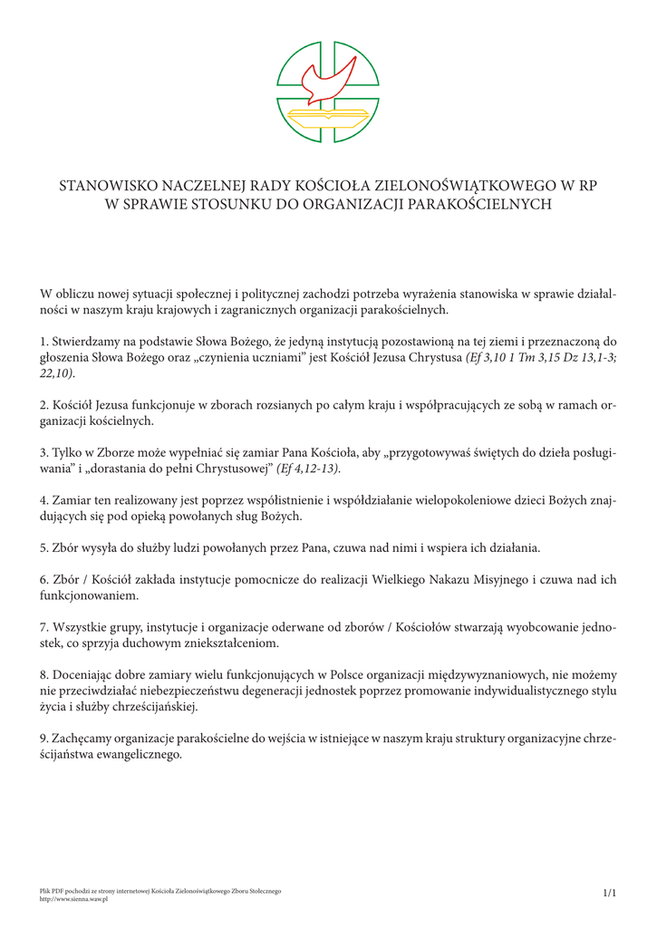 STANOWISKO NACZELNEJ RADY KOŚCIOŁA ZIELONOŚWIĄTKOWEGO W RP W SPRAWIE STOSUNKU DO ORGANIZACJI PARAKOŚCIELNYCH W obliczu nowej sytuacji społecznej i politycznej zachodzi potrzeba wyrażenia stanowiska w sprawie działalności w naszym kraju krajowych i zagranicznych organizacji parakościelnych. 1. Stwierdzamy na podstawie Słowa Bożego, że jedyną instytucją pozostawioną na tej ziemi i przeznaczoną do głoszenia Słowa Bożego oraz „czynienia uczniami” jest Kościół Jezusa Chrystusa (Ef 3,10 1 Tm 3,15 Dz 13,1-3; 22,10). 2. Kościół Jezusa funkcjonuje w zborach rozsianych po całym kraju i współpracujących ze sobą w ramach organizacji kościelnych. 3. Tylko w Zborze może wypełniać się zamiar Pana Kościoła, aby „przygotowywaś świętych do dzieła posługiwania” i „dorastania do pełni Chrystusowej” (Ef 4,12-13). 4. Zamiar ten realizowany jest poprzez współistnienie i współdziałanie wielopokoleniowe dzieci Bożych znajdujących się pod opieką powołanych sług Bożych. 5. Zbór wysyła do służby ludzi powołanych przez Pana, czuwa nad nimi i wspiera ich działania. 6. Zbór / Kościół zakłada instytucje pomocnicze do realizacji Wielkiego Nakazu Misyjnego i czuwa nad ich funkcjonowaniem. 7. Wszystkie grupy, instytucje i organizacje oderwane od zborów / Kościołów stwarzają wyobcowanie jednostek, co sprzyja duchowym zniekształceniom. 8. Doceniając dobre zamiary wielu funkcjonujących w Polsce organizacji międzywyznaniowych, nie możemy nie przeciwdziałać niebezpieczeństwu degeneracji jednostek poprzez promowanie indywidualistycznego stylu życia i służby chrześcijańskiej. 9. Zachęcamy organizacje parakościelne do wejścia w istniejące w naszym kraju struktury organizacyjne chrześcijaństwa ewangelicznego. Plik PDF pochodzi ze strony internetowej Kościoła Zielonoświątkowego Zboru Stołecznego http://www.sienna.waw.pl 1/1
