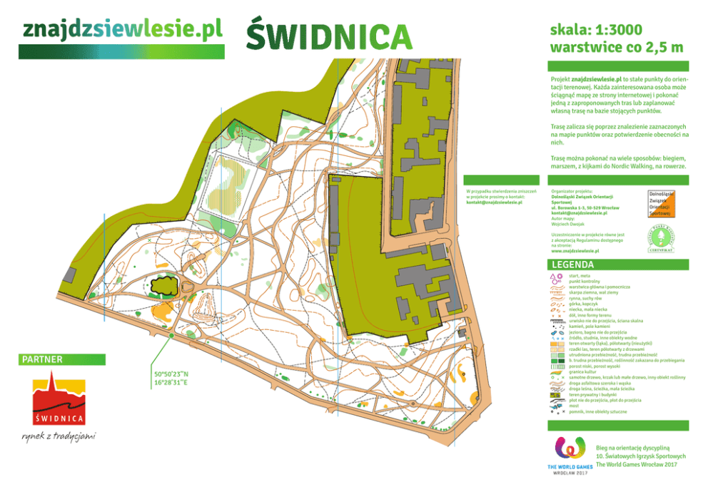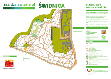 skala: 1:3000 warstwice co 2,5 m Projekt znajdzsiewlesie.pl to stałe punkty do orientacji terenowej. Każda zainteresowana osoba może ściągnąć mapę ze strony internetowej i pokonać jedną z zaproponowanych tras lub zaplanować własną trasę na bazie stojących punktów. Trasę zalicza się poprzez znalezienie zaznaczonych na mapie punktów oraz potwierdzenie obecności na nich. Trasę można pokonać na wiele sposobów: biegiem, marszem, z kijkami do Nordic Walking, na rowerze. W przypadku stwierdzenia zniszczeń w projekcie prosimy o kontakt: [email protected] Organizator projektu: Dolnośląski Związek Orientacji Sportowej ul. Borowska 1-3, 50-529 Wrocław [email protected] Autor mapy: Wojciech Dwojak Dolnośląski Związek Orientacji Sportowej Uczestniczenie w projekcie równe jest z akceptacją Regulaminu dostępnego na stronie: www.znajdzsiewlesie.pl LEGENDA PARTNER 50°50’23’’N 16°28’31’’E start, meta punkt kontrolny warstwica główna i pomocnicza skarpa ziemna, wał ziemy rynna, suchy rów górka, kopczyk niecka, mała niecka dół, inne formy terenu urwisko nie do przejścia, ściana skalna kamień, pole kamieni jezioro, bagno nie do przejścia źródło, studnia, inne obiekty wodne teren otwarty (łąka), półotwarty (nieużytki) rzadki las, teren półotwarty z drzewami utrudniona przebieżność, trudna przebieżność b. trudna przebieżność, roślinność zakazana do przebiegania porost niski, porost wysoki granica kultur samotne drzewo, krzak lub małe drzewo, inny obiekt roślinny droga asfaltowa szeroka i wąska droga leśna, ścieżka, mała ścieżka teren prywatny i budynki płot nie do przejścia, płot do przejścia most pomnik, inne obiekty sztuczne Bieg na orientację dyscypliną 10. Światowych Igrzysk Sportowych The World Games Wrocław 2017
