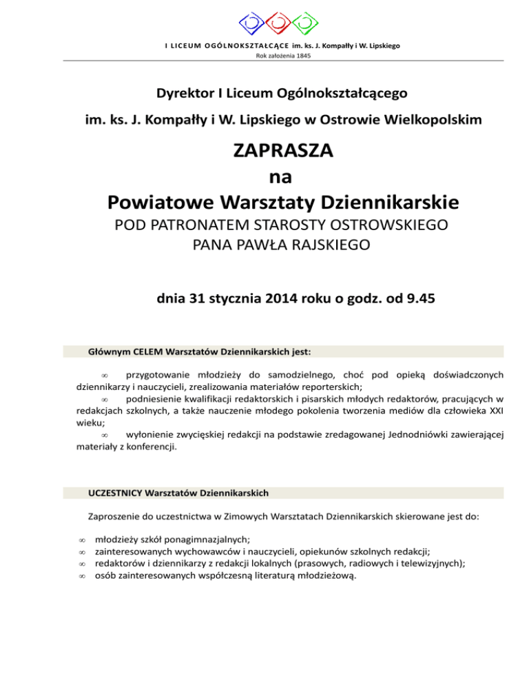 I L I C E U M O G Ó L N O KS ZTA Ł C ĄC E im. ks. J. Kompałły i W. Lipskiego Rok założenia 1845 Dyrektor I Liceum Ogólnokształcącego im. ks. J. Kompałły i W. Lipskiego w Ostrowie Wielkopolskim ZAPRASZA na Powiatowe Warsztaty Dziennikarskie POD PATRONATEM STAROSTY OSTROWSKIEGO PANA PAWŁA RAJSKIEGO dnia 31 stycznia 2014 roku o godz. od 9.45 Głównym CELEM Warsztatów Dziennikarskich jest: • przygotowanie młodzieży do samodzielnego, choć pod opieką doświadczonych dziennikarzy i nauczycieli, zrealizowania materiałów reporterskich; • podniesienie kwalifikacji redaktorskich i pisarskich młodych redaktorów, pracujących w redakcjach szkolnych, a także nauczenie młodego pokolenia tworzenia mediów dla człowieka XXI wieku; • wyłonienie zwycięskiej redakcji na podstawie zredagowanej Jednodniówki zawierającej materiały z konferencji. UCZESTNICY Warsztatów Dziennikarskich Zaproszenie do uczestnictwa w Zimowych Warsztatach Dziennikarskich skierowane jest do: • • • • młodzieży szkół ponagimnazjalnych; zainteresowanych wychowawców i nauczycieli, opiekunów szkolnych redakcji; redaktorów i dziennikarzy z redakcji lokalnych (prasowych, radiowych i telewizyjnych); osób zainteresowanych współczesną literaturą młodzieżową. I L I C E U M O G Ó L N O KS ZTA Ł C ĄC E im. ks. J. Kompałły i W. Lipskiego Rok założenia 1845 W PROGRAMIE Warsztatów Dziennikarskich Konferencja prasowa młodych dziennikarzy z Wojciechem Pacyną na temat pracy reżysera Wojciech Pacyna – Reżyser, asystent reżyserów, współtwórca, twórca członek Polskiej Akademii Filmowej. Przykładowe reżyserie: Filmy fabularne: Nigdy nie mów nigdy, Operacja SAMUM. Seriale fabularne: Linia życia, Zostać miss, Zostać miss 2, Samo życie (wybrane odc.), Hotel 52. Spektakle telewizyjne: Warszawiak, Księga raju. Prosimy o przygotowanie zespołów do dyskusji (listę pytań) do reżysera na podstawie materiałów opublikowanych w Internecie, np. na stronach: www.filmpolski.pl www.audiowizualni.pl www.stopklatka.pl Na podstawie materiałów zebranych podczas wywiadu redakcje gazet zredagują Jednodniówkę i prześlą ją do I LO, gdzie komisja złożona z profesjonalnych dziennikarzy dokona oceny i wyłoni zwycięzców. Prace prosimy przesłać do dnia 15 marca 2014 roku na adres e-mail: [email protected] Na początku kwietnia odbędzie się kolejne spotkanie przedstawicieli redakcji i ich opiekunów w celu ogłoszenia zwycięzców i wręczenia nagród. Wszystkich zainteresowanych serdecznie zapraszamy. Prosimy o wypełnienie załączonego formularza i odesłanie go na adres e-mail: [email protected] do dnia 20 stycznia 2014 roku Organizatorzy: dyrektor I LO - Marek Lewicki Nauczyciele: Elżbieta Kaźmierczak Anna Przybył Renata Kałużna Wszelkie pytania można kierować na adres e-mail: [email protected]