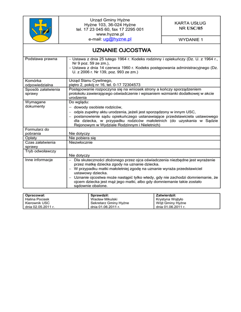 Urząd Gminy Hyżne Hyżne 103, 36-024 Hyżne tel. 17 23 045 60, fax 17 2295 001 www.hyzne.pl e-mail: [email protected] KARTA USŁUG NR USC/05 WYDANIE 1 UZNANIE OJCOSTWA Podstawa prawna − Ustawa z dnia 25 lutego 1964 r. Kodeks rodzinny i opiekuńczy (Dz. U. z 1964 r., Nr 9 poz. 59 ze zm.), − Ustawa z dnia 14 czerwca 1960 r. Kodeks postępowania administracyjnego (Dz. U. z 2006 r. Nr 139, poz. 993 ze zm.) Komórka odpowiedzialna Sposób załatwienia sprawy Urząd Stanu Cywilnego, piętro 2, pokój nr 16, tel. 0-17 72304573 Postępowanie rozpoczyna się na wniosek strony a kończy sporządzeniem protokołu zawierającego oświadczenie i wpisaniem wzmianki dodatkowej w akcie urodzenia Do wglądu: − dowody osobiste rodziców, − odpis zupełny aktu urodzenia, jeżeli jest sporządzony w innym USC, − postanowienie sądu opiekuńczego ustanawiające przedstawiciela ustawowego dla dziecka, w przypadku rodziców małoletnich (do uzyskania w Sądzie Rejonowym w Wydziale Rodzinnym i Nieletnich) Wymagane dokumenty Formularz do pobrania Opłaty Czas załatwienia sprawy Tryb odwoławczy Inne informacje Opracował: Halina Pociask Kierownik USC dnia 02.05.2011 r. Nie dotyczy Nie pobiera się Niezwłocznie Nie dotyczy − Dla skuteczności złożonego przez ojca oświadczenia niezbędne jest wyrażenie przez matkę dziecka zgody na uznanie dziecka. − W przypadku matki małoletniej zgodę na uznanie wyraża przedstawiciel ustawowy dziecka. − Uznanie ojcostwa może nastąpić tylko wtedy, gdy nie zachodzi domniemanie, że ojcem dziecka jest mąż jego matki, albo gdy domniemanie takie zostało sądownie obalone. Sprawdził: Wacław Mikulski Sekretarz Gminy Hyżne dnia 01.06.2011 r. Zatwierdził: Krystyna Wojtyło Wójt Gminy Hyżne dnia 01.06.2011 r.