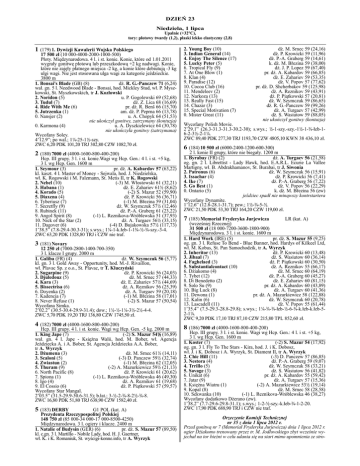 DZIEŃ 23 Niedziela, 1 lipca Upalnie (+32°C), tory: płotowy twardy (1,2), płaski lekko elastyczny (2,8) 1 (179) 1. Dywizji Kawalerii Wojska Polskiego 17 500 zł (10 000-4000-2000-1000-500) Płoty. Międzynarodowa. 4 l. i st. konie. Konie, które od 1.01.2011 wygrały gonitwę płotową lub przeszkodową +2 kg nadwagi. Konie, które nie zajęły płatnego miejsca -2 kg, a konie które debiutują -3 kg ulgi wagi. Nie jest stosowana ulga wagi za kategorie jeździeckie. 3800 m 1. Bonsai's Blade (GB) (8) dż. R. G.-Panczew 71 (6,24) wał. gn. 5 l. Needwood Blade - Bonsai, hod. Mickley Stud, wł. P. Myszkowski, St. Myszkowskich, tr J. Kozłowski 2. Noridon (5) u. P. Gogolewski 69 (52,68) 3. Tudul (7) dż. Z. Lica 68 (16,69) 4. Ride With Me (6) pr. dż. R. Benš 66 (15,70) 5. Jutrzenka (1) am. dż. P. Peprna 66 (13,78) 0. Nansjer (2) u. A. Chopyk 64 (51,53) nie ukończył gonitwy, zatrzymany (kontuzja) 0. Karmona (4) u. A. Dyszkielewicz 64 (30,78) nie ukończyła gonitwy (zatrzymana) Wycofany Soley. 4’12.9”; po wal.; 1¼-25-1½-szy. ZWC 6,20 PDK 101,20 TRJ 302,80 CZW 1082,70 zł. 2 (180) 7000 zł (4000-1600-800-400-200) Hcp. III grupy. 3 l. i st. konie.Wagi wg Hcp. Gen.: 4 l. i st. +5 kg, 3 l. wg Hcp. Gen. 1600 m 1. Seymour (3) pr. dż. A. Kabardov 57 (63,22) kl. kaszt. 4 l. Master of Money - Sejwala, hod. J. Niedzielska, wł. K. Rogowski i M. Falzmann, St. Metis II, tr K. Rogowski 2. Nebel (10) (-3) M. Włostowski 61 (32,21) 3. Habana (1) dż. E. Zahariev 61½ (8,62) 4. Korado (5) (-2) S. Mazur 52 (59,90) 5. Diaxena (4) dż. P. Krowicki 56 (36,71) 6. Tyberiusz (7) (-1) M. Březina 59 (31,04) 7. Secretfly (9) dż. W. Szymczuk 57½ (12,46) 8. Rubinek (11) dż. P.-A. Graberg 61 (23,22) 9. Angol Spirit (8) (-1) L. Reznikova-Wróblewska 51 (37,93) 10. Nick of the Star (2) dż. A. Turgaev 56½ (33,15) 11. Dagover (6) (-4) D. Bujakowska 57½ (117,73) 1’38.5” (7.8-29.4-30.3-31); s.wys.; 1¼-1-k.łeb-1-1¾-½-¾-szy.-3-4. ZWC 63,20 PDK 1328,80 TRJ i CZW nie traf. 3 (181) Novary 12 250 zł (7000-2800-1400-700-350) 3 l. klacze I grupy. 2000 m 1. Galiba (FR) (4) dż. W. Szymczuk 56 (5,77) kl. gn. 3 l. Gold Away - Opportunity, hod. M.-J. Rivaillon, wł. Plavac Sp. z o.o., St. Plavac, tr T. Kluczyński 2. Sugarpine (9) dż. P. Krowicki 56 (24,03) 3. Djuledouz (5) dż. M. Srnec 57 (44,33) 4. Kara (3) dż. E. Zahariev 57½ (44,69) 5. Bissectrisa (6) dż. A. Reznikov 56 (25,39) 6. Doyenka (2) dż. A. Turgaev 59 (20,18) 7. Kadencja (7) (-1) M. Březina 58 (17,01) 8. Never Refuse (1) (-2) S. Mazur 57 (50,54) Wycofana Simka. 2’02.2” (30.5-30.4-29.9-31.4); dow.; 1½-½-1¼-3½-2½-4-4. ZWC 5,70 PDK 19,20 TRJ 136,80 CZW 1745,50 zł. 4 (182) 7000 zł (4000-1600-800-400-200) Hcp. III grupy. 4 l. i st. konie. Wagi wg Hcp. Gen. -5 kg. 2000 m 1. King Jape (7) (-2) S. Mazur 54½ (16,89) wał. gn. 4 l. Jape - Księżna Walii, hod. M. Bober, wł. Agencja Jeździecka A. i A. Bober, St. Agencja Jeździecka A.A. Bober, tr A. Wyrzyk 2. Dżumena (3) dż. M. Srnec 61½ (14,11) 3. Scaloni (5) (-3) D. Panczew 59½ (32,74) 4. Zwiastun (2) (-1) M. Březina 62 (12,05) 5. Thuram (9) (-2) A. Mazurkiewicz 59½ (21,13) 6. North Pacific (8) dż. P. Krowicki 61 (20,62) 7. Spiona (1) (-1) L. Reznikova-Wróblewska 46 (49,30) 8. Igo (4) dż. A. Reznikov 61 (19,68) 9. El Cossio (6) dż. P. Piątkowski 57 (59,57) Wycofany Star Mangal. 2’03.5” (31.5-29.9-30.6-31.5); b.łat.; 3-½-2-¾-8-2½-¾-8. ZWC 16,80 PDK 51,80 TRJ 638,90 CZW 1582,40 zł. 5 (183) DERBY G1 POL (kat. A) Prezydenta Rzeczypospolitej Polskiej 148 750 zł (85 000-34 000-17 000-8500-4250) Międzynarodowa. 3 l. ogiery i klacze. 2400 m 1. Natalie of Budysin (GER) (6) pr. dż. S. Mazur 57 (89,50) kl. c.gn. 3 l. Martillo - Nobile Lady, hod. H. J. Gaertner, wł. K. i K. Romaniuk, St. wyścigi-konne.info, tr A. Wyrzyk 2. Young Boy (10) 3. Indian General (14) 4. Enjoy The Silence (17) 5. Lucky Peter (5) 6. Tropical Fly (9) 7. At One Blow (1) 8. Klan (4) 9. Paradise (12) 10. Cocoa Club (16) 11. Mendeleev (2) 12. Narkoza (13) 13. Really Fast (15) 14. Chazar (3) 15. Special Motivation (7) 0. Mister Great (11) dż. M. Srnec 59 (24,16) dż. P. Krowicki 59 (11,96) dż. P.-A. Graberg 59 (14,61) k. dż. M. Březina 59 (38,00) dż. J. P. Lopez 59 (67,40) pr. dż. A. Kabardov 59 (66,85) dż. E. Zahariev 59 (53,35) dż. V. Popov 57 (77,62) pr. dż. D. Shcherbakov 59 (125,98) dż. A. Reznikov 59 (43,91) dż. P. Piątkowski 57 (20,81) dż. W. Szymczuk 59 (86,65) dż. R. G.-Panczew 59 (99,26) dż. A. Turgaev 57 (42,99) dż. S. Wasiutow 59 (88,05) nie ukończył gonitwy (kontuzja) Wycofany Polish Movie. 2’29.1” (26.3-31.3-31.3-30.2-30); s.wys.; ½-1-szy.-szy.-1½-1-¾-łeb-16-2-3½-2-1¼. ZWC 89,40 PDK 277,30 TRJ 1193,70 CZW 4805,10 KWN 38 436,10 zł. 6 (184) 10 500 zł (6000-2400-1200-600-300) 2 l. konie II grupy, które nie biegały. 1200 m 1. Byrabay (FR) (2) dż. A. Turgaev 56 (21,58) og. gn. 2 l. Librettist - Lady Hawk, hod. E.A.R.L. Ecurie La Vallee Martigny, wł. B. Abdrakhamanov, St. Burabai, tr J. Siwonia 2. Patronus (6) dż. W. Szymczuk 56 (15,91) 3. Issachar (4) dż. P. Krowicki 56 (7,41) 4. Ike (7) dż. P.-A. Graberg 56 (7,22) 5. Go Best (1) dż. V. Popov 56 (22,29) 0. Ontario (5) k. dż. M. Březina 56 (zw) jeździec spadł nie minąwszy kontrstartera Wycofany Dynamite. 1’12.6” (12.8-28.1-31.7); pew.; 1½-¾-5-½. ZWC 21,50 PDK 53,30 TRJ 164,20 CZW 119,00 zł. 7 (185) Memoriał Fryderyka Jurjewicza LR (kat. A) (wcześniej Rzecznej) 31 500 zł (18 000-7200-3600-1800-900) Międzynarodowa. 3 l. i st. konie. 1600 m 1. Hard Work (IRE) (5) pr. dż. S. Mazur 55 (9,25) og. gn. 3 l. Refuse To Bend - Blue Banner, hod. Hardys of Kilkeel Ltd, wł. M. Kobus, St. Pan Samochodzik, tr A. Wyrzyk 2. Inheritor (13) dż. P. Krowicki 60 (13,48) 3. Jibaal (7) dż. S. Wasiutow 60 (36,14) 4. Faghelaed (3) dż. P. Piątkowski 60 (30,50) 5. Substantialcontact (10) dż. A. Reznikov 55 (66,17) 6. Dżiakomo (4) dż. M. Srnec 60 (64,19) 7. Tybet (12) dż. P.-A. Graberg 60 (45,27) 8. Di Benede
