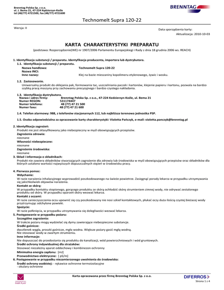 Brenntag Polska Sp. z o.o. ul. J. Bema 21, 47-224 Kędzierzyn-Koźle tel (48/77) 4721500, fax (48/77) 4721600 Technomelt Supra 120-22 Wersja: II Data sporządzenia karty: __________ Aktualizacja: 2010-10-03 KARTA CHARAKTERYSTYKI PREPARATU (podstawa: Rozporządzenie(WE) nr 1907/2006 Parlamentu Europejskiegi i Rady z dnia 18 grudnia 2006 ws. REACH) 1. Identyfikacja substancji / preparatu. Identyfikacja producenta, importera lub dystrybutora. 1.1. Identyfikacja substancji / preparatu. Nazwa handlowa: Technomelt Supra 120-22 Nazwa INCI: Inne nazwy: Klej na bazie mieszaniny kopolimeru etylenowego, żywic i wosku. 1.2. Zastosowanie. Uniwersalny produkt do oklejania pak, formowania tac, uszczelniania paczek i kartonów, klejenie papieru i kartonu, pozwala na bardzo szybką pracę maszyny przy zachowaniu precyzyjnego i bardzo czystego nakładania. 1.3. Identyfikacja dystrybutora. Nazwa i adres firmy: Brenntag Polska Sp. z o.o., 47-224 Kedzierzyn-Koźle, ul. Bema 21 Numer REGON: 531174447 Numer telefonu: 48 (77) 47 21 500 Numer faxu: 48 (77) 47 21 600 1.4. Telefon alarmowy: 988, z telefonów stacjonarnych 112, lub najbliższa terenowa jednostka PSP. 1.5. Osoba odpowiedzialna za opracowanie karty charakterystyki: Violetta Pańczyk, e-mail: [email protected] 2. Identyfikacja zagrożeń: Produkt nie jest sklasyfikowany jako niebezpieczny w myśl obowiązujących przepisów. Zagrożenia zdrowia: nieznane Własności niebezpieczne: nieznane Zagrożenie środowiska: nieznane 3. Skład i informacja o składnikach: Produkt nie zawiera składników stwarzających zagrożenie dla zdrowia lub środowiska w myśl obowiązujących przepisów oraz składników dla których ustalono wartości najwyższych dopuszczalnych stężeń w środowisku pracy. 4. Pierwsza pomoc: Wdychanie: W razie narażenia inhalacyjnego wyprowadzić poszkodowanego na świeże powietrze. Zasięgnąć porady lekarza w przypadku utrzymywania się jakichkolwiek objawów narażenia. Kontakt ze skórą: W przypadku kontaktu stopionego, gorącego produktu ze skórą ochłodzić skórę strumieniem zimnej wody, nie odrywać zestalonego produktu od skóry. W przypadku oparzeń skóry wezwać lekarza. Kontakt z oczami: W razie zanieczyszczenia oczu upewnić się czy poszkodowany nie nosi szkieł kontaktowych, płukać oczy duża ilością czystej bieżacej wody przytrzymując odchylone powieki. Spożycie: W razie połknięcia, w przypadku utrzymywania się dolegliwości wezwać lekarza. 5. Postępowanie w przypadku pożaru: Szczególne zagrożenia: W trakcie pożaru mogą wydzielać się dymy zawierające niebezpieczne substancje. Środki gaśnicze: dwutlenek węgla, proszki gaśnicze, mgła wodna. Większe pożary gasić mgłą wodną. Nie stosować wody w zwartym strumieniu. Inne informacje: Nie dopuszczać do przedostania się produktu do kanalizacji, wód powierzchniowych i wód gruntowych. Środki ochrony indywidualnej dla strażaków: Stosować niezależny aparat oddechowy i kombinezon ochronny Minimalna energia zapłonu: [mJ] Przewodnictwo elektryczne: [ pS/m] 6. Postępowanie w przypadku niezamierzonego uwolnienia do środowiska: Środki ochrony osobistej: - rękawice ochronne termoizolacyjne - okulary ochronne Karta opracowana przez firmę Brenntag Polska Sp. z o.o. Strona 1 z 4 Brenntag Polska Sp. z o.o. ul. J. Bema 21, 47-224 Kędzierzyn-Koźle tel (48/77) 4721500, fax (48/77) 4721600 Technomelt Supra 120-22 - odzież ochronna Postępowanie przy wycieku lub wysypie substancji: Zapobiec rozprzestrzenianiu się lub dostaniu się do kanalizacji, wód powierzchniowych i gruntowych. Uwolniony materiał zebrać mechanicznie do oznaczonego pojemnika i przekazać do zniszczenia. 7. Postępowanie z substancją / preparatem i magazynowanie: Magazynowanie: Przechowywać w chłodnym i suchym pomieszczeniu. Postępowanie z substancją lub preparatem: Zapewnić instalację wyciągową w miejscu stosowania. 8. Kontrola narażenia i środki ochrony indywidualnej: Stosowane środki ochrony osobistej powinny spełniać wymogi Rozporządzenia Ministra Gospodarki z dnia 21 grudnia 2005 r. w sprawie zasadniczych wymagań dla środków ochrony indywidualnej (Dz.U. Nr 259, poz. 2173). Ochrona dróg oddechowych: nie wymagana Ochrona oczu: okulary ochronne Ochrona rąk: rękawice ochronne odporne na dzialanie wysokiej temperatury, wykonane ze skóry lub innego trwałego materiału Techniczne środki ochronne: wentylacja pomieszczeń Inne wyposażenie ochronne: nie wymagane Kontrola zagrożenia: NDS, NDSCh - nie oznaczono (wg Rozporządzenia MPiPS z dn. 29 listopada 2002 ; Dz.U. Nr 217, poz. 1833 z późniejszymi zmianami) Zalecenia dotyczące procedury monitoringu zawartości składników niebezpiecznych w powietrzu – metodyka pomiarów: -Rozporządzenie Ministra Zdrowia z dnia 20 kwietnia 2005 r. w sprawie badań i pomiarów czynników szkodliwych dla zdrowia w środowisku pracy (Dz.U. Nr 73, poz.645) -PN-89/Z-01001/06. Ochrona czystości powietrza. Nazwy, określenia i jednostki. Terminologia dotycząca badań jakości powietrza na stanowiskach pracy. -PN Z-04008-7:2002. Ochrona czystości powietrza. Pobieranie próbek. Zasady pobierania próbek powietrza w środowisku pracy i interpretacja wyników. -PN-EN-689: 2002. Powietrze na stanowiskach pracy – wytyczne oceny narażenia inhalacyjnego na czynniki chemiczne przez porównanie z wartościami dopuszczalnymi i strategia pomiarowa. Uwaga: Gdy stężenie substancji jest ustalone i znane, doboru środków ochrony indywidualnej należy dokonywać z uwzględnieniem stężenia substancji występującego na danym stanowisku pracy, czasu ekspozycji oraz czynności wykonywanych przez pracownika. W sytuacji awaryjnej, jeżeli stężenie substancji na stanowisku pracy nie jest znane, stosować środki ochrony indywidualnej o najwyższej zalecanej klasie ochrony. Pracodawca jest obowiązany zapewnić, aby stosowane środki ochrony indywidualnej oraz odzież i obuwie robocze posiadały właściwości ochronne i uż