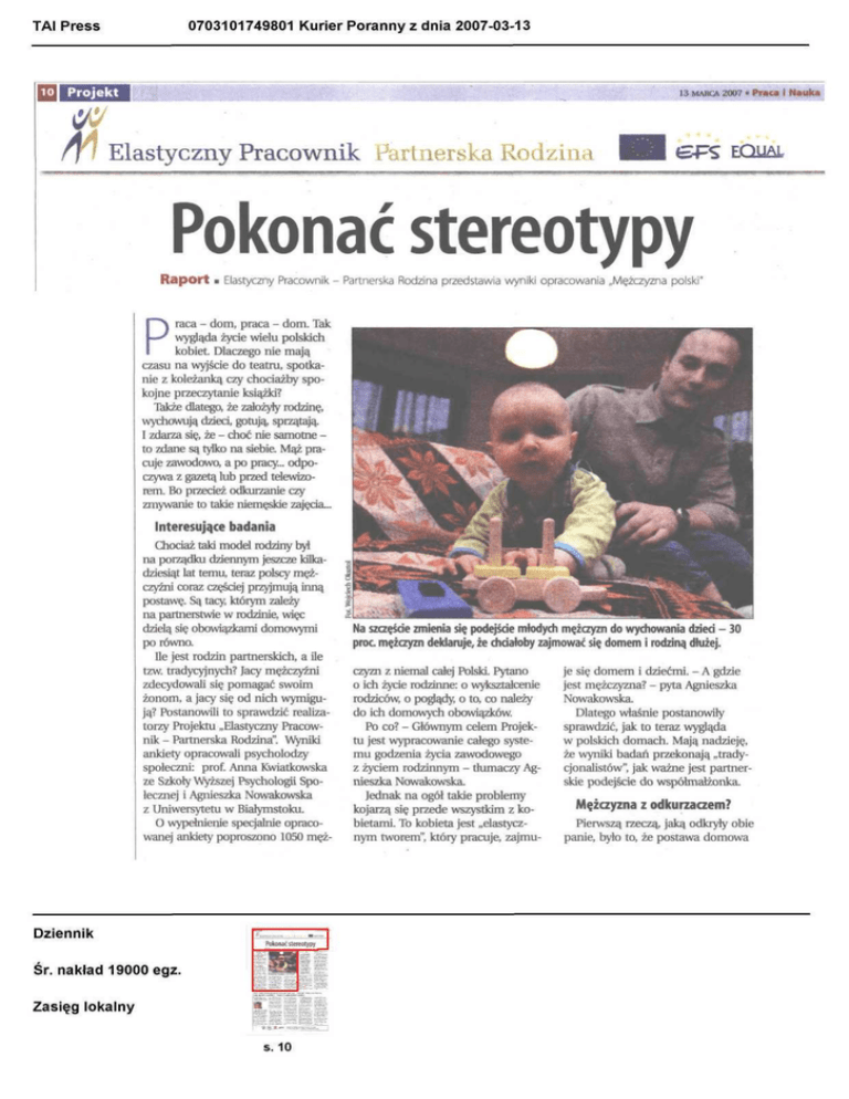 0703101749801 Kurier Poranny z dnia 2007-03-13 TAI Press 10 Projekt 13 MARCA 2007 • Praca l Nauka Elastyczny Pracownik Partnerska Rodzina Pokonać stereotypy Raport • Elastyczny Pracownik - Partnerska Rodzina przedstawia wyniki opracowania „Mężczyzna polski" P raca - dom, praca - dom. Tak wygląda życie wielu polskich kobiet. Dlaczego nie mają czasu na wyjście do teatru, spotkanie z koleżanką czy chociażby spokojne przeczytanie książki? Także dlatego, że założyły rodzinę, wychowują dzieci, gotują, sprzątają. I zdarza się, że - choć nie samotne to zdane są tylko na siebie. Maż pracuje zawodowo, a po pracy... odpoczywa z gazetą lub przed telewizorem. Bo przecież odkurzanie czy zmywanie to takie niemęskie zajęcia... Interesujące badania Chociaż taki model rodziny był na porządku dziennym jeszcze kilkadziesiąt lat temu, teraz polscy mężczyźni coraz częściej przyjmują inną postawę. Są tacy, którym zależy na partnerstwie w rodzinie, więc dzielą się obowiązkami domowymi po równo. Hę jest rodzin partnerskich, a ile tzw. tradycyjnych? Jacy mężczyźni zdecydowali się pomagać swoim żonom, a jacy się od nich wymigują? Postanowili to sprawdzić realizatorzy Projektu „Elastyczny Pracownik - Partnerska Rodzina". Wyniki ankiety opracowali psycholodzy społeczni: prof. Anna Kwiatkowska ze Szkoły Wyższej Psychologii Społecznej i Agnieszka Nowakowska z Uniwersytetu w Białymstoku. O wypełnienie specjalnie opracowanej ankiety poproszono 1050 męż- Dziennik Śr. nakład 19000egz. Zasięg lokalny s. 10 Na szczęście zmienia się podejście młodych mężczyzn do wychowania dzieci - 30 proc mężczyzn deklaruje, że chciałoby zajmować się domem i rodziną dłużej. czyzn z niemal całej Polski Pytano o ich życie rodzinne: o wykształcenie rodziców, o poglądy, o to, co należy do ich domowych obowiązków. Po co? - Głównym celem Projektu jest wypracowanie całego systemu godzenia życia zawodowego z życiem rodzinnym - tłumaczy Agnieszka Nowakowska. Jednak na ogół takie problemy kojarzą się przede wszystkim z kobietami. To kobieta jest „elastycznym tworem", który pracuje, zajmu- je się domem i dziećmi. - A gdzie jest mężczyzna? - pyta Agnieszka Nowakowska. Dlatego właśnie postanowiły sprawdzić, jak to teraz wygląda w polskich domach. Mają nadzieję, że wyniki badań przekonają „tradycjonalistów", jak ważne jest partnerskie podejście do współmałżonka. Mężczyzna z odkurzaczem? Pierwszą rzeczą, jaką odkryły obie panie, było to, że postawa domowa TAI Press 0703101749802 Kurier Poranny z dnia 2007-03-13 • Wyniki badań - 59,1 proc. żonatych mężczyzn uważa, że najważniejszym zadaniem kobiety jest prowadzenie domu oraz wychowywanie dzieci - 58,8 proc. mężczyzn żyjących w mieście powyżej 200 tyś. mieszkańców nie zgadza się, że kobieta i mężczyzna powinni równo dzielić się obowiązkami domowymi - 28,5 proc. mężczyzn w wieku do 26 lat uważa, że mężczyzna wykonuje prace domowe, gdy ma na to ochotę - 30,9 proc. mężczyzn 33-37letnich ma ochotę nie pracować zawodowo, tylko przez jakiś czas zająć się wychowywaniem dzieci i pracą w domu. mężczyzn zależy od tego, w jakim domu się wychowali. - Ci, którzy dorastali w tradycyjnej rodzinie, gdzie matka zajmowała się wyłącznie domem, posiadają mniej egalitarne podejście do partnera - wyjawia Agnieszka Nowakowska. - Żeby mężczyzna sam pomagał w domu, a żonie pozwolił pracować zawodowo, musi widzieć takie same rozwiązania we własnym domu rodzinnym. Jednak na szczęście nawet ci, którzy w domu prawie nie pomagają, Dziennik Pokonać stereotypy Śr. nakład 19000egz. Zasięg lokalny s. 10 widzą, że ta postawa nie jest w porządku. Przy wypełnianiu ankiety często konfabulowali. - Deklarowali, że z chęcią zajmują się pracami domowymi - mówi Agnieszka Nowakowska. - Jednak później, przy szczegółowych pytaniach, wychodziło, że na przykład odkurzanie, zmywanie naczyń czy pranie to - ich zdaniem - czynności typowo kobiece, Tyle, że - jak wiadomo „prawdziwy mężczyzna" kobiecą robotą nie będzie się zajmował. Na szczęście kobieta swojego mężczyznę potrafi zmienić. Bo z ankiety wynika, że bardziej partnerskie poglądy mają ci, którzy własną rodzinę już założyli. To kawalerowie głoszą najbardziej tradycyjne poglądy! Tata na wychowawczym Pracująca kobieta nie może być dobrą matką - takie poglądy głoszą najczęściej mężczyźni tzw. starej daty. Na szczęście im mężczyzna młodszy i lepiej wykształcony, tym daje kobiecie większe prawo do pracy zawodowej i zarabiania pieniędzy. A nawet więcej! Okazuje się, że 30 proc. mężczyzn chciałoby zajmować się domem i rodziną dłużej. - Deklarują, że gdyby żona zarabiała wystarczająco dużo, aby utrzymać całą rodzinę, to chętnie wzięliby lalka miesięcy urlopu wychowawczego - zdradza Agnieszka Nowakowska. • TAI Press 0703101749803 Kurier Poranny z dnia 2007-03-13 ROZMOWA • Temat ojcostwa chcemy przedstawić w sposób ciepły i klarowny, czasem humorystyczny - mówi Cecylia Sadowska-Snarska Ojciec nie tylko na plakacie - to jeden z celów naszego projektu Dziennik Kurier Poranny: Po co robicie badania sprawdzające, którzy mężczyźni pomagają swoim partnerkom w pracach domowych? jących z pełnienia obowiązków rodzinnych. Żeby zmieniać świadomość i w końcu postawy mężczyzn, istotne znaczenie ma dobre rozpoznanie czynników demograficznych, społecznych i psychologicznych, które mogą mieć wpływ na podejmowanie przez mężczyzn ról rodzinnych. Przeprowadzone badania miały na celu identyfikację tych czynników. A to dla nas podstawa do dalszych działań w projekcie. Cecylia Sadowska-Snarska, kierownik Projektu: Nasz Projekt wpisuje się w ogólnoeuropejski trend działań na rzecz lepszego godzenia życia zawodowego z życiem rodzinnym. Promocja większego zaangażowania mężczyzn