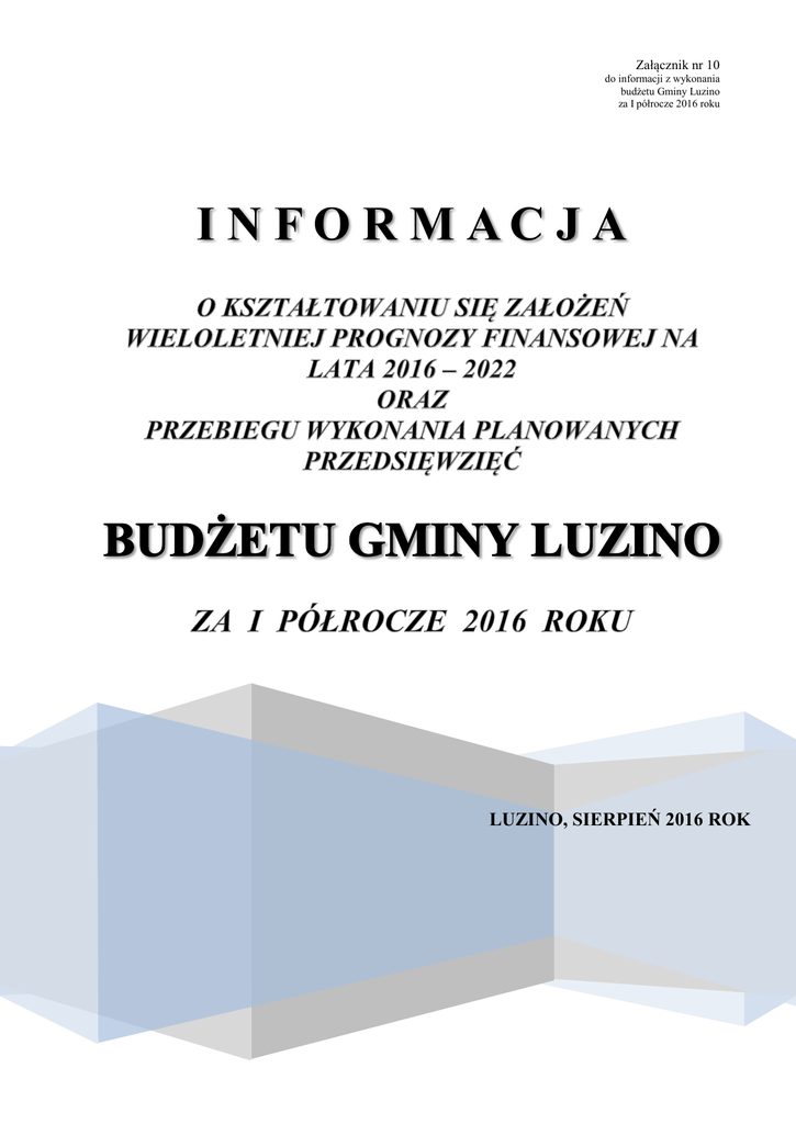 Załącznik nr 10 do informacji z wykonania budżetu Gminy Luzino za I półrocze 2016 roku I N FO R M AC J A LUZINO, SIERPIEŃ 2016 ROK Ogólna charakterystyka realizacji założeń Wieloletniej Prognozy Finansowej na lata 2016 – 2022 w zakresie wykonania za I półrocze 2016 roku. I. W wyniku analizy realizacji założeń planu WPF stwierdza się, że: wykonanie DOCHODÓW ogółem wyniosło 38 287 527,40 zł., co stanowi 53,17% planowanej kwoty, tj.: 72 005 392,06 zł., wykonanie WYDATKÓW ogółem wyniosło 32 363 422,45 zł., co stanowi 47,61% planowanej kwoty, tj.: 67 973 846,79 zł., WYNIK BUDŻETU – NADWYŻKA na koniec okresu sprawozdawczego wyniosła 4 924 104,95 zł., wykonanie PRZYCHODÓW ogółem wyniosło 489 429,73 zł. Kwota ta stanowi wolne środki, jako nadwyżkę środków pieniężnych na rachunku bieżącym budżetu, wynikającą z rozliczeń kredytów i pożyczek z lat ubiegłych wykonanie ROZCHODÓW ogółem z tytułu spłaty kredytów i pożyczek wynosiło 2 251 972,00 zł. Zadłużenie Budżetu Gminy na koniec okresu sprawozdawczego wynosiło 10 291 363,00 zł., co stanowi 14,29% w stosunku do planowanych dochodów wynoszących ogółem 72 005 392,06 zł. II. Realizacja Przedsięwzięć w I półroczu 2016 roku kształtuje się w następujący sposób: WYDATKI BIEŻĄCE 1. ZAPEWNIENIE TRWAŁOŚCI PROJEKTU: „ZAPOBIEGANIE WYKLUCZENIU CYFROWEMU W GMINIE LUZINO” I i II Etap – Zapewnienie dostępu do szerokopasmowego Internetu. 2. Limit na 2016 rok 93 831,93 zł. Realizacja w I półroczu 37 218,93 zł. Zgodnie z postanowieniami umowy o dofinansowanie projektu, gmina została zobligowana do kontynuacji zadań w tym zakresie przez okres 5 lat. W związku z powyższym wydatkowano środki z przeznaczeniem na: wynagrodzenia i pochodne + ZFŚS pracownika zatrudnionego przy projekcie (w ramach trwałości) Opłacono usługę dostępu do Internetu dla beneficjentów projektu, tj.,45 Beneficjentów Ostatecznych i 7 jednostek w ramach I etapu i 65 Beneficjentów Ostatecznych i 7 jednostek w 1 ramach II etapu. Wydatkowano środki na ubezpieczenie sprzętu i zakup oprogramowania antywirusowego. 3. DOFINANSOWANIE PROGRAMU DOTYCZĄCEGO BADAŃ RAKA SZYJKI MACICY DLA DZIEWCZĄT POWYŻEJ 12 ROKU ŻYCIA – Zapobieganie chorobie nowotworowej Limit na 2016 rok Realizacja w I półroczu 65 250,00 zł. 16 500,00 zł. Program jest realizowany na terenie Gminy Luzino. Finansowany z budżetu gminy. W I półroczu koszt programu wyniósł 16 500,00 zł (koszt I dawki szczepionki). Realizatorem programu jest Niepubliczny Zakład Opieki Zdrowotnej Ośrodek Zdrowia w Luzinie wybrany w drodze otwartego konkursu ofert. Programem objęto dziewczęta zamieszkałe na terenie Gminy Luzino, z rocznika 2003 roku– 69 dziewczynek. Liczbę dziewcząt objętych programem ustalono w oparciu o dane będące w posiadaniu Referatu Spraw obywatelskich. Zaszczepienie nastąpiło po uzyskaniu pisemnej zgody rodziców. Do programu nie przystąpiło łącznie 18 dziewcząt . Zaszczepienie dziewcząt III dawką szczepionki nastąpi na przełomie wrzesień/październik. Przeprowadzono również akcję edukacyjno – informacyjną dot. programu, wśród dziewcząt i ich rodziców, wykłady z udziałem lekarzy i pielęgniarek szkolnych. W ramach programu przeprowadzono badania dot. profilaktyki raka szyjki macicy przed rozpoczęciem programu jak również badania zostaną przeprowadzone po zakończeniu programu. WYDATKI MAJĄTKOWE 1. UPORZĄDKOWANIE GOSPODARKI WODNO-ŚCIEKOWEJ NA TERENIE AGLOMERACJI LUZINO- Opracowanie dokumentacji. Limit na 2016 rok 10 000,00 zł. Realizacja w I półroczu 65 270,00 zł. Budowa sieci kanalizacyjno-wodociągowej na terenie Luzina, Kębłowa i Robakowa – realizację zadania planuje się na lata 2017 – 2019. W I półroczu 2016 roku wydatkowano środki na wykonanie wniosku o dofinansowanie do w/w zadania i poniesiono wydatki na usługi kserograficzne. 2. BUDOWA SALI GIMNASTYCZNEJ PRZY SZKOLE PODSTAWOWEJ IM. LECHA BĄDKOWSKIEGO W LUZINIE – Poprawa warunków nauki i zajęć sportowych w placówce. Limit na 2016 rok 300 000,00 zł. Realizacja w I półroczu 48 908,00 zł. Wydatki tego zadania stanowią przygotowanie mapy do kontynuacji celów projektowych budowy sali gimnastycznej, wykonanie projektu zamiennego budynku sali gimnastycznej wraz z zapleczem oraz opłatę wypisu z rejestru. 2 3. TERMOMODERNIZACJA BUDYNKÓW UŻYTECZNOŚCI PUBLICZNEJ W GMINIE LUZINO –Zarządzanie energią w budynkach użyteczności publicznej. Limit na 2016 rok 290 618,00 zł. Realizacja w I półroczu 56 334,00 zł. BUDYNEK SZKOŁY PODSTAWOWEJ W SYCHOWIE, BUDYNEK SZKOŁY PODSTAWOWEJ W WYSZECINIE,OBIEKT GMINNEGO PRZEDSZKOLA, BUDYNEK SZKOŁY PODSTAWOWEJ PRZEDSZKOLNY W ZELEWIE W KĘBŁOWIE-ODDZIAŁ Wykonano dokumentację projektową budynku SP w Sychowie i zrealizowano umowę oddział przedszkolny Zelewo. Przygotowane zostały projekty oraz audyty energetyczne na wymienione obiekty, uzyskano pozwolenia na budowę. W sierpniu br. zostanie złożony wniosek o dofinansowanie ze środków w ramach programu ZIT. 3