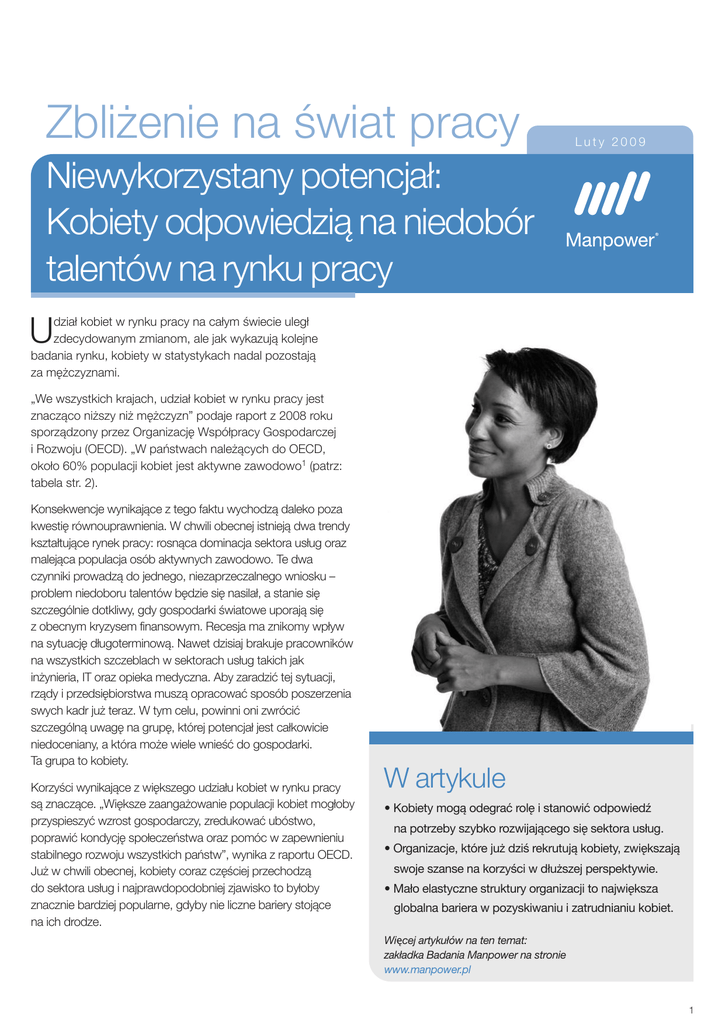 Zbliżenie na świat pracy Luty 2009 Niewykorzystany potencjał: Kobiety odpowiedzią na niedobór talentów na rynku pracy U dział kobiet w rynku pracy na całym świecie uległ zdecydowanym zmianom, ale jak wykazują kolejne badania rynku, kobiety w statystykach nadal pozostają za mężczyznami. „We wszystkich krajach, udział kobiet w rynku pracy jest znacząco niższy niż mężczyzn” podaje raport z 2008 roku sporządzony przez Organizację Współpracy Gospodarczej i Rozwoju (OECD). „W państwach należących do OECD, około 60% populacji kobiet jest aktywne zawodowo1 (patrz: tabela str. 2). Konsekwencje wynikające z tego faktu wychodzą daleko poza kwestię równouprawnienia. W chwili obecnej istnieją dwa trendy kształtujące rynek pracy: rosnąca dominacja sektora usług oraz malejąca populacja osób aktywnych zawodowo. Te dwa czynniki prowadzą do jednego, niezaprzeczalnego wniosku – problem niedoboru talentów będzie się nasilał, a stanie się szczególnie dotkliwy, gdy gospodarki światowe uporają się z obecnym kryzysem finansowym. Recesja ma znikomy wpływ na sytuację długoterminową. Nawet dzisiaj brakuje pracowników na wszystkich szczeblach w sektorach usług takich jak inżynieria, IT oraz opieka medyczna. Aby zaradzić tej sytuacji, rządy i przedsiębiorstwa muszą opracować sposób poszerzenia swych kadr już teraz. W tym celu, powinni oni zwrócić szczególną uwagę na grupę, której potencjał jest całkowicie niedoceniany, a która może wiele wnieść do gospodarki. Ta grupa to kobiety. Korzyści wynikające z większego udziału kobiet w rynku pracy są znaczące. „Większe zaangażowanie populacji kobiet mogłoby przyspieszyć wzrost gospodarczy, zredukować ubóstwo, poprawić kondycję społeczeństwa oraz pomóc w zapewnieniu stabilnego rozwoju wszystkich państw”, wynika z raportu OECD. Już w chwili obecnej, kobiety coraz częściej przechodzą do sektora usług i najprawdopodobniej zjawisko to byłoby znacznie bardziej popularne, gdyby nie liczne bariery stojące na ich drodze. W artykule • Kobiety mogą odegrać rolę i stanowić odpowiedź na potrzeby szybko rozwijającego się sektora usług. • Organizacje, które już dziś rekrutują kobiety, zwiększają swoje szanse na korzyści w dłuższej perspektywie. • Mało elastyczne struktury organizacji to największa globalna bariera w pozyskiwaniu i zatrudnianiu kobiet. Więcej artykułów na ten temat: zakładka Badania Manpower na stronie www.manpower.pl 1 Niektóre z barier mają charakter kulturowy, a tym samym trudno im zaradzić zmieniając jedynie przepisy czy politykę przedsiębiorstwa. Ale wiele z nich dotyczy utartych schematów. Mowa tu o pozostałościach po czasach, gdy 5-dniowy, 40-godzinny tydzień pracy był normą, mężczyzna był głównym żywicielem rodziny i jedynie niektóre kobiety szukały pracy, a nielicznym zależało na karierze zawodowej. Powyższy model nie sprawdza się w przypadku wielu kobiet, które są odpowiedzialne za wychowanie dzieci oraz biorą na siebie inne obowiązki, które spoczywać powinny na całej rodzinie. Należy odrzucić te przestarzałe wzorce i stworzyć nowe. Jednocześnie należy wprowadzić nowe przepisy, które pozwolą na utrwalanie wzorców i rozwój prawdziwej elastyczności zatrudnienia. Kobiety potrzebują teraz tego, na co zapotrzebowanie świata pracy zacznie się w przyszłości, gdy młodzi ludzie zwani pokoleniem Y lub pokoleniem Internetu wkroczą na rynek pracy w większej liczbie. „Coraz więcej dowodów wskazuje na to, że firmy mogące zaoferować stanowiska odpowiadające indywidualnym oczekiwaniom kandydatów, elastyczny system pracy czy wynagrodzenia, wiele zyskują. Szczególnie tyczy się to tzw. pokolenia Internetu”, twierdzi Don Tapscott, autor książki „Grown Up Digital”2. Innymi słowy, te przedsiębiorstwa i państwa, które szybko wprowadzą zmiany pozwalające na zachęcenie kobiet do większej aktywności zawodowej, stworzą sobie szansę na korzyści w dłuższej perspektywie. Te, które tego nie zrobią będą miały problem z utrzymaniem swojej konkurencyjności. Nadchodzą zmiany Rynek pracy jest w trakcie transformacji. Sektor usługowy cały czas się rozwija, a zapotrzebowanie na pracowników jest coraz większe, nawet w obecnej sytuacji. Ekonomiści przewidują, że w latach 2004-2015 liczba wakatów w sektorze usługowym wzrośnie o co najmniej 500 milionów. Zdecydowana większość tych stanowisk powstanie w Azji, ale też dziesiątki milionów w Europie, obu Amerykach oraz na Bliskim Wschodzie3. Tymczasem, społeczeństwa w krajach wysoko rozwiniętych starzeją się, a liczba młodych ludzi wkraczających na rynek pracy maleje. Do roku 2015 w Wielkiej Brytanii liczba pracowników poniżej 34-tego roku życia spadnie o 3%, a we Francji i Hiszpanii, odpowiednio o 11% i 25%4. Przewiduje się, że w Rosji odsetek społeczeństwa w wieku aktywności zawodowej spadnie o 10% do roku 2020, a ponad 95% tego spadku stanowią osoby między 15-tym a 39-tym rokiem życia5. We Włoszech, w Niemczech i Japonii będzie można zaobserwować podobne, niekorzystne zmiany. W rzeczywistości, żadnej ze światowych gospodarek w krajach rozwiniętych ten trend nie ominie. Europa, obie Ameryki oraz niektóre regiony Azji mają do czynienia z bombą zegarową: na rynku zabraknie wykwalifikowanych pracowników, którzy stymulują wzrost gospodarczy. Należy koniecznie zwiększyć pulę pracowników dostępnych na rynku pracy. A teraz, wyobraźmy sobie ogromny, niewykorzystany potencjał, jaki dla rynku pracy stanowią kobiety. W roku 2008 Międzynarodowa Organizacja Pracy (International Labour Organisation) oszacowała, że w 2007 roku odsetek osób Procentowy udział mężczyzn i kobiet w wieku aktywności zawodowej w rynku pracy 100 90 80 70 60 50 40 30 20 10 0 ISL DNK NOR SWE CHE CAN Mężczyźni L NZ FIN GBR USA NLD AUS AUT PRT DEU ECD O Kobiety JP N IRL FRA CZE P ES L L X K R C N LU 