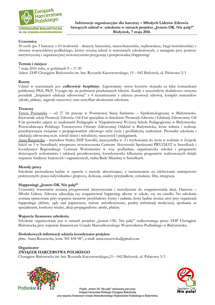 Informacje organizacyjne dla harcerzy – Młodych Liderów Zdrowia biorących udział w szkoleniu w ramach projektu „Jestem OK. Nie palę!” Białystok, 7 maja 2016 Uczestnicy 30 osób (po 3 harcerzy z 10 środowisk - drużyny harcerskie, starszoharcerskie, wędrownicze, kręgi instruktorskie) z obszaru województwa podlaskiego, którzy wezmą udział w warsztatach szkoleniowych, a następnie przy pomocy merytorycznej i organizacyjnej stowarzyszenia przygotują i przeprowadzą Happeningi Termin i miejsce 7 maja 2016 roku, w godzinach 9 – 17.30 Adres: ZHP Chorągiew Białostocka im. hm. Ryszarda Kaczorowskiego, 15 – 042 Białystok, ul. Pałacowa 3/1 Koszty Udział w warsztatach jest całkowicie bezpłatny. Zapewniamy zwrot kosztów dojazdu za bilet komunikacji publicznej: PKS, PKP, Voyager itp. na podstawie przekazanych biletów. Każdy z uczestników dodatkowo otrzyma poradnik „Inspirator edukacji zdrowotnej” z 4 scenariuszami z zakresu promocji zdrowia, komplet materiałów (ulotki, plakaty, nagrody rzeczowe) oraz certyfikat ukończenia szkolenia. Trenerzy Teresa Poznańska – od 27 lat pracuje w Powiatowej Stacji Sanitarno – Epidemiologicznej w Białymstoku. Kierownik sekcji Promocji Zdrowia. Od 8 lat specjalista w dziedzinie Promocji Zdrowia i Edukacji Zdrowotnej. Od 8 lat prowadzi zajęcia ze studentami Pedagogiki w Niepaństwowej Wyższej Szkole Pedagogicznej w Białymstoku. Przewodnicząca Polskiego Towarzystwa Oświaty Zdrowotnej Oddział w Białymstoku, które wdraża i realizuje przedsięwzięcia związane z propagowaniem zdrowego stylu życia i profilaktyką uzależnień. Prowadzi szkolenia i edukację zdrowotną m.in. wśród dzieci i młodzieży, nauczycieli i pielęgniarek. Anna Ruszewska – instruktor Hufca ZHP Suwałki, nauczycielka w -f i wychowania do życia w rodzinie w Zespole Szkół nr 3 w Suwałkach, wiceprezes stowarzyszenia Centrum Aktywności Społecznej PRYZMAT w Suwałkach i koordynator Regionalnego Centrum Wolontariatu w woj. podlaskim, organizatorka szkoleń i programów dotyczących wolontariatu i edukacji prozdrowotnej, koordynatorka kilkunastu programów realizowanych dzięki wsparciu funduszy krajowych i zagranicznych, radna Rady Miejskiej w Suwałkach. Metody pracy Szkolenie prowadzony będzie w oparciu o metody aktywizujące, z nastawieniem na zdobywanie umiejętności praktycznych: praca indywidualna i grupowa, dyskusje, analizy przypadków, symulacje, film, integracja. Happeningi „Jestem OK. Nie palę!” Uczestnicy warsztatów zostaną przygotowani merytorycznie i metodycznie do zorganizowania akcji. Harcerze – Młodzi Liderzy Zdrowia zdecydują czy zorganizować happening uliczny w szkole, czy na osiedlu. Na szkoleniu zostaną opracowane przy wsparciu trenerów przykładowe formy i zadania, które będzie można użyć przy organizacji happeningu (debaty, sądy nad papierosem, marsze antynikotynowe, punkty informacji medycznej, spotkania ze specjalistami, konkursy wiedzy, akcje propagandowe: ulotki, plakaty. Wsparcie finansowe szkolenia Szkolenie organizowane jest w ramach projektu „Jestem OK. Nie palę!” realizowanego przez ZHP Chorągiew Białostocką przy wsparciu finansowym Urzędu Marszałkowskiego Województwa Podlaskiego w Białymstoku. Dodatkowych informacji udziela koordynator projektu phm. Anna Ruszewska, kom. 501 838 987, e-mail: [email protected] Organizator ZWIĄZEK HARCERSTWA POLSKIEGO Chorągiew Białostocka im. hm. Ryszarda Kaczorowskiego,15 – 042 Białystok, ul. Pałacowa 3/1 Projekt „Jestem OK. Nie palę!” realizowany jest przez Związek Harcerstwa Polskiego Chorągiew Białostocką przy wsparciu finansowym Urzędu Marszałkowskiego Województwa Podlaskiego w Białymstoku
