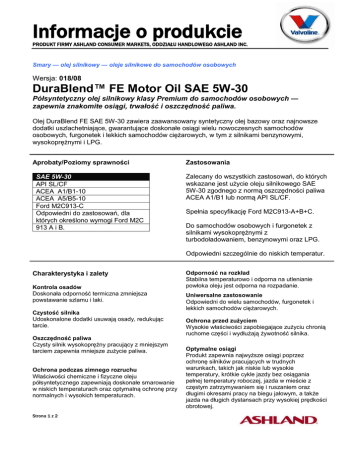 Informacje o produkcie PRODUKT FIRMY ASHLAND CONSUMER MARKETS, ODDZIAŁU HANDLOWEGO ASHLAND INC. Smary — olej silnikowy — oleje silnikowe do samochodów osobowych Wersja: 018/08 DuraBlend™ FE Motor Oil SAE 5W-30 Półsyntetyczny olej silnikowy klasy Premium do samochodów osobowych — zapewnia znakomite osiągi, trwałość i oszczędność paliwa. Olej DuraBlend FE SAE 5W-30 zawiera zaawansowany syntetyczny olej bazowy oraz najnowsze dodatki uszlachetniające, gwarantujące doskonałe osiągi wielu nowoczesnych samochodów osobowych, furgonetek i lekkich samochodów ciężarowych, w tym z silnikami benzynowymi, wysokoprężnymi i LPG. Aprobaty/Poziomy sprawności SAE 5W-30 API SL/CF ACEA A1/B1-10 ACEA A5/B5-10 Ford M2C913-C Odpowiedni do zastosowań, dla których określono wymogi Ford M2C 913 A i B. Zastosowania Zalecany do wszystkich zastosowań, do których wskazane jest użycie oleju silnikowego SAE 5W-30 zgodnego z normą oszczędności paliwa ACEA A1/B1 lub normą API SL/CF. Spełnia specyfikację Ford M2C913-A+B+C. Do samochodów osobowych i furgonetek z silnikami wysokoprężnymi z turbodoładowaniem, benzynowymi oraz LPG. Odpowiedni szczególnie do niskich temperatur. Charakterystyka i zalety Kontrola osadów Doskonała odporność termiczna zmniejsza powstawanie szlamu i laki. Czystość silnika Udoskonalone dodatki usuwają osady, redukując tarcie. Oszczędność paliwa Czysty silnik wysokoprężny pracujący z mniejszym tarciem zapewnia mniejsze zużycie paliwa. Ochrona podczas zimnego rozruchu Właściwości chemiczne i fizyczne oleju półsyntetycznego zapewniają doskonałe smarowanie w niskich temperaturach oraz optymalną ochronę przy normalnych i wysokich temperaturach. Strona 1 z 2 Odporność na rozkład Stabilna temperaturowo i odporna na utlenianie powłoka oleju jest odporna na rozpadanie. Uniwersalne zastosowanie Odpowiedni do wielu samochodów, furgonetek i lekkich samochodów ciężarowych. Ochrona przed zużyciem Wysokie właściwości zapobiegające zużyciu chronią ruchome części i wydłużają żywotność silnika. Optymalne osiągi Produkt zapewnia najwyższe osiągi poprzez ochronę silników pracujących w trudnych warunkach, takich jak niskie lub wysokie temperatury, krótkie cykle jazdy bez osiągania pełnej temperatury roboczej, jazda w mieście z częstym zatrzymywaniem się i ruszaniem oraz długimi okresami pracy na biegu jałowym, a także jazda na długich dystansach przy wysokiej prędkości obrotowej. Informacje o produkcie PRODUKT FIRMY ASHLAND CONSUMER MARKETS, ODDZIAŁU HANDLOWEGO ASHLAND INC. Bezpieczeństwo Niniejszy produkt prawdopodobnie nie stwarza znaczącego zagrożenia dla zdrowia lub bezpieczeństwa, o ile jest używany prawidłowo w odpowiednim zastosowaniu. Kartę charakterystyki (MSDS) można uzyskać na życzenie od lokalnego dystrybutora lub pobrać ją z witryny pod adresem http://msds.ashland.com Ochrona środowiska Zużyty olej należy oddawać do odpowiedniego punktu zbiórki. Nie spuszczać do ścieków, gleby lub cieków wodnych. Charakterystyczne właściwości Charakterystyka typowych właściwości jest oparta na aktualnie produkowanym preparacie. W przyszłości produkcja będzie zgodna ze specyfikacjami Valvoline™, natomiast mogą wystąpić zmiany tej charakterystyki. People Who Know Use Valvoline™ Działając w ponad 100 krajach na całym świecie, firma Valvoline to wiodący sprzedawca, dystrybutor i producent wysokiej jakości produktów i usług samochodowych i przemysłowych. Do produktów tej firmy należą smary samochodowe, m.in. MaxLife™ — pierwszy olej silnikowy o formule przeznaczonej specjalnie do pojazdów o wyższym przebiegu; płyny przekładniowe, oleje przekładniowe, smary hydrauliczne, chemikalia motoryzacyjne, produkty specjalne; smary oraz produkty do układu chłodzenia. Aby uzyskać więcej informacji na temat produktów i usług firmy Valvoline, odwiedź www.valvolineeurope.com Autor: AdG Zastępuje – 018/07 Olej silnikowy DuraBlend FE Klasa lepkości SAE 2 Lepkość, mm /s w temperaturze 100 ºC. ASTM D-445 2 Lepkość, mm /s w temperaturze 40 ºC. ASTM D-445 Wskaźnik lepkości ASTM D-2270 Lepkość, mPa.s –30°C. ASTM D-5293 TBN, mg KOH/g ASTM D-2896 Temperatura krzepnięcia, ºC ASTM D-5950 Ciężar właściwy przy 15,6°C. ASTM D-4052 Temperatura zapłonu, COC, ºC. ASTM D-92 5W-30 9.8 54 169 <6600 10.1 -45 0.852 212 Niniejsze informacje dotyczą wyłącznie produktów wytwarzanych w następujących lokalizacjach: Europa *Znak towarowy będący własnością osoby trzeciej ™ Znak towarowy Ashland lub przedsiębiorstw zależnych, zarejestrowany w różnych krajach © 2014, Ashland Uważa się, że wszelkie informacje oraz dane przedstawione w niniejszym dokumencie są dokładne i wiarygodne, ale nie mogą być traktowane jako gwarancja, gwarancja wyraźna lub dorozumiana, gwarancja przydatności handlowej lub przydatności do określonego celu, lub reprezentacja, wyraźna lub dorozumiana, za którą Ashland Inc. i jej spółki zależne ponoszą odpowiedzialność prawną. Strona 2 z 2