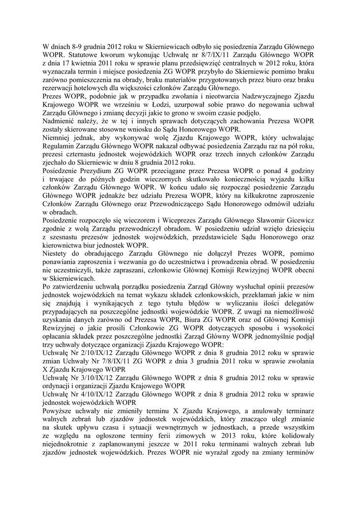W dniach 8-9 grudnia 2012 roku w Skierniewicach odbyło się posiedzenia Zarządu Głównego WOPR. Statutowe kworum wykonując Uchwałę nr 8/7/IX/11 Zarządu Głównego WOPR z dnia 17 kwietnia 2011 roku w sprawie planu przedsięwzięć centralnych w 2012 roku, która wyznaczała termin i miejsce posiedzenia ZG WOPR przybyło do Skierniewic pomimo braku zarówno pomieszczenia na obrady, braku materiałów przygotowanych przez biuro oraz braku rezerwacji hotelowych dla większości członków Zarządu Głównego. Prezes WOPR, podobnie jak w przypadku zwołania i nieotwarcia Nadzwyczajnego Zjazdu Krajowego WOPR we wrześniu w Łodzi, uzurpował sobie prawo do negowania uchwał Zarządu Głównego i zmianę decyzji jakie to grono w swoim czasie podjęło. Nadmienić należy, że w tej i innych sprawach dotyczących zachowania Prezesa WOPR zostały skierowane stosowne wniosku do Sądu Honorowego WOPR. Niemniej jednak, aby wykonywać wolę Zjazdu Krajowego WOPR, który uchwalając Regulamin Zarządu Głównego WOPR nakazał odbywać posiedzenia Zarządu raz na pół roku, prezesi czternastu jednostek wojewódzkich WOPR oraz trzech innych członków Zarządu zjechało do Skierniewic w dniu 8 grudnia 2012 roku. Posiedzenie Prezydium ZG WOPR przeciągane przez Prezesa WOPR o ponad 4 godziny i trwające do późnych godzin wieczornych skutkowało koniecznością wyjazdu kilku członków Zarządu Głównego WOPR. W końcu udało się rozpocząć posiedzenie Zarządu Głównego WOPR jednakże bez udziału Prezesa WOPR, który na kilkukrotne zaproszenie Członków Zarządu Głównego oraz Przewodniczącego Sądu Honorowego odmówił udziału w obradach. Posiedzenie rozpoczęło się wieczorem i Wiceprezes Zarządu Głównego Sławomir Gicewicz zgodnie z wolą Zarządu przewodniczył obradom. W posiedzeniu udział wzięło dziesięciu z szesnastu prezesów jednostek wojewódzkich, przedstawiciele Sądu Honorowego oraz kierownictwa biur jednostek WOPR. Niestety do obradującego Zarządu Głównego nie dołączył Prezes WOPR, pomimo ponawiania zaproszenia i wezwania go do uczestnictwa i prowadzenia obrad. W posiedzeniu nie uczestniczyli, także zapraszani, członkowie Głównej Komisji Rewizyjnej WOPR obecni w Skierniewicach. Po zatwierdzeniu uchwałą porządku posiedzenia Zarząd Główny wysłuchał opinii prezesów jednostek wojewódzkich na temat wykazu składek członkowskich, przekłamań jakie w nim się znajdują i wynikających z tego tytułu błędów w wyliczaniu ilości delegatów przypadających na poszczególne jednostki wojewódzkie WOPR. Z uwagi na niemożliwość uzyskania danych zarówno od Prezesa WOPR, Biura ZG WOPR oraz od Głównej Komisji Rewizyjnej o jakie prosili Członkowie ZG WOPR dotyczących sposobu i wysokości opłacania składek przez poszczególne jednostki Zarząd Główny WOPR jednomyślnie podjął trzy uchwały dotyczące organizacji Zjazdu Krajowego WOPR: Uchwałę Nr 2/10/IX/12 Zarządu Głównego WOPR z dnia 8 grudnia 2012 roku w sprawie zmian Uchwały Nr 7/8/IX/11 ZG WOPR z dnia 3 grudnia 2011 roku w sprawie zwołania X Zjazdu Krajowego WOPR Uchwałę Nr 3/10/IX/12 Zarządu Głównego WOPR z dnia 8 grudnia 2012 roku w sprawie ordynacji i organizacji Zjazdu Krajowego WOPR Uchwałę Nr 4/10/IX/12 Zarządu Głównego WOPR z dnia 8 grudnia 2012 roku w sprawie jednostek wojewódzkich WOPR Powyższe uchwały nie zmieniły terminu X Zjazdu Krajowego, a anulowały terminarz walnych zebrań lub zjazdów jednostek wojewódzkich, który znacząco uległ zmianie na skutek upływu czasu i sytuacji wewnętrznych w jednostkach, a przede wszystkim ze względu na ogłoszone terminy ferii zimowych w 2013 roku, które kolidowały niejednokrotnie z zaplanowanymi jeszcze w 2011 roku terminami walnych zebrań lub zjazdów jednostek wojewódzkich. Prezes WOPR nie wyrażał zgody na zmiany terminów zjazdów wojewódzkich i w związku z tym Zarząd Główny uznał, że graniczną datą przekazania imiennych wykazów i kart delegatów na X Zjazd Krajowy WOPR jest 5 marca 2013 roku co pozwala jednostkom samodzielnie decydować o terminach zjazdów. Ponadto Zarząd Główny zatwierdził projekt porządku obrad i regulaminu Zjazdu Krajowego oraz ustalił że z każdej jednostki wojewódzkiej zostanie wybranych sześciu delegatów na X Zjazd Krajowy WOPR. Dodatkowo, aby wyeliminować nieprawdziwe informacje jakich udziela biuro Zarządu Głównego WOPR bez wiedzy i woli Zarządu, podjęta została uchwała normująca status podmiotów jako jednostki wojewódzkie WOPR wymieniając ich nazwy oraz numery nadane przez KRS. Zapis ten był niezbędny przy ustalaniu który podmiot ma prawo do wyłaniania delegatów na zjazd oraz interpretacji zapisów ustawy o bezpieczeństwie osób przebywających na obszarach wodnych. Wszystkie uchwały zostały przyjęte jednomyślnie. Ponadto Zarząd Główny podjął Uchwałę Nr 5/10/IX/12 Zarządu Głównego WOPR z dnia 8 grudnia 2012 roku w sprawie uchwał i decyzji, która uchyliła Decyzję 6/12 Prezesa WOPR z dnia 8 września 2012 roku w sprawie programu szkolenia ratowników wodnych w zakresie ratownictwa wodnego oraz część Uchwały Nr 5/6/09 Prezydium Zarządu Głównego WOPR z dnia 5 grudnia 2009 roku w sprawie stopni ratowników i instruktorów WOPR. Zarząd Główny WOPR w oparciu o podjętą regulaminowo Uchwałę Nr 7/9N-K/IX/12 Zarządu Głównego WOPR z dnia 9 sierpnia 2012 roku w sprawie szkoleń w ratownictwie wodnym uznał, że wprowadzenie przez Prezesa WOPR programów szkolenia stoi w sprzeczności z wolą Zarządu Głównego, który wcześniej upoważnił prezesów jednostek wojewódzkich do podejmowania działań w tym zakresie. Ponadto w opinii Zarządu Głównego WOPR programy te stoją w sprzeczności z zapisami ustawy i rozporządzeń. Jednocześnie Zarząd Główny uchylił zapisy przypisujące stopniom ratowniczym (młodszy ratownik WOPR, ratownik WOPR, ratownik wodny i starszy ratownik wodny) uprawnienia. Wodne Ochotnicze Pog