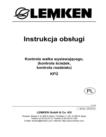 Instrukcja obs ugi Kontrola wa ka wysiewaj cego, (kontrola cie ek, kontrola rozdzia u) KFÜ 3 /10.04 Nr art.: 175 3712 LEMKEN GmbH & Co. KG Weseler Straße 5, D-46519 Alpen / Postfach 11 60, D-46515 Alpen Telefon (0 28 02) 81-0, Telefax (0 28 02) 81-220 E-Mail: [email protected], Internet: http://www.lemken.com STOSOWANIE ZGODNE Z PRZEZNACZENIEM • Przed uruchomieniem nale y zapozna si z instrukcj obs ugi i wskazówkami dotycz cymi bezpiecze stwa! • Siewnik rz dowy Solitair z kontrol wa ka wysiewaj cego KFÜ zosta skonstruowany wy cznie do standardowego zastosowania przy pracach polowych (u ytkowanie zgodne z przeznaczeniem)! Ka de wychodz ce poza ten zakres u ycie uznaje si za niezgodne z przeznaczeniem! Producent nie odpowiada za powsta e w wyniku tego szkody; ryzyko ponosi wy cznie u ytkownik! Do zgodnego z przeznaczeniem stosowania nale y równie dotrzymywanie wymaganych przez producenta warunków pracy, konserwacji i napraw! • Siewnik rz dowy Solitair z kontrol wa ka wysiewaj cego KFÜ mo e by ytkowany, serwisowany i naprawiany wy cznie przez osoby, które posiadaj odpowiedni wiedz oraz s poinstruowane o niebezpiecze stwach! • Nale y przestrzega odpowiednich przepisów dotycz cych zapobiegania wypadkom oraz pozosta ych powszechnie uznanych zasad techniki bezpiecze stwa, medycyny pracy i kodeksu drogowego! • Dokonywane w asnor cznie zmiany konstrukcyjne maszyny wykluczaj odpowiedzialno producenta za wynikaj ce st d szkody! SPIS TRE CI 1. Informacje ogólne ....................................................................................2 2. Budowa kontroli wa ków wysiewaj cych..................................................2 3. Dzia anie kontroli wa ków wysiewaj cych ................................................4 4. Kontrola cie ek roboczych .....................................................................5 5. Przerwanie pracy bez podnoszenia siewnika ..........................................6 6. Mo liwe komunikaty o b dach systemowych na wy wietlaczu...............7 7. Pod czanie czujnika do skrzynki zbiorczej .............................................9 1 1. Informacje ogólne Za pomoc kontroli wa ka wysiewaj cego mo na kontrolowa pojedyncze wa ki wysiewaj ce (1) pod k tem przepustowo ci ziaren. Mo liwe s cztery mo liwo ci kontroli. Kontrola wszystkich wa ków wysiewaj cych = kontrola wa ków wysiewaj cych, Kontrola wa ka wysiewaj cego na rozdzielacz = kontrola rozdzielacza Kontrola wszystkich wa ków wysiewaj cych cie ek = kontrola cie ek i Kontrola wszystkich wa ków wysiewaj cych cie ek i samego rozdzielacza = kontrola rozdzielacza przy kontroli cie ek. 2. Budowa kontroli wa ków wysiewaj cych Na ka dy wa ek wysiewaj cy (1) wymagany jest jeden czujnik przep ywu, który jest pod czony swoim kablem (3) do skrzynki czujników (4). cznie istnieje mo liwo pod czenia do skrzynki czujników dwunastu czujników przep ywu. Je li istnieje ponad dwana cie czujników przep ywowych (2), nale y przewidzie kolejn skrzynk czujników (4) lub kilka skrzynek, które s po czone kablem po czeniowym z pierwsz skrzynk czujników i ze sob . Skrzynka czujników (4) lub w razie kilku skrzynek czujników (4) pierwsza skrzynka jest czona kablem po czeniowym ze skrzynk wska ników (6). Sama skrzynka wska ników jest pod czana kablem przy czeniowym do gniazda zgodnie z DIN 9680 do napi cia zasilaj cego 12 V. Skrzynka czujników (4) lub ostatnia skrzynka czujników jest po czona wtyczk przy czeniow (5) za pomoc kabla czujnikowego z dodatkowym czujnikiem urz dzenia (11), który wy cza system, gdy siewnik jest podnoszony i ponownie w czany, gdy siewnik jest opuszczany do nast pnego przejazdu. 2 3 3. Dzia anie kontroli wa ków wysiewaj cych Kontrola wa ków wysiewaj cych jest w czana prze cznikiem wychylnym (11). Rozpoczyna si krótki automatyczny test systemu. Wskazywane b po kolei krótko „8.8.”, wersja oprogramowania np. 1.06 oraz ilo rozpoznanych, pod czonych czujników przep ywowych, np. 9. Nast pnie system kontroli jest gotowy do pracy. Na wy wietlaczu (7) pojawiaj si dwie poziome kreski, które przesuwaj si stopniowo w gór . Je li podczas pracy podczas przejazdu nast pi b d, rozbrzmiewa sygna wi kowy. Dodatkowo na wy wietlaczu wskazywany jest b d: a) W razie b du w wa ku wysiewaj cym ð Wskazanie numeru wa ka wysiewaj cego, w którym wyst pi b d. Je li pojawi si np. 3, b d wyst pi – licz c w kierunku jazdy od lewej - w 3 wa ku wysiewaj cym, który jest wyposa ony w czujnik przep ywowy (2). b) W razie b dów w kilku wa kach wysiewaj cych ð Wskazanie ilo ci b dów (migaj ce) i nast pnie numer pierwszego wa ka wysiewaj cego – licz c w kierunku jazdy od lewej, który ma d. Krótkim wci ni ciem przycisku (8) wskazywany jest numer nast pnego wa ka wysiewaj cego, w którym wyst pi b d. Wci ni ciem przycisku (8) b d jest potwierdzany a wskazanie znika z wy wietlacza. Po wci ni ciu przycisku (8) przez 2 sekundy nast pi wy czenie alarmu, potwierdzenie wszystkich b dów (potwierdzenie zbiorcze) i ich wskaza . Uwaga! 4 Wa ki wysiewaj ce, w których potwierdzony zosta b d i usuni to wskazanie b du, nie s dalej kontrolowane. Dopiero wtedy, gdy potwierdzony zostanie dodatkowy czujnik urz dzenia, te wa ki wysiewaj ce s ponownie kontrolowane. Dodatkowy czujnik urz dzenie jest uruchamiany wtedy, gdy siewnik lub szyna wysiewaj ce s podniesione np. na ko cu pola i nast pnie opuszczane. 4. Kontrola cie ek roboczych Wa ki wysiewaj ce, które zosta y wy czone do definiowania cie ek, b wskazywane po opuszczeniu urz dzenia dla nast pnego przejazdu jako dne, poniewa nie przechodzi o przez nie ziarno. Je li przed podniesieniem siewnika nie zosta y wskazane b dy i na wy wietlaczu pojawi a si dok adna ilo wa ków wysiewaj cych, które s wy czane do zdefiniowania cie ek, nale y przyj , e wszystkie cie ki zosta y poprawnie w czone i b d nie wyst pi . Zaleca si tutaj potwierdzenie zbiorcze. W tym celu nale y przez co najmniej 2 sekundy przytrzyma wci ni ty przycisk (8), aby potwierdzi komunikaty i wyk