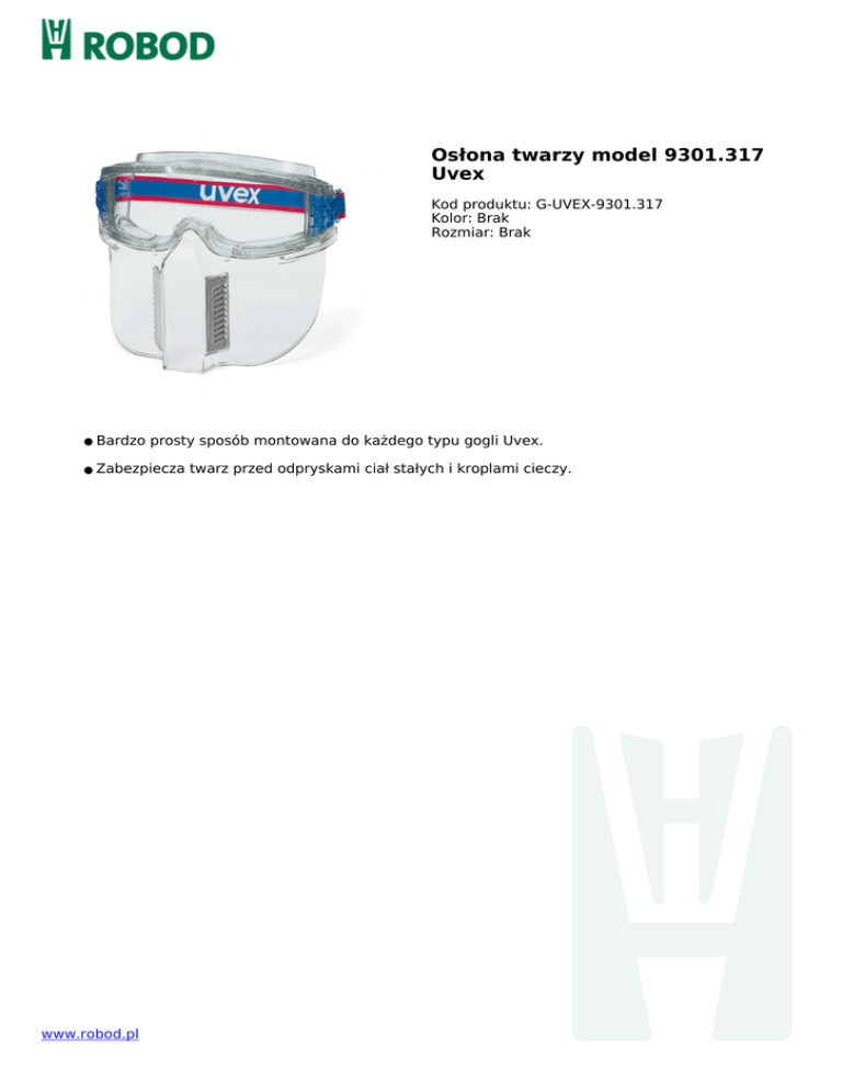 Osłona twarzy model 9301.317 Uvex Kod produktu: G-UVEX-9301.317 Kolor: Brak Rozmiar: Brak ● Bardzo prosty sposób montowana do każdego typu gogli Uvex. ● Zabezpiecza twarz przed odpryskami ciał stałych i kroplami cieczy. www.robod.pl