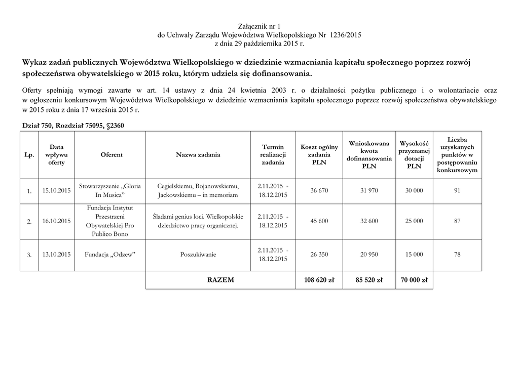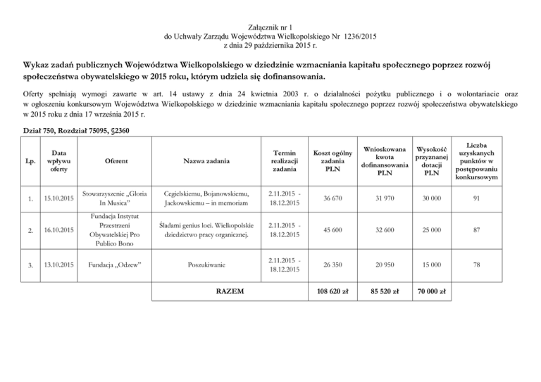 Załącznik nr 1 do Uchwały Zarządu Województwa Wielkopolskiego Nr 1236/2015 z dnia 29 października 2015 r. Wykaz zadań publicznych Województwa Wielkopolskiego w dziedzinie wzmacniania kapitału społecznego poprzez rozwój społeczeństwa obywatelskiego w 2015 roku, którym udziela się dofinansowania. Oferty spełniają wymogi zawarte w art. 14 ustawy z dnia 24 kwietnia 2003 r. o działalności pożytku publicznego i o wolontariacie oraz w ogłoszeniu konkursowym Województwa Wielkopolskiego w dziedzinie wzmacniania kapitału społecznego poprzez rozwój społeczeństwa obywatelskiego w 2015 roku z dnia 17 września 2015 r. Dział 750, Rozdział 75095, §2360 Lp. Data wpływu oferty Oferent 1. 15.10.2015 2. 3. Wnioskowana Wysokość kwota przyznanej dofinansowania dotacji PLN PLN Liczba uzyskanych punktów w postępowaniu konkursowym Nazwa zadania Termin realizacji zadania Koszt ogólny zadania PLN Stowarzyszenie „Gloria In Musica” Cegielskiemu, Bojanowskiemu, Jackowskiemu – in memoriam 2.11.2015 18.12.2015 36 670 31 970 30 000 91 16.10.2015 Fundacja Instytut Przestrzeni Obywatelskiej Pro Publico Bono Śladami genius loci. Wielkopolskie dziedzictwo pracy organicznej. 2.11.2015 18.12.2015 45 600 32 600 25 000 87 13.10.2015 Fundacja „Odzew” Poszukiwanie 2.11.2015 18.12.2015 26 350 20 950 15 000 78 108 620 zł 85 520 zł 70 000 zł RAZEM