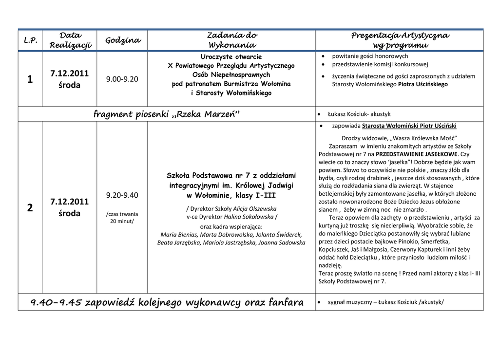 L.P. 1 Data Realizacji 7.12.2011 środa Godzina 9.00-9.20 Zadania do Wykonania Prezentacja Artystyczna wg programu Uroczyste otwarcie X Powiatowego Przeglądu Artystycznego Osób Niepełnosprawnych pod patronatem Burmistrza Wołomina i Starosty Wołomińskiego fragment piosenki „Rzeka Marzeń” powitanie gości honorowych przedstawienie komisji konkursowej życzenia świąteczne od gości zaproszonych z udziałem Starosty Wołomioskiego Piotra Uścioskiego 2 7.12.2011 środa 9.20-9.40 /czas trwania 20 minut/ Szkoła Podstawowa nr 7 z oddziałami integracyjnymi im. Królowej Jadwigi w Wołominie, klasy I-III / Dyrektor Szkoły Alicja Olszewska v-ce Dyrektor Halina Sokołowska / oraz kadra wspierająca: Maria Bienias, Marta Dobrowolska, Jolanta Świderek, Beata Jarzębska, Mariola Jastrzębska, Joanna Sadowska 9.40-9.45 zapowiedź kolejnego wykonawcy oraz fanfara Łukasz Kościuk- akustyk zapowiada Starosta Wołomioski Piotr Uścioski Drodzy widzowie, „Wasza Królewska Mośd” Zapraszam w imieniu znakomitych artystów ze Szkoły Podstawowej nr 7 na PRZEDSTAWIENIE JASEŁKOWE. Czy wiecie co to znaczy słowo ‘jasełka”! Dobrze będzie jak wam powiem. Słowo to oczywiście nie polskie , znaczy żłób dla bydła, czyli rodzaj drabinek , jeszcze dziś stosowanych , które służą do rozkładania siana dla zwierząt. W stajence betlejemskiej były zamontowane jasełka, w których złożone zostało nowonarodzone Boże Dziecko Jezus obłożone sianem , żeby w zimną noc nie zmarzło . Teraz opowiem dla zachęty o przedstawieniu , artyści za kurtyną już troszkę się niecierpliwią. Wyobraźcie sobie, że do maleokiego Dzieciątka postanowiły się wybrad lubiane przez dzieci postacie bajkowe Pinokio, Smerfetka, Kopciuszek, Jaś i Małgosia, Czerwony Kapturek i inni żeby oddad hołd Dzieciątku , które przyniosło ludziom miłośd i nadzieję. Teraz proszę światło na scenę ! Przed nami aktorzy z klas I- III Szkoły Podstawowej nr 7. sygnał muzyczny – Łukasz Kościuk /akustyk/ Przedszkole nr 9 z oddziałami integracyjnymi im. Jasia i Małgosi w Wołominie 3 7.12.2011 środa 9.45-10.05 /czas trwania 20 minut/ / Dyrektor Maria Krukowska / oraz kadra wspierająca: Małgorzata Doroszkiewicz, Monika Michlewicz, Katarzyna Żek 10.05-10.10 zapowiedź kolejnego wykonawcy oraz fanfara Szkoła Podstawowa nr 3 im. Janusza Korczaka w Zielonce 10.10-10.25 4 7.12.2011 środa /Dyrektor Joanna Zielenkiewicz / oraz kadra wspierająca: Karolina Ślązak, Małgorzata Matuszak /czas trwania 15minut/ Przedstawienie pt. „KOLĘDOWANIE” 10.25-10.30 zapowiedź kolejnego wykonawcy oraz fanfara zapowiada Naczelnik Wydziału Kultury i Promocji Tadeusz Deszkiewicz W roli aktorów nasi najmniejsi wykonawcy – przedszkolaki. „NAJJAŚNIEJSZE ŚWIATŁO” - To opowieśd o dziejach małego miasteczka, w którym panuje wieczna ciemnośd . Bardzo źle się żyło wszystkim ludziom i zwierzętom. Nie wiedzieli dlaczego tak się stało i jak długo nie świeciło słooce. Jednak pewnego dnia na niebie zajaśniała gwiazda i tutaj Wam podpowiem, że była to „gwiazda betlejemska”, której blask zmienił życie w smutnym miasteczku. Co było dalej zobaczymy! sygnał muzyczny – Łukasz Kościuk /akustyk/ zapowiada Burmistrz Zielonki Grzegorz Dudzik Kiedy zrobi się nam trochę smutno dlatego, że miną Święta Bożego Narodzenia, a po krótkiej przerwie wrócimy do szkoły, proszę żebyście zapamiętali dzisiaj o bardzo radosnym zwyczaju kolędowania w naszym kraju. W Polsce kolędnicy to przebieraocy, którzy chodzili po wsiach od domu do domu z życzeniami pomyślności w Nowym Roku. Teraz mamy rok 2011, zatem następny po świętach to będzie 2012r. Kolędnicy chodzą po kolędzie, śpiewają, taoczą. Bywają tak przebrani, że nawet własna matka , może mied kłopot z ich rozpoznaniem. Takie maszkary i straszydła. Oni też się cieszą z narodzin Jezusa w Betlejem . Dzisiaj, ktoś by powiedział, że jest to teatr na żywo . Resztę zobaczymy w przedstawieniu artystów ze Szkoły Podstawowej Nr 3 w Zielonce. Po ich występie nie zapomnijcie o brawach. sygnał muzyczny – Łukasz Kościuk /akustyk/ 5 7.12.2011 środa 10.30- 10.45 /czas trwania 15 minut/ Niepubliczne Przedszkole „Baśniowa Kraina” w Wołominie / Prezes Ireneusz Stachurski Dyrektor Ewa Stachurska / oraz kadra wspierająca: Katarzyna Kołdraszewska, Kinga Szwarc, 10.45-10.50 zapowiedź kolejnego wykonawcy oraz fanfara Szkoła Podstawowa nr 2 im. Żołnierzy AK II rejonu „Celków” w Markach 6 7.12.2011 środa 10.50-11.05 /czas trwania 15 minut/ /Dyrektor Ewa Lubecka/ oraz kadra wspierająca: Jolanta Mączyoska, Agnieszka Żochowska, Anna Mikołajewska, Monika Załęska aktorzy z klas II-III chór aniołów IV-VI zapowiada Ksiądz Dziekan Sylwester Sienkiewicz Dzieci z „Baśniowej Krainy” w Wołominie zaprezentują się w przedstawieniu „ZACZAROWANY LAS”. Naszym małym, ale bardzo uzdolnionym aktorom pomagały panie wychowawczynie. Największą tremę mają chyba rodzice. Zapewniam Was, że wszystko będzie dobrze. Sukces gwarantowany! W baśniowej krainie jest zaczarowany las w którym miało miejsce pewne wydarzenie- powiem tylko, że była grudniowa, zimna noc. Tego dnia wszyscy ubierają choinki, pamiętają, że w wigilijną noc urodziło się święte Dzieciątko Syn Boży, któremu nadano imię Jezus. Ubieranie choinki to taki zwyczaj, który jednoczy rodziny i wszystkich ludzi. Tam pod drzewkiem w tajemniczy sposób odnajdujemy prezenty. Otóż, w tym zaczarowanym lesie śnieżynki nie mogły znaleźd ładnej choinki. Lamentowały, uskarżały się, że tylko one nie będą się cieszyły w święta. Mają już bombki i ozdoby. A tu nic z tego. Śnieżynki oczywiście mówiły ludzkim głosem. Obudziły swoim płaczem śpiące misie i zające. Zwierzęta zrozumiały jaki kłopot mają śnieżynki i pobiegły na pomoc. Odnalazły w lesie najpiękniejszą choinkę. Więcej już nie opowiem, co było dalej, 