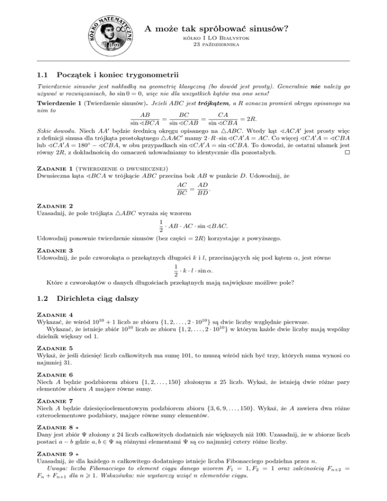 lub ^CA0 A = 180◦ − ^CBA, w obu przypadkach sin ^CA0 A = sin ^CBA. To dowodzi, że ostatni ułamek jest
