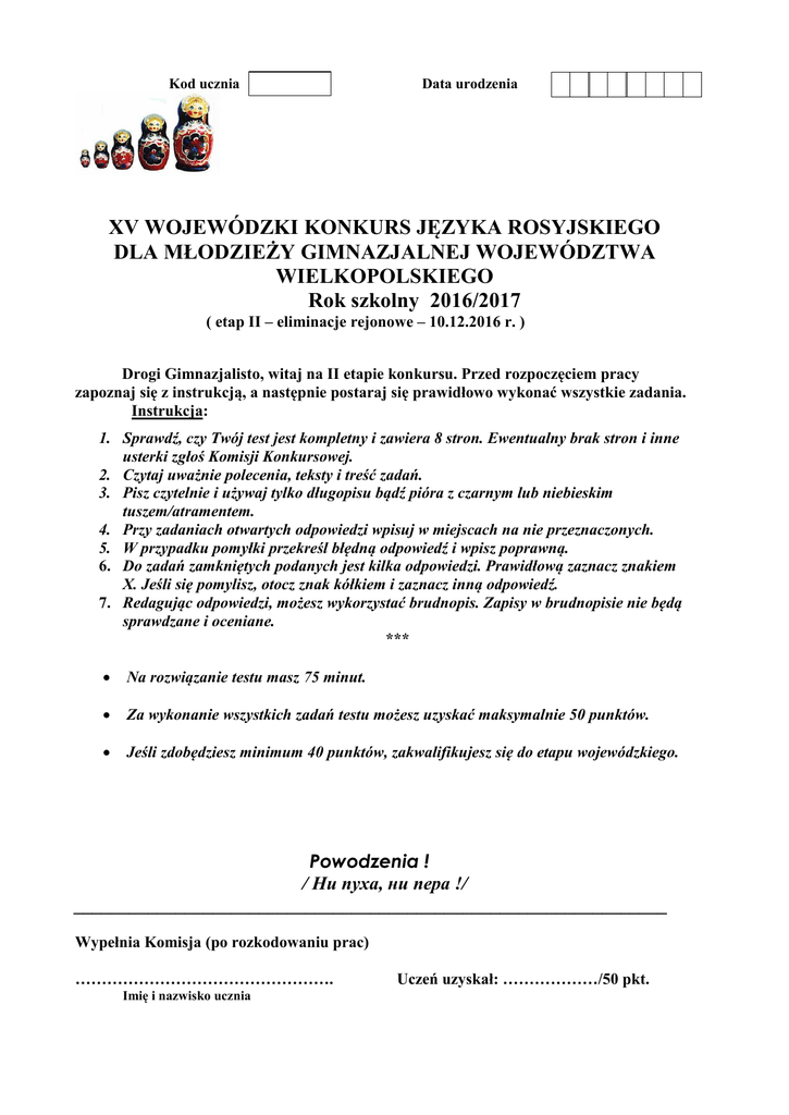 Kod ucznia Data urodzenia XV WOJEWÓDZKI KONKURS JĘZYKA ROSYJSKIEGO DLA MŁODZIEŻY GIMNAZJALNEJ WOJEWÓDZTWA WIELKOPOLSKIEGO Rok szkolny 2016/2017 ( etap II – eliminacje rejonowe – 10.12.2016 r. ) Drogi Gimnazjalisto, witaj na II etapie konkursu. Przed rozpoczęciem pracy zapoznaj się z instrukcją, a następnie postaraj się prawidłowo wykonać wszystkie zadania. Instrukcja: 1. Sprawdź, czy Twój test jest kompletny i zawiera 8 stron. Ewentualny brak stron i inne usterki zgłoś Komisji Konkursowej. 2. Czytaj uważnie polecenia, teksty i treść zadań. 3. Pisz czytelnie i używaj tylko długopisu bądź pióra z czarnym lub niebieskim tuszem/atramentem. 4. Przy zadaniach otwartych odpowiedzi wpisuj w miejscach na nie przeznaczonych. 5. W przypadku pomyłki przekreśl błędną odpowiedź i wpisz poprawną. 6. Do zadań zamkniętych podanych jest kilka odpowiedzi. Prawidłową zaznacz znakiem X. Jeśli się pomylisz, otocz znak kółkiem i zaznacz inną odpowiedź. 7. Redagując odpowiedzi, możesz wykorzystać brudnopis. Zapisy w brudnopisie nie będą sprawdzane i oceniane. *** Na rozwiązanie testu masz 75 minut. Za wykonanie wszystkich zadań testu możesz uzyskać maksymalnie 50 punktów. Jeśli zdobędziesz minimum 40 punktów, zakwalifikujesz się do etapu wojewódzkiego. Powodzenia ! / Ни пуха, ни пера !/ ________________________________________________________________ Wypełnia Komisja (po rozkodowaniu prac) …………………………………………. Imię i nazwisko ucznia Uczeń uzyskał: ………………/50 pkt. XV Wojewódzki Konkurs Języka Rosyjskiego dla uczniów gimnazjum 2016/2017 – eliminacje rejonowe str.2 ________________________________________________________________________________________ I. Przeczytaj uważnie tekst oraz znajdujące się pod nim fragmenty zdań. Dobierz je tak, aby tworzyły logiczne i zgodne z treścią tekstu informacje. Obok zdań oznaczonych cyframi wpisz odpowiednie litery, a po wykonaniu całego zadania rozwiązania przenieś do tabelki. Uwaga! Dwa fragmenty w kolumnie z prawej strony zostały podane dodatkowo i nie pasują do żadnego zdania. Как становятся „моржами” У москвичей Татьяны и Михаила Дубининых росли два сына. Татьяна не отличалась крепким здоровьем. Её одолевали ангины, развивался ревматизм. Она лечилась, но безуспешно. Когда родилась Катя, оказалось, что и девочка болезненная. Михаил считал, что их спасут не лекарства, а физкультура, он уговаривал жену начать закаливание. Татьяна начала с пробежек, хотя они давались ей тяжело. Уже после двухсот метров совсем медленного бега Татьяна начинала задыхаться. Холодной воды она страшно боялась, плавать не умела. Вместе с родителями утром на зарядку выбегали и дети. Самой младшей Кате было тогда пять лет. Занимались Дубинины неподалёку от дома, в старинном парке. Потом решили делать зарядку у озера, до которого было полтора километра. Сперва ходили туда быстрым шагом, затем бегали. Физические упражнения стали для детей ежедневной игрой. Вместе с родителями ребята каждое утро принимали холодный душ, зимой обтирались снегом и бегали раздетыми и босиком. Даже в холодные дни спали они при открытом окне. Летом каждый день в любую погоду купались в озере. И долго присматривались к зимнему плаванию. Первым начал Михаил. На следующий год Татьяна с сыновьями, а ещё через год семилетняя Катя. Купались они недолго, но каждый день. Дети окрепли, мать забыла о болезнях. Теперь Дубининых можно было назвать „моржами”. Они стали членами клуба „Здоровая семья”. Практически все члены клуба (включая и мальшей) купаются в озере. Резумеется, все они находятся под контролем врачей разных специальностей. По материалам журнала „Спутник” 1. В семье Дубининых было 2. Татьяна часто болела 3. Муж Татьяны считал, что она 4. Родители вместе с детьми 5. Утренние зарядки стали для детей 6. Плавать в озере зимой сперва начал 7. В течение двух лет жена и дети 8. О здоровье „моржей” заботятся 1. 2. 3. A. … скучной игрой. B. … тоже стали „моржами”. C. … ежедневной привычкой. D. … трое детей. E. … должна закалять свой организм. F. … врачи - специалисты. G. … выбегали утром на зарядку. H. … воспалением лёгких. I. … Михаил. J. … ангиной и ревматизмом. ..………… ………….. .…………. ......….…... ...………... ..………... ………….